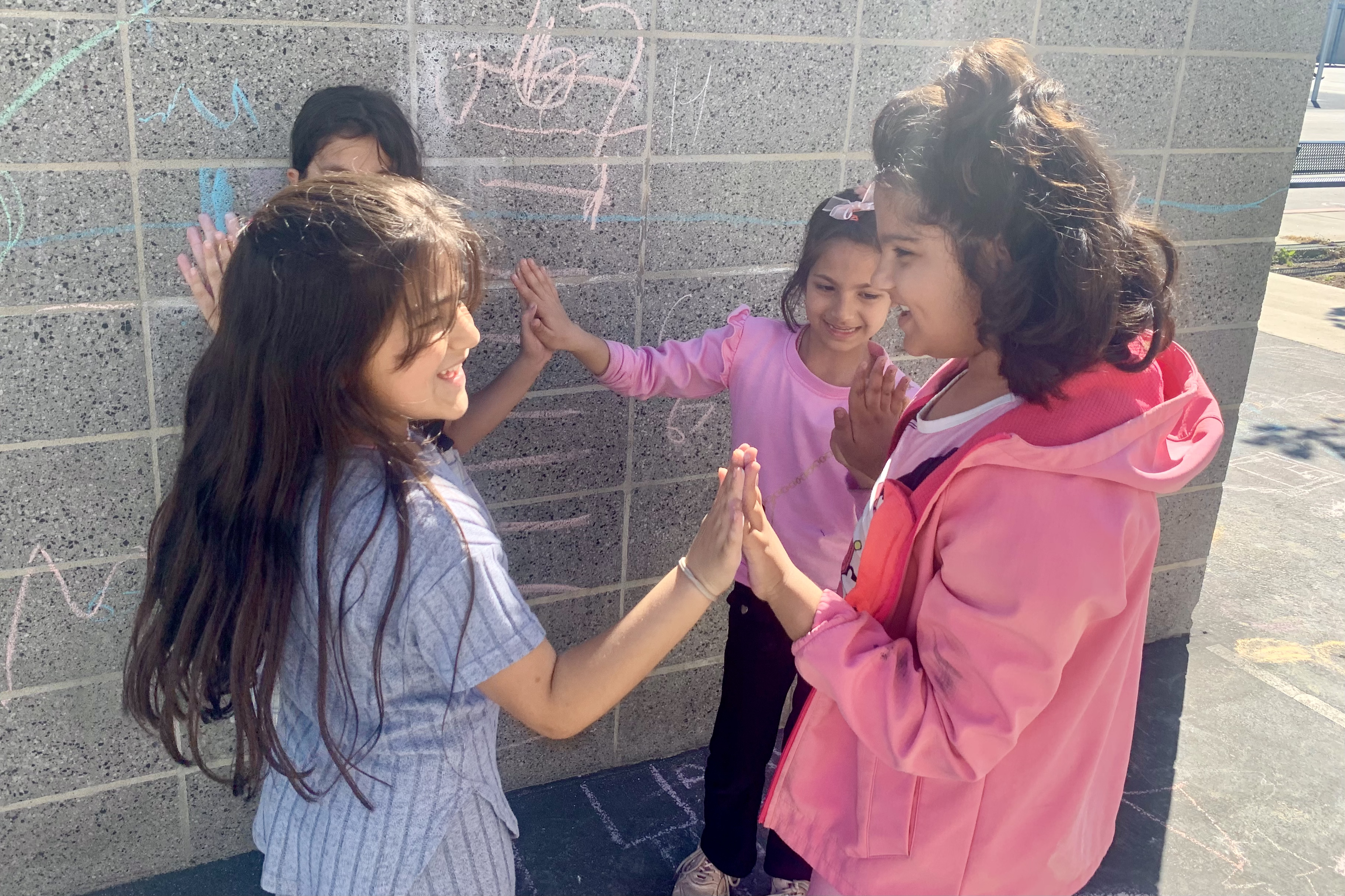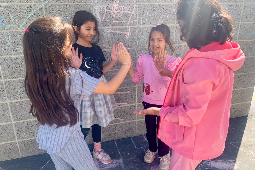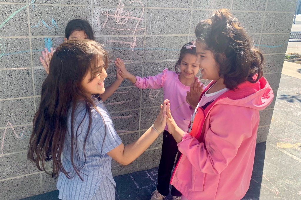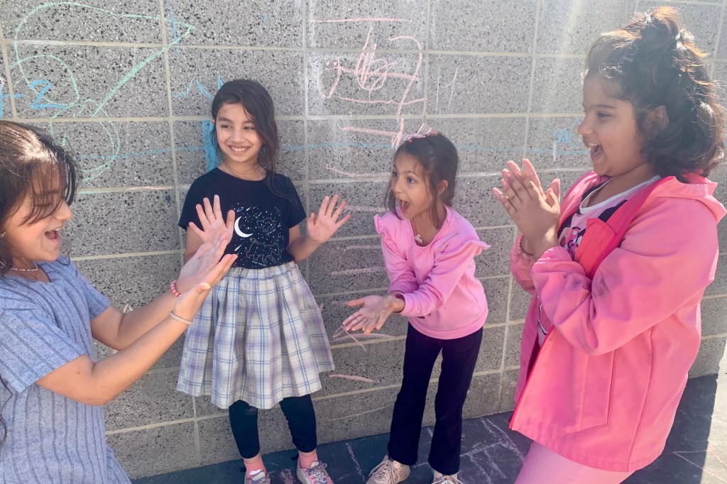 These girls covered their hands in chalk from the street design activity, then sang a song while doing a handclapping routine.