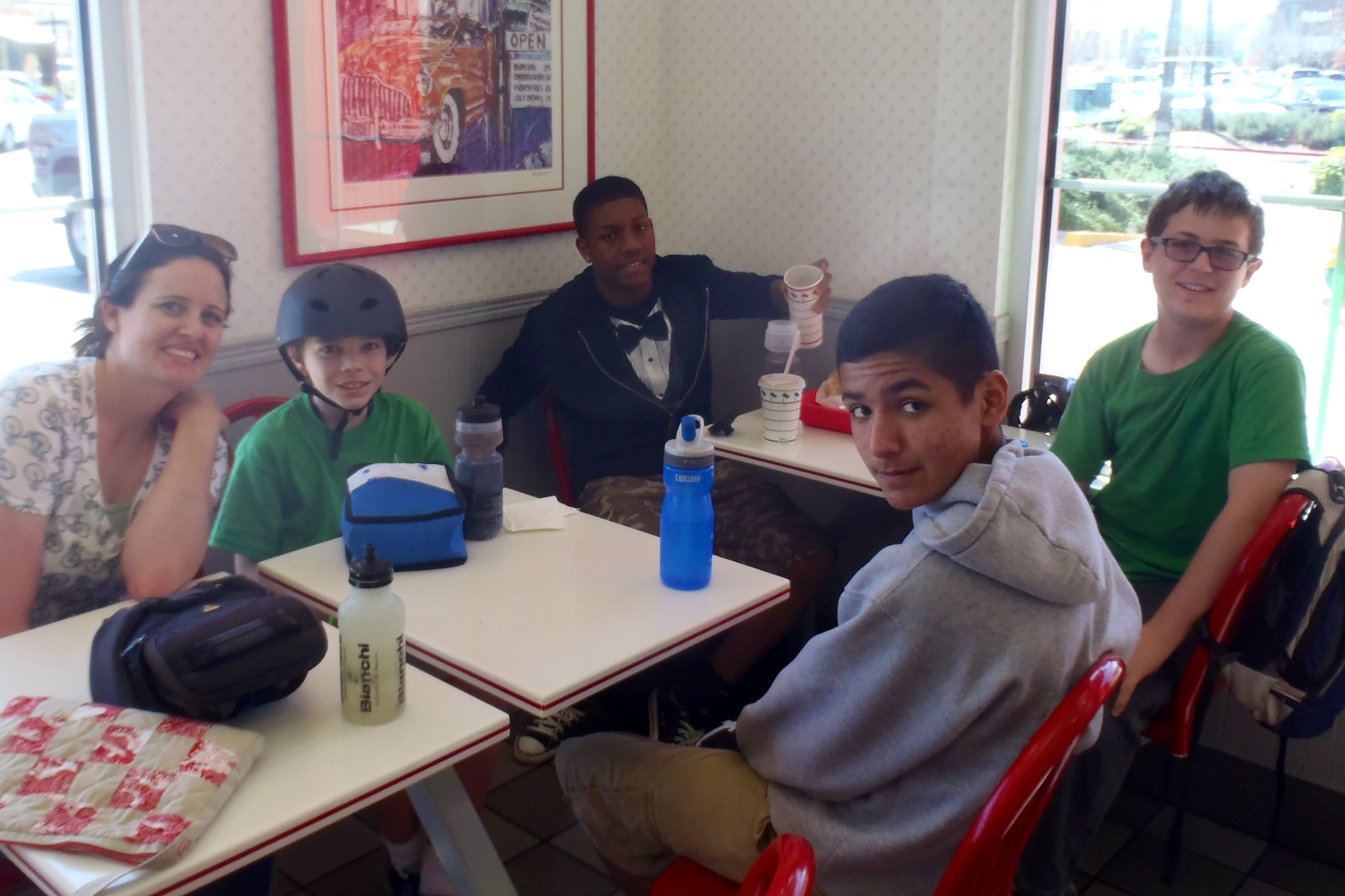 After riding 6 miles, it was time to eat. Since Coach was concerned about riding in the Natomas Marketplace on a busy Saturday afternoon, she lead the group all the around the perimeter to get to In-N-Out.
