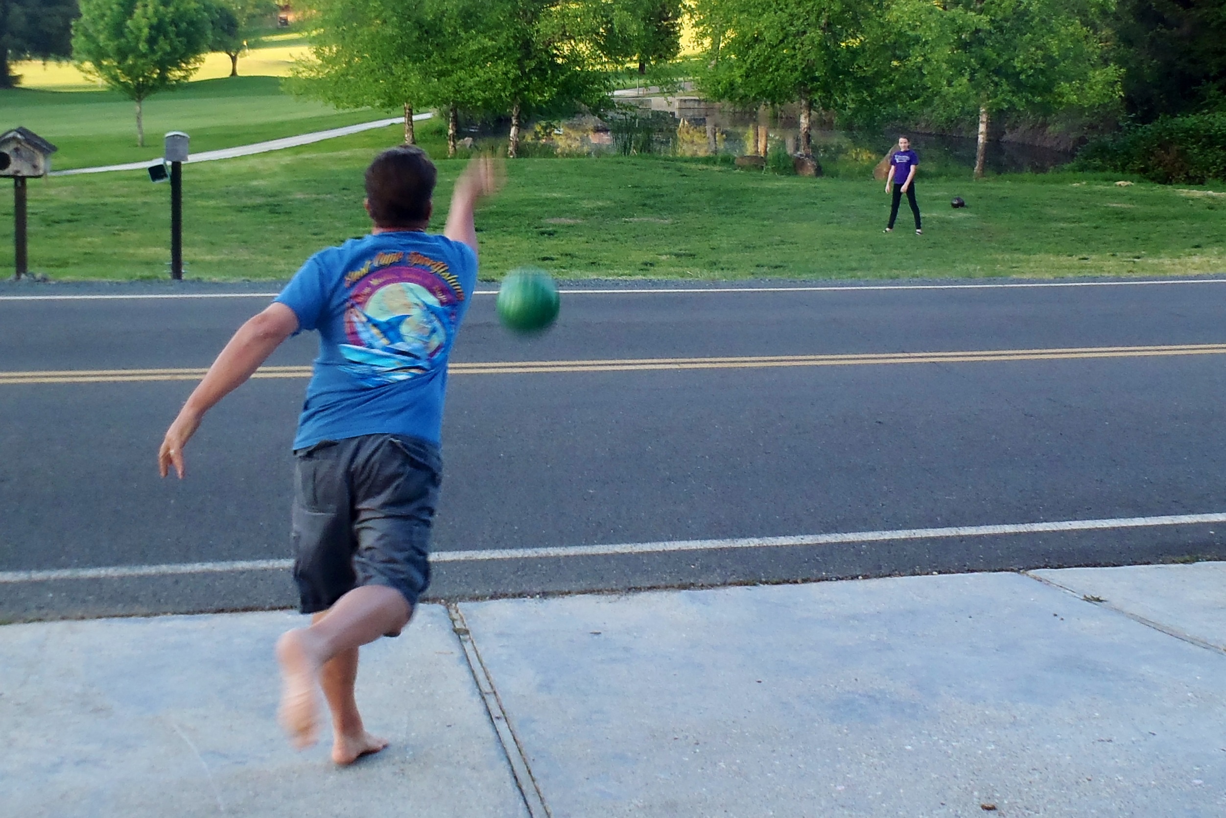 Neighbors and friends donated to the huge piles of stuff for sale. Tim tried to roll the bowling ball into the pond across the street … unsuccessfully.