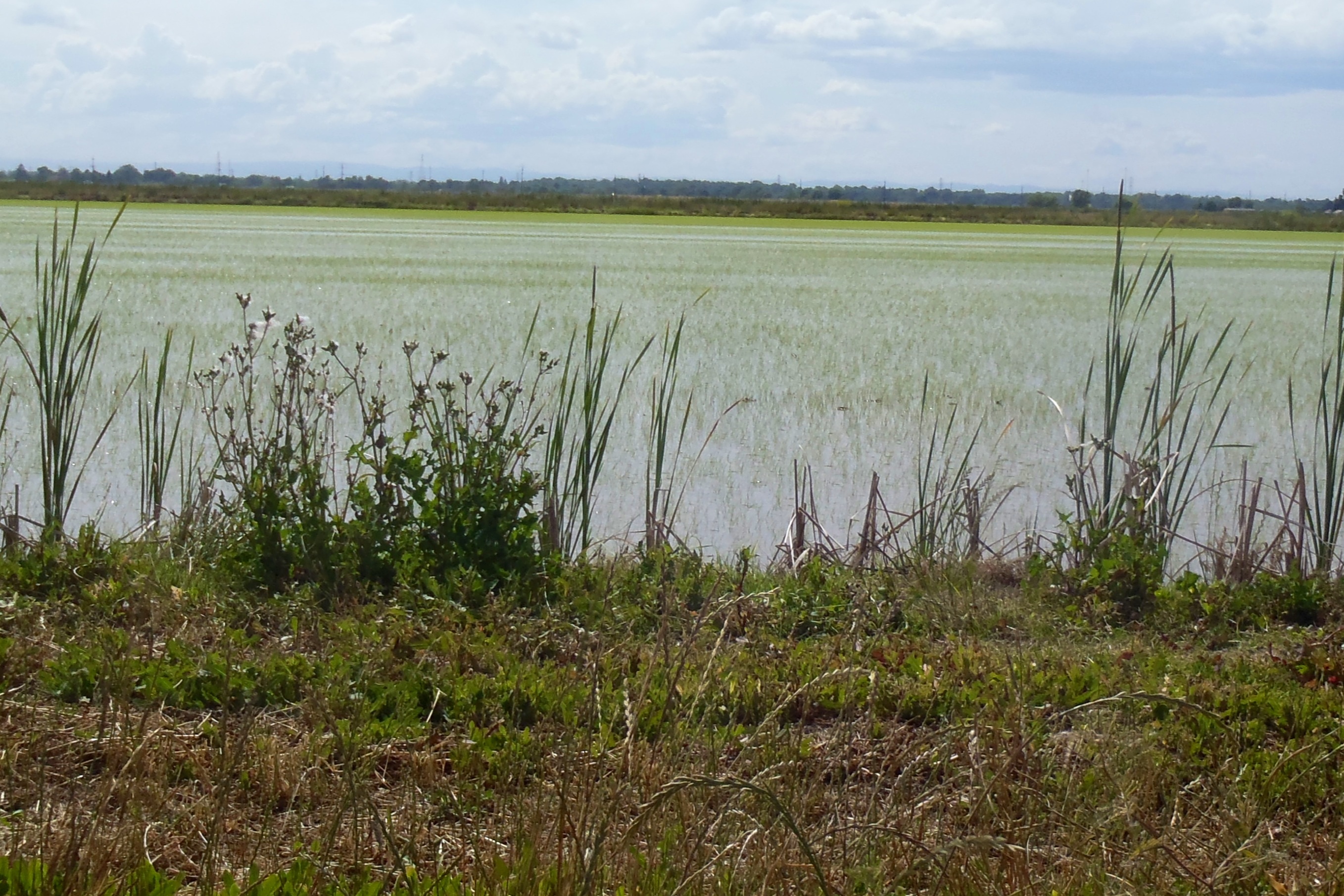 Once seeded, the sprout must reach above the surface within 3 days, so the water isn’t very deep right now, maybe 1-3 inches. As the rice grows, water is added to the field.