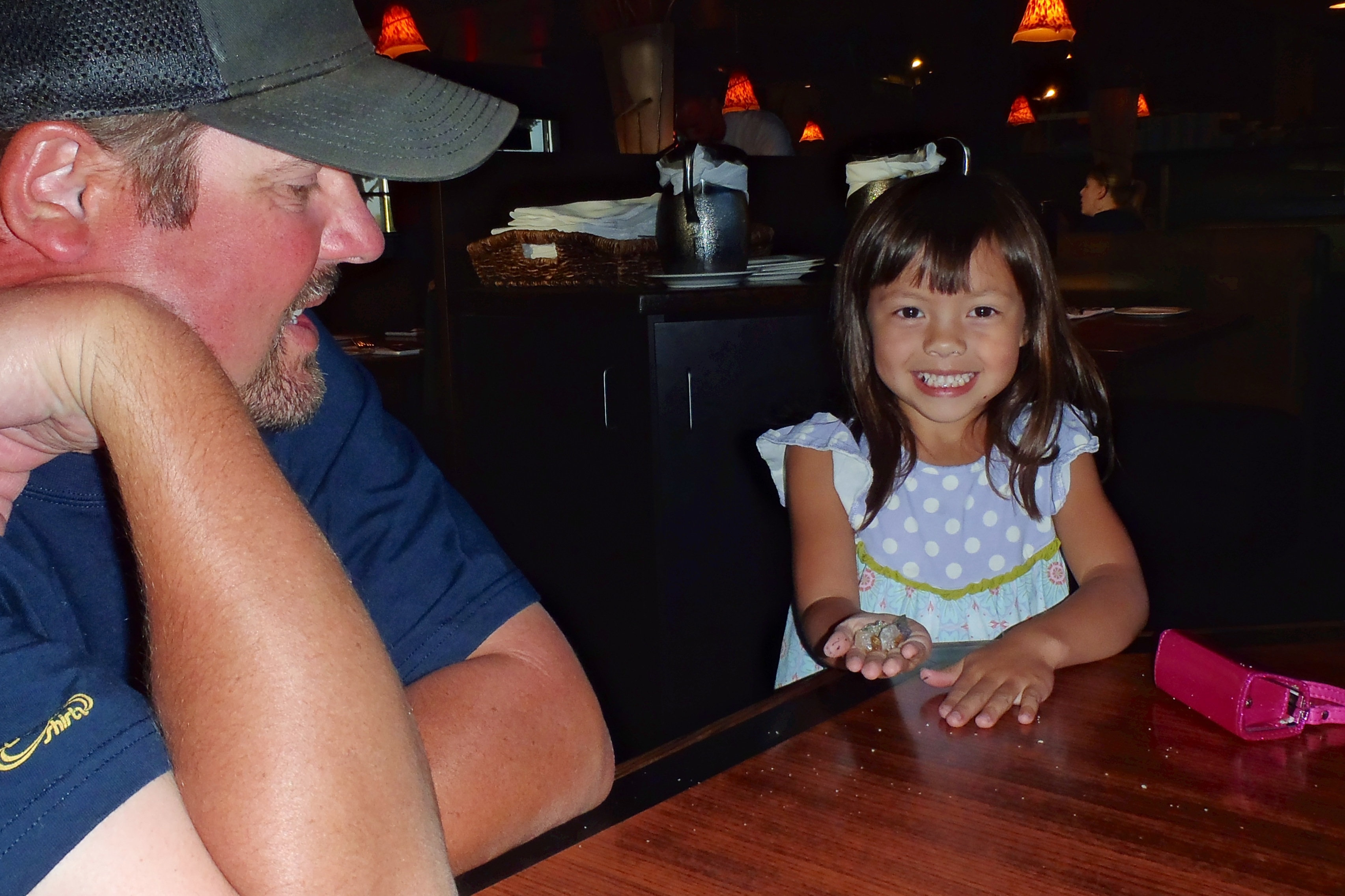 The card was from Jennifer who had to work in Southern California today and couldn’t come to dinner at Malabar. Sophia showed a very interested Uncle Justin her rock collection which she keeps in a small pink purse.