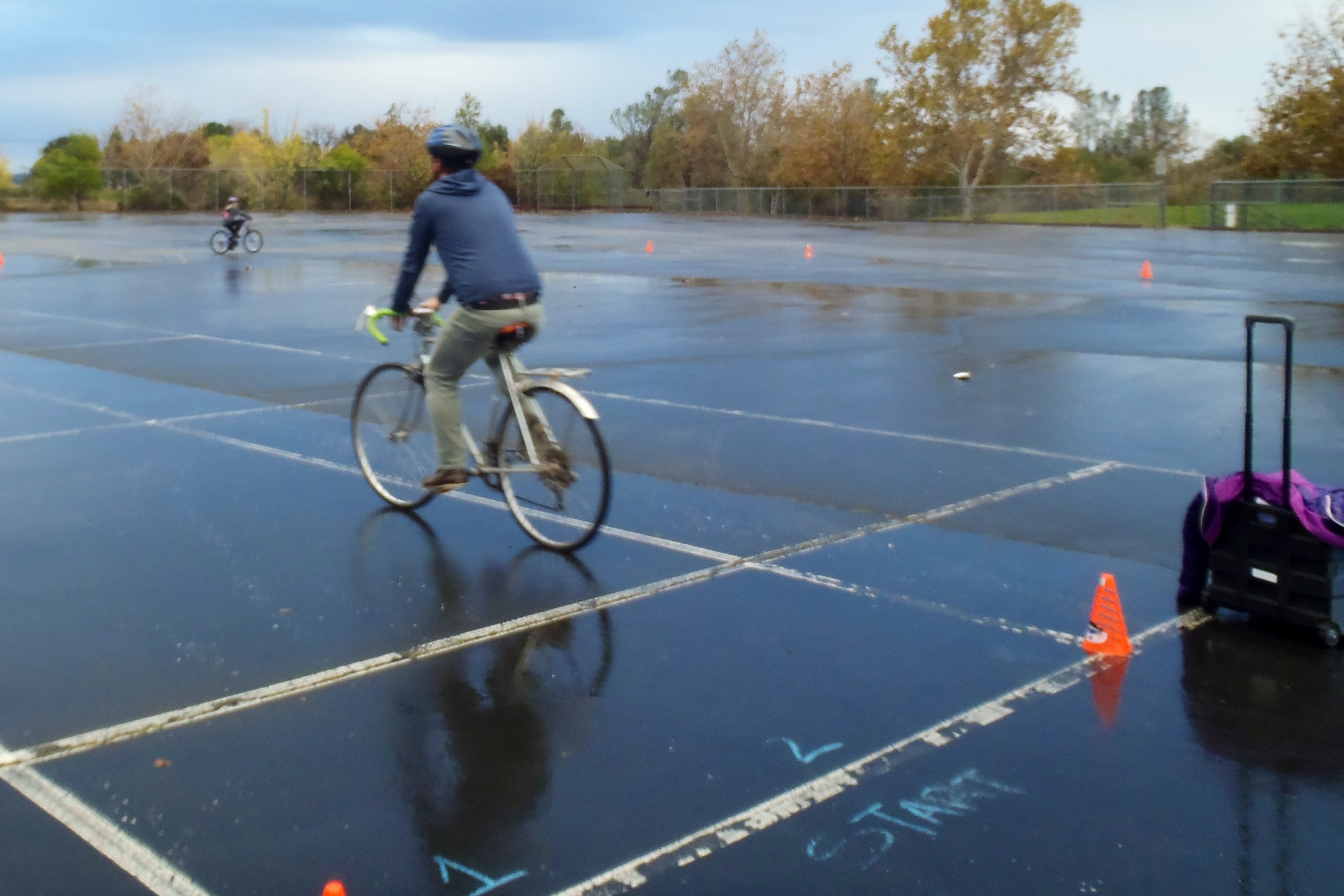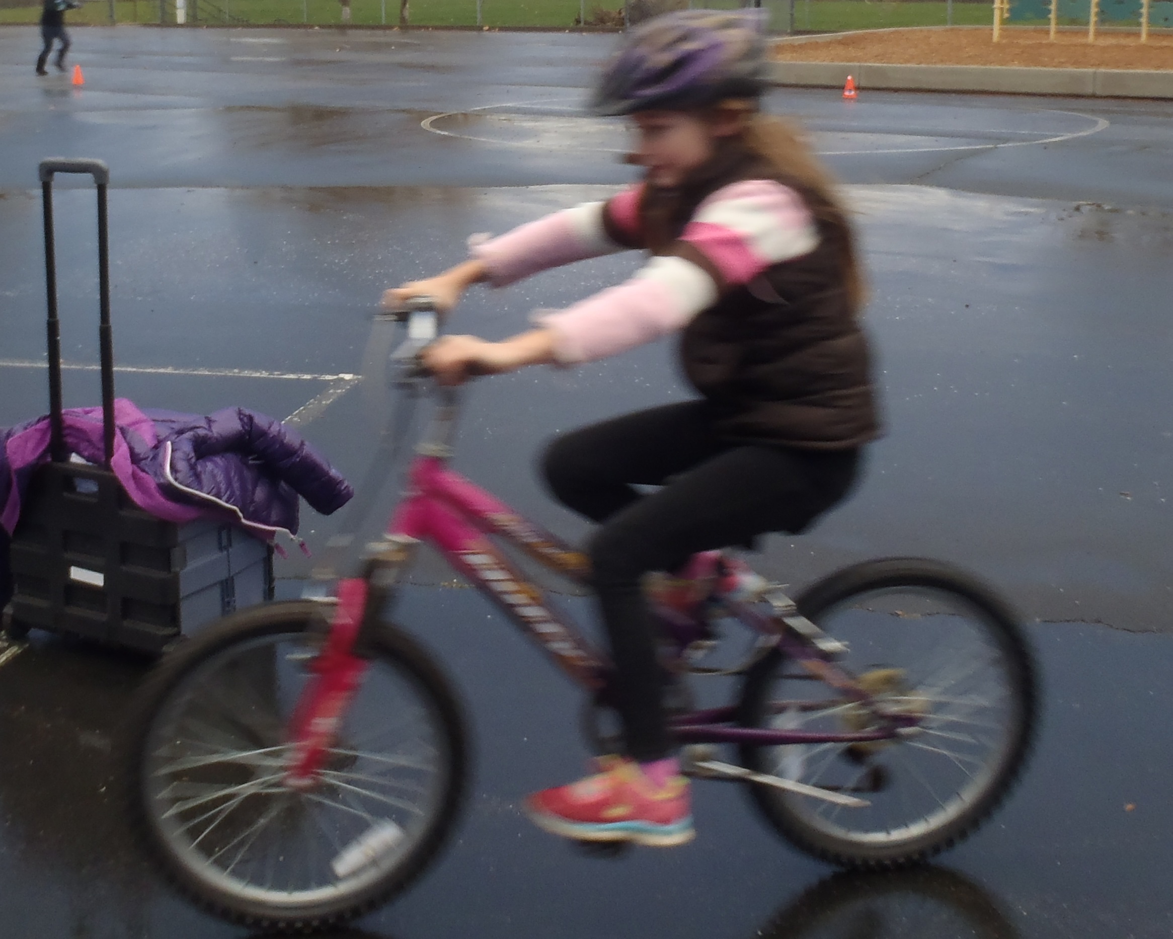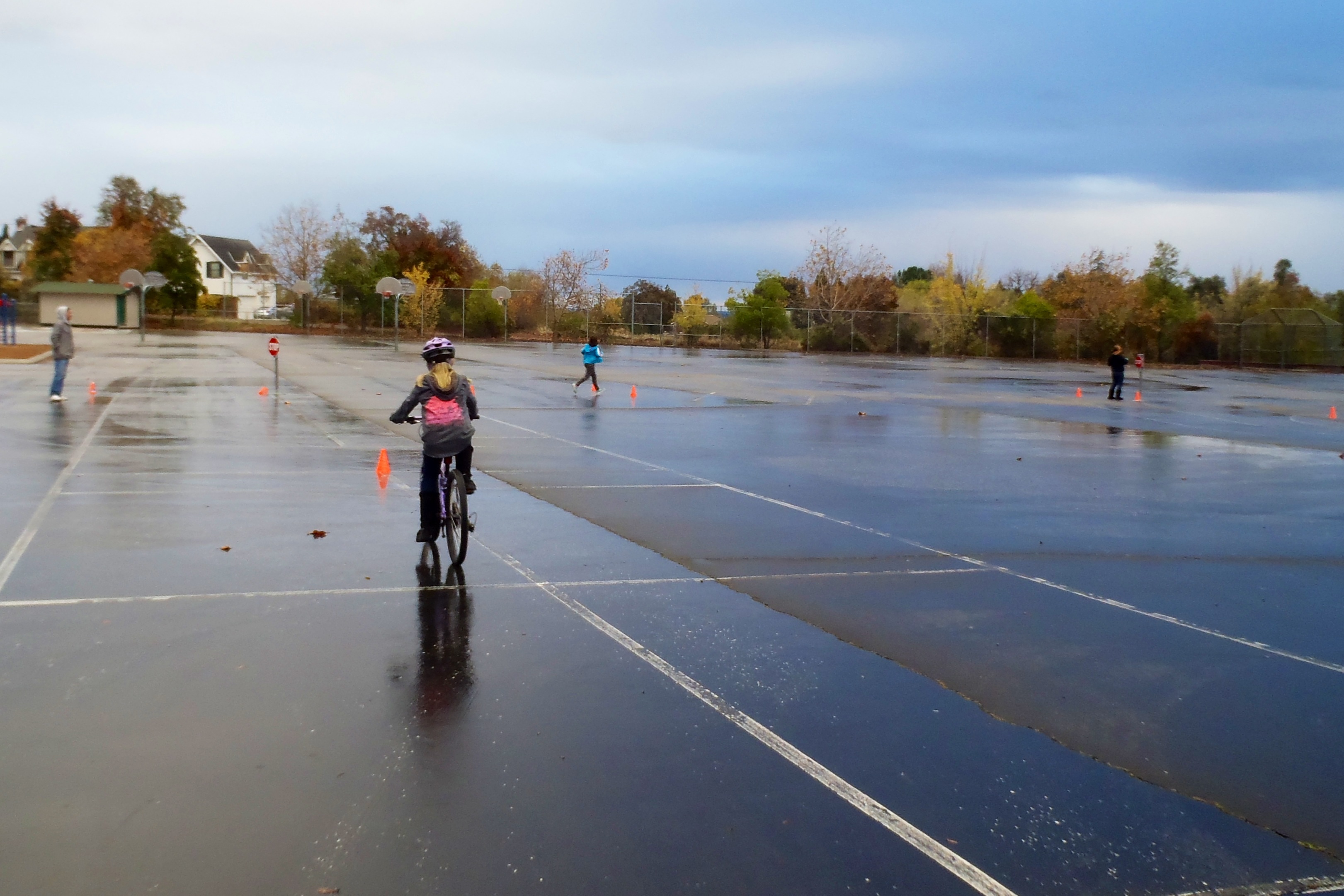 There was some misty rain, but I set up a simple course anyway to practice riding in hazardous conditions and using the stop and right turn hand signals. It had been a minimum day with parent conferences – a challenge for good attendance. Hurray for the four girls who showed up! There were only two bicycles and were generously shared.