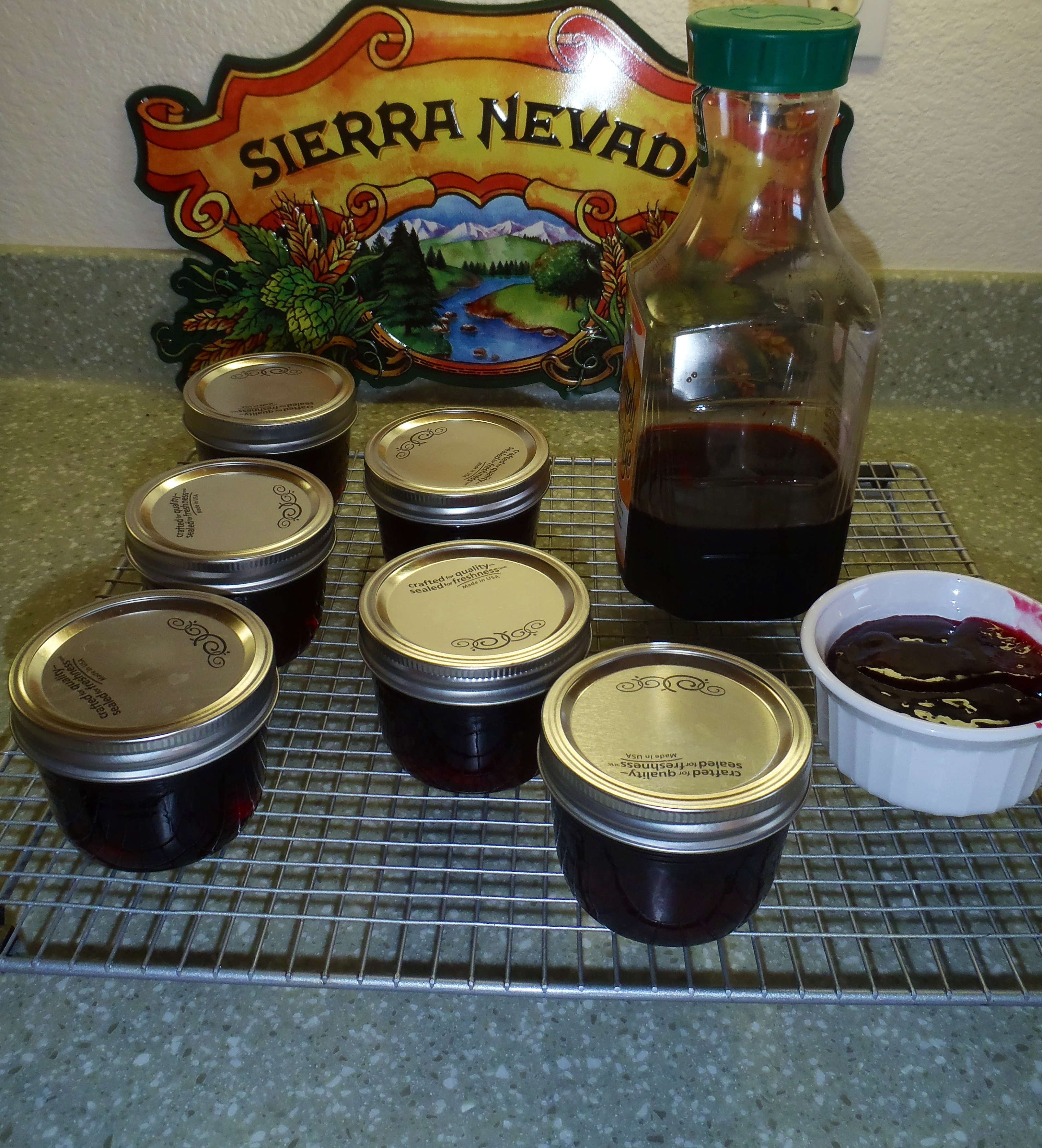 The grand total was 406 ounces from 92 poms which made 72 8-ounce jars of jelly. Thais and I used the juice from Tom and Julie and got 18 jars. With the final two cups of pom juice, I made pomegranate molasses.