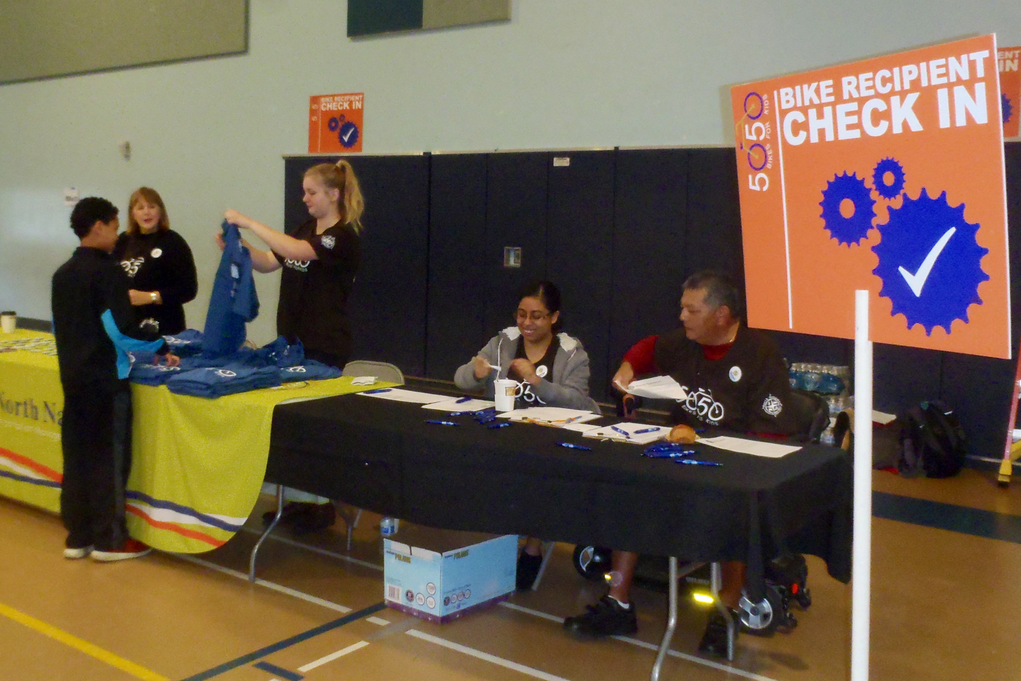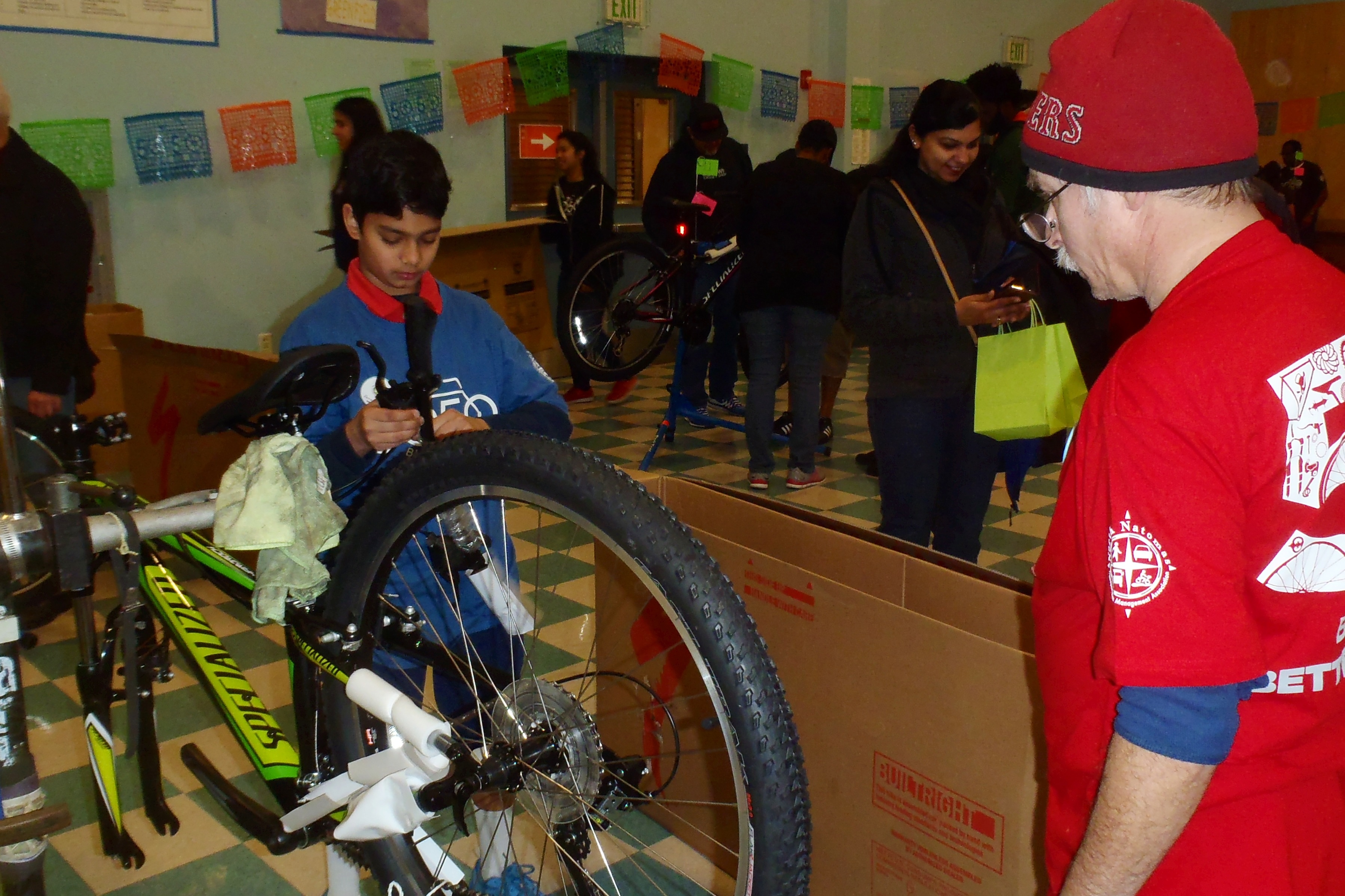 At 10 am (and again at 1 pm), 25 students arrive, check in, and meet their team members who will help them build their own bike.