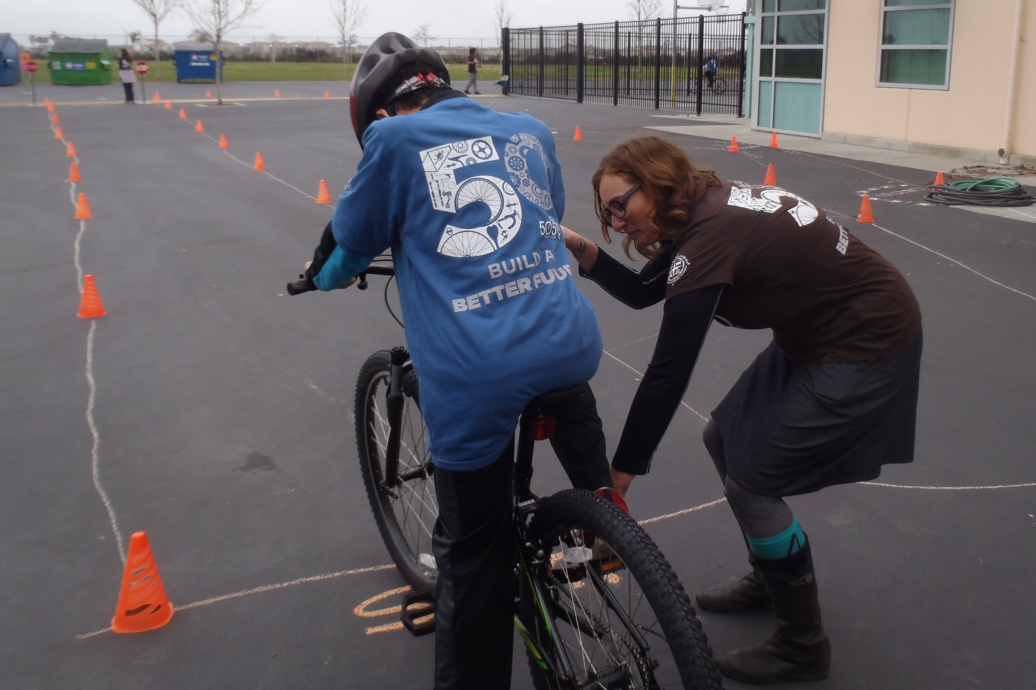 Finally, the new bicycles and riders came to our bicycle skills stations. Here Elle taught a student about the best position for a strong start. We call it power pedal.