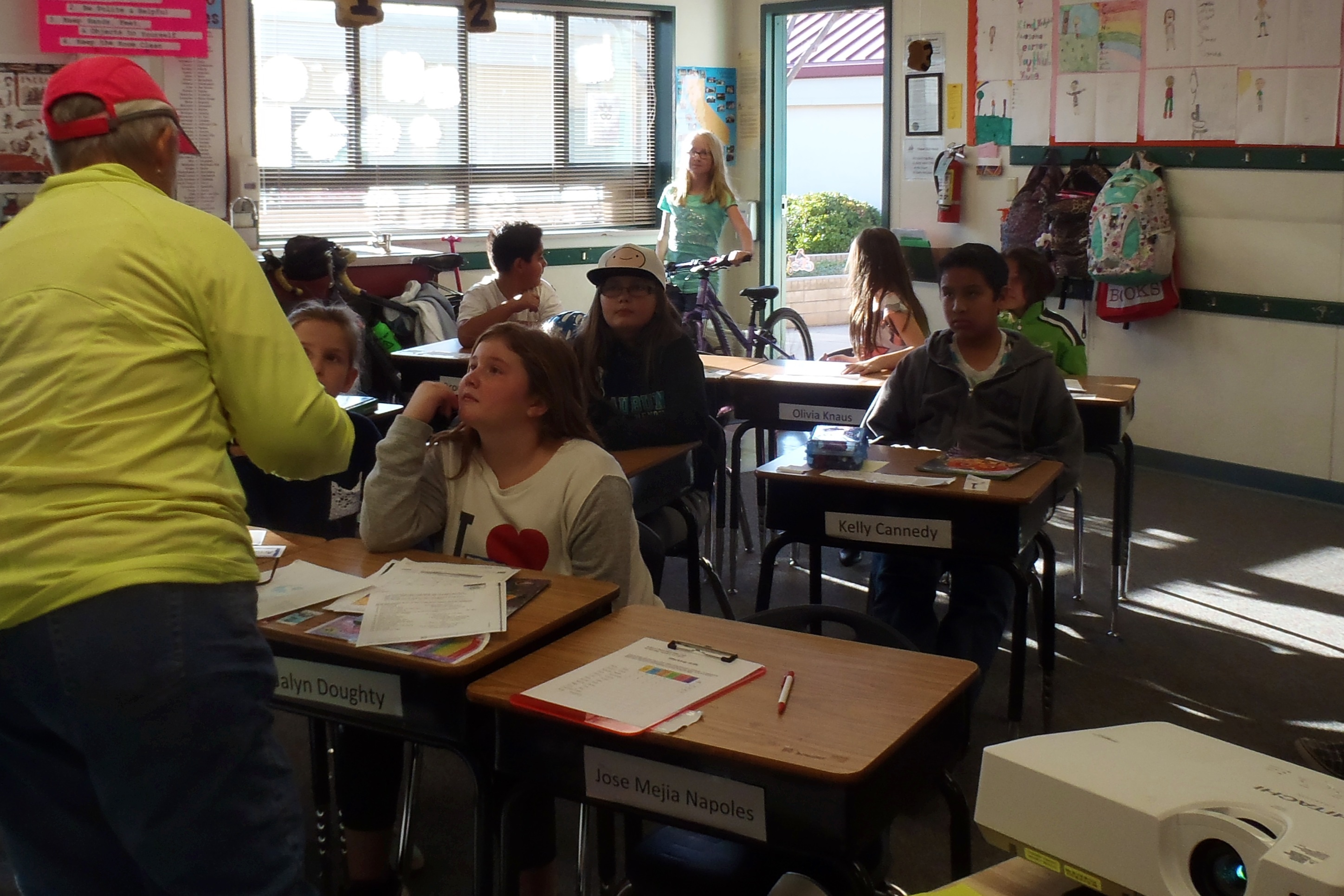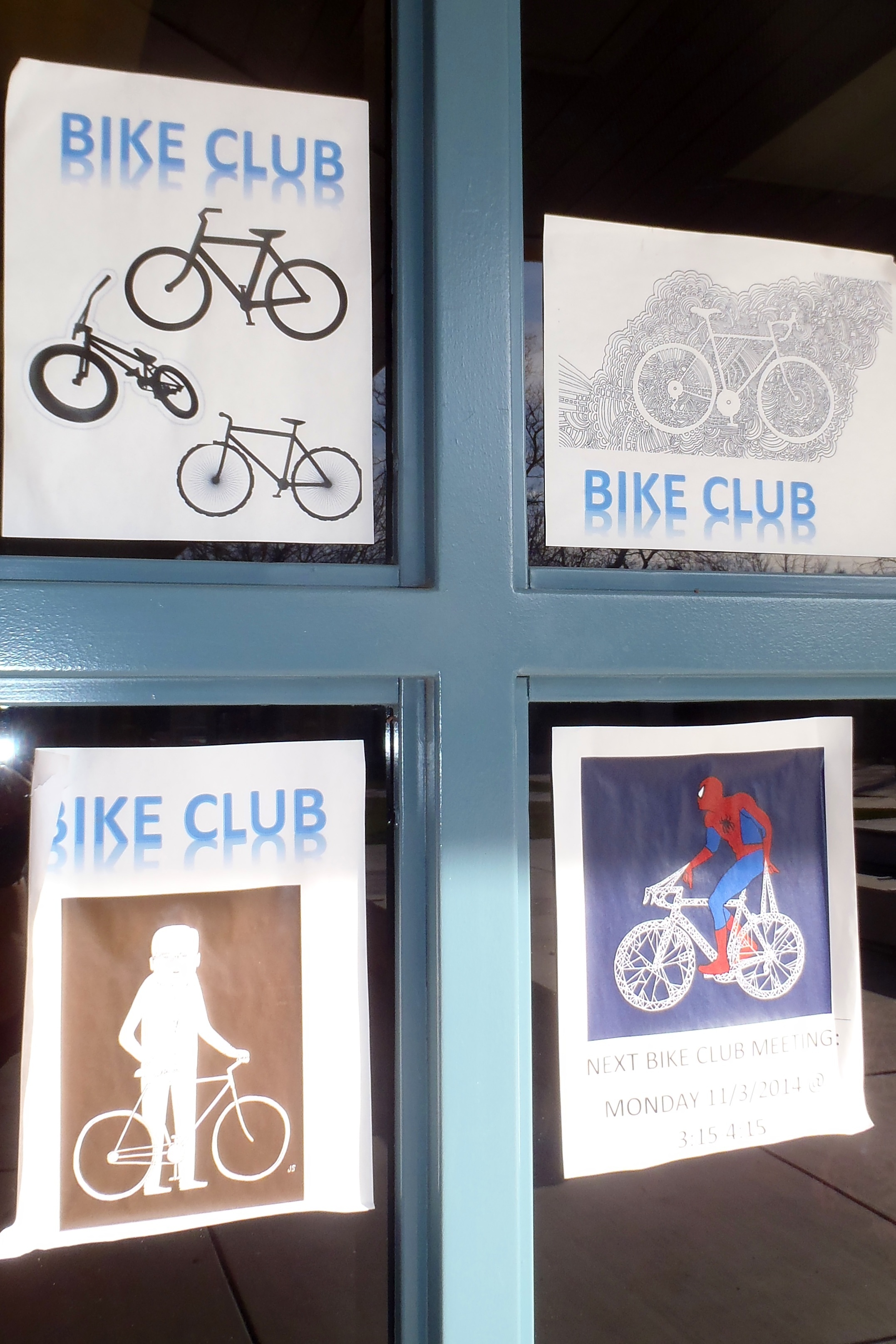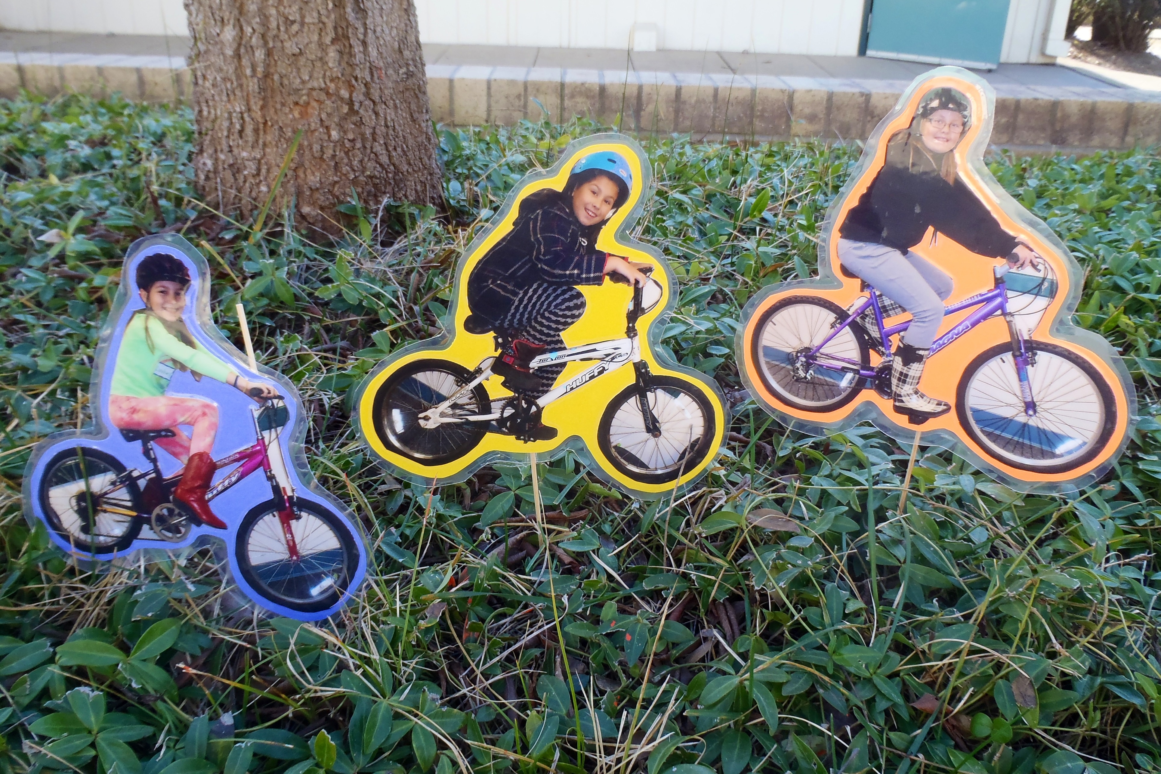 Outside, students learned how to make a proper left turn and began practicing. Staff advisor Luke Brownell is great about helping kids with inflating tires, checking on mechanical difficulties, and helping at all the skill stations. Today Calf Roping was an extra activity. Our parent volunteers were also a big help. Brian took pictures of all students who needed a Bicycle Garden picture. Here Cindy organizes the start line