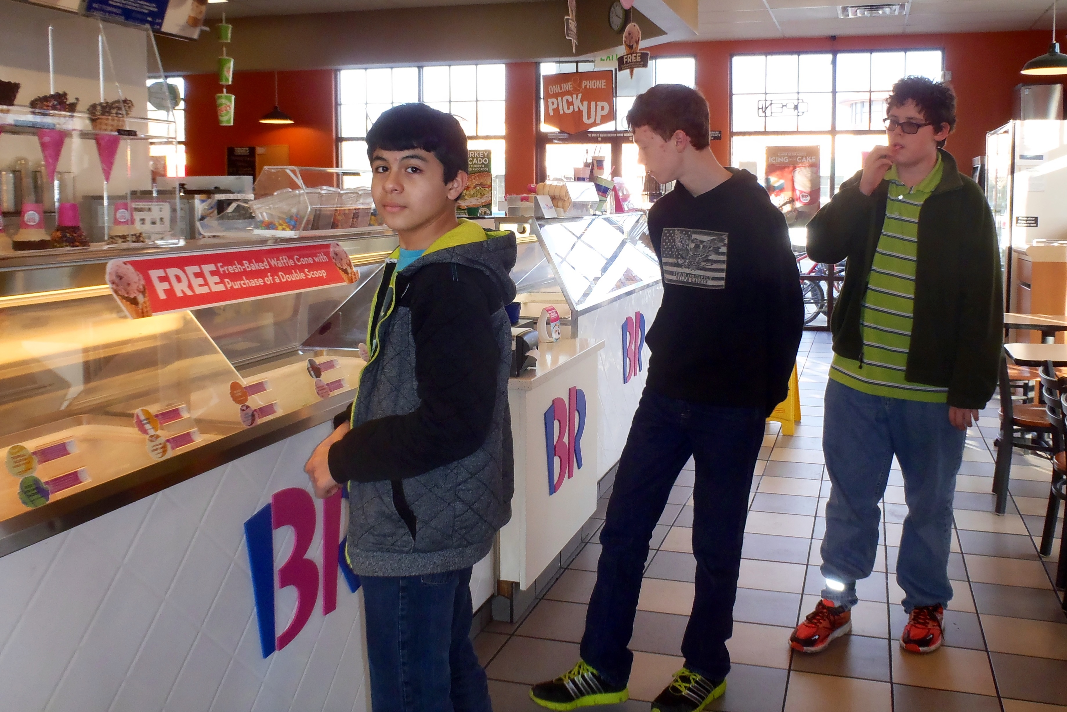 The skill we practiced several times was entering a roadway safely. We did this as individual drivers and crossed one at a time. I went first, Megan reinforced good choices and crossed as the last rider. This was Xavier and Andrew’s first ride, we were extra careful. Reward! Baskin-Robbins.