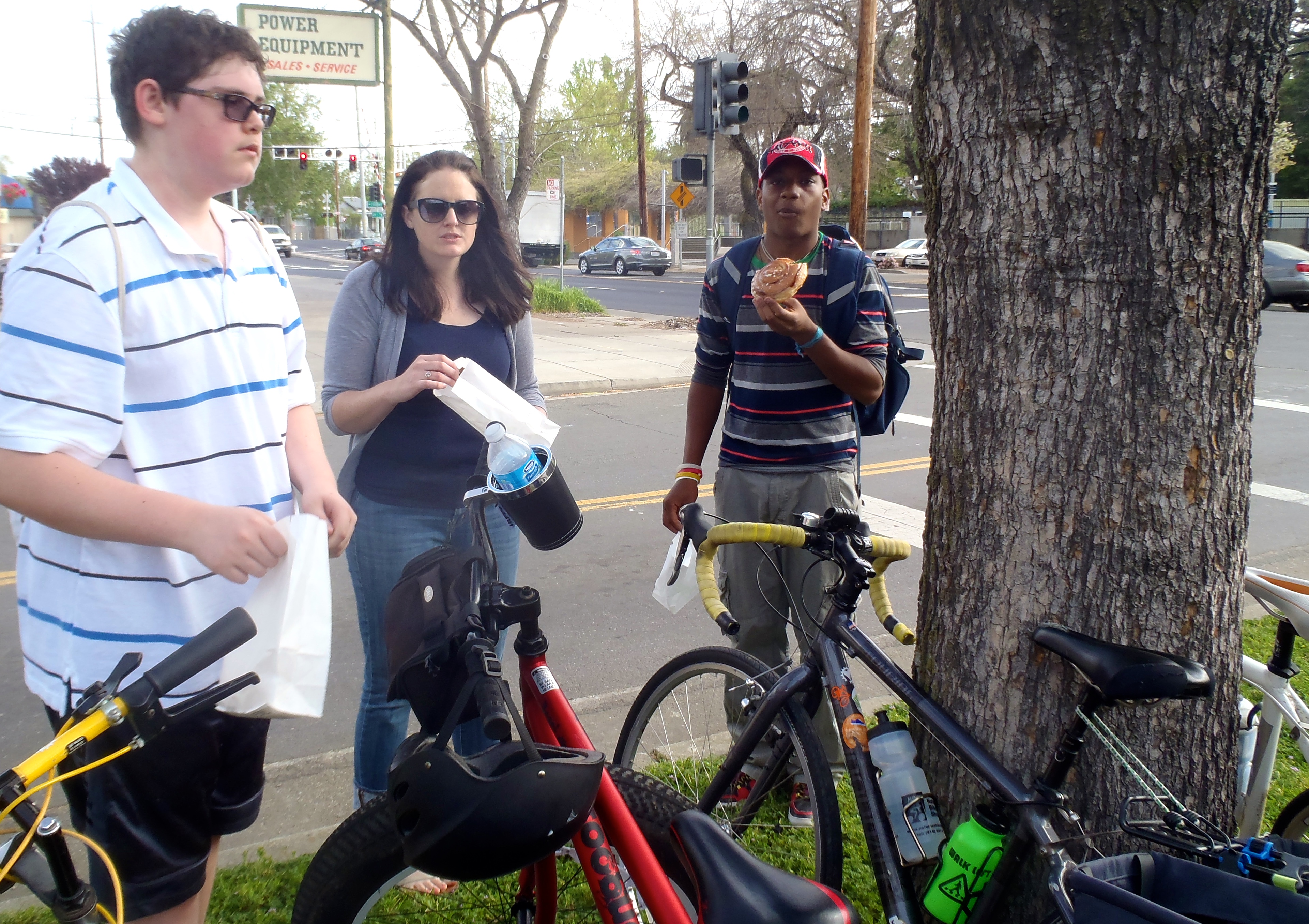 We met up with Elle Steele and Kidical Mass. They were having a group ride from Marie’s Donuts to William Land Park, about 2 miles away. The variety of child-carrying bicycles was amazing.