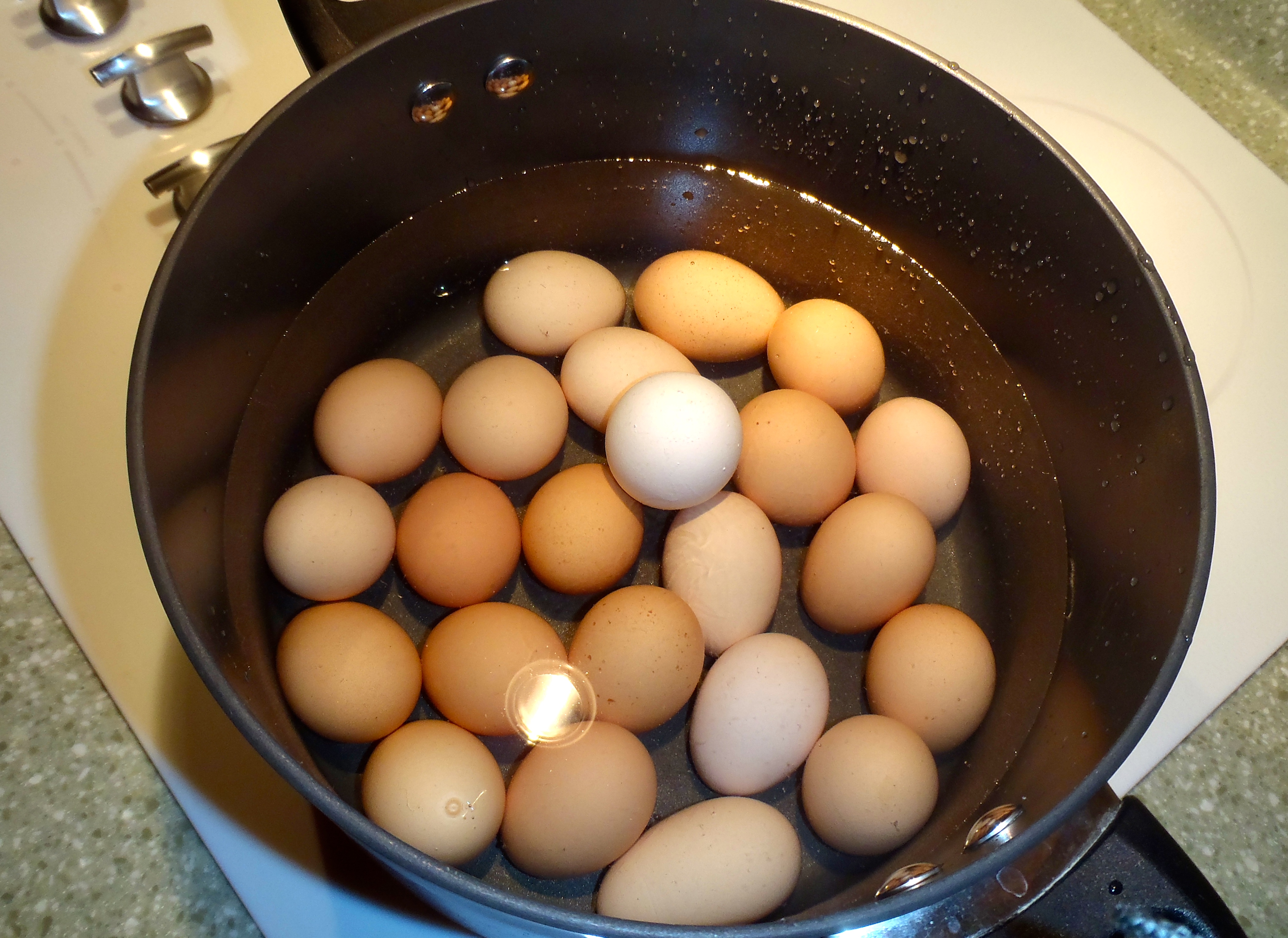 Here’s my very short version. Last Thursday I began preparing for the Throwdown by boiling 2 dozen eggs, all donated by Farmer Deno (except for that white one).