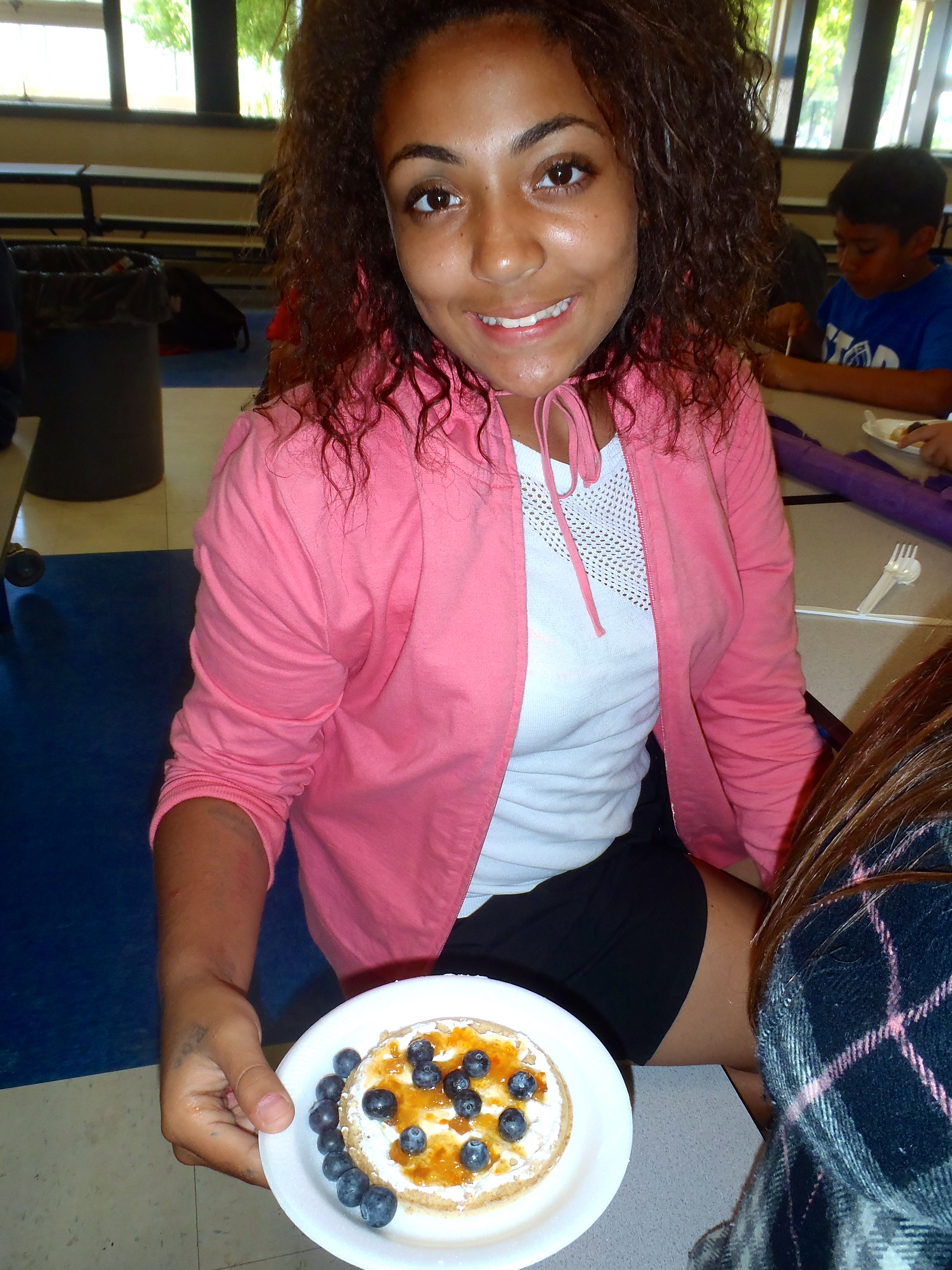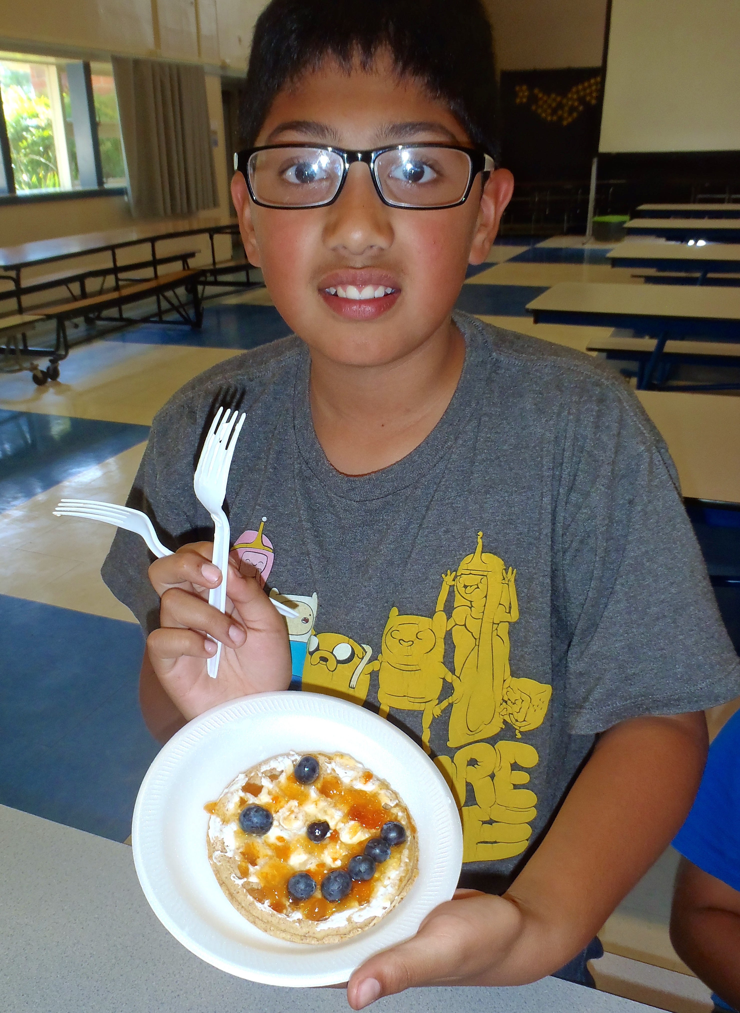 I tried really hard to create a new community event this year: a Middle School Cooking Challenge. I started organizing, planning, communicating, etc. last January. I invited 4 local middle schools to participate but did not get an enthusiastic response. Two weeks ago, I had to admit defeat and canceled the event. Shawn Baker, the after-school program coordinator at Rio Linda Prep, was the best at keeping in touch and trying to generate interest at Rio Linda Preparatory Academy. To thank him, I arranged to meet the students this afternoon and brought all the ingredients for each of them to make their own healthy after-school snack: whole-grain waffle, whipped cream cheese, (homemade) apricot-pineapple jam, and blueberries. Oh my, what a mess we made, but it turned out delicious.