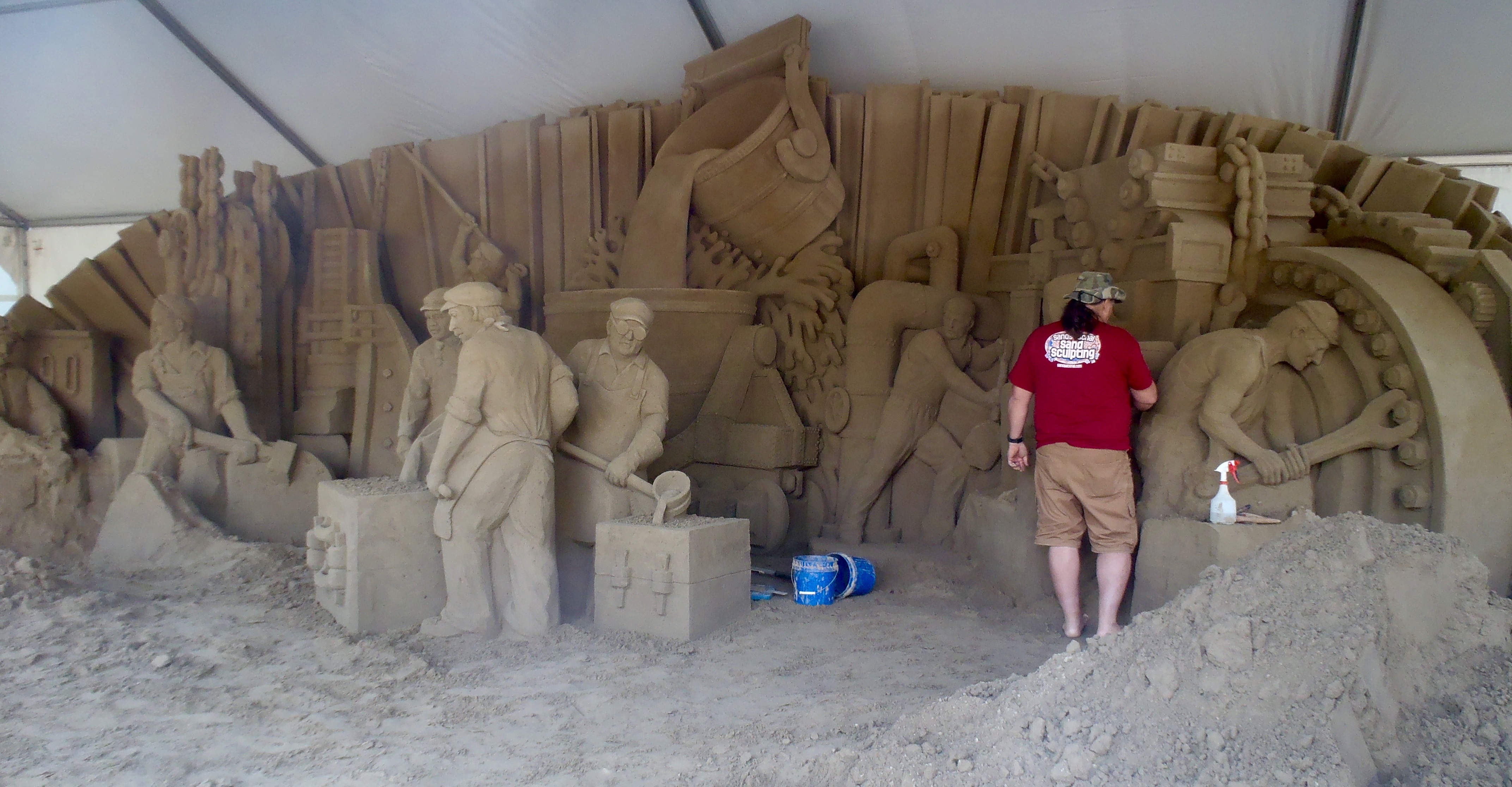 Sand sculpture in progress. located under the bridge crossed.