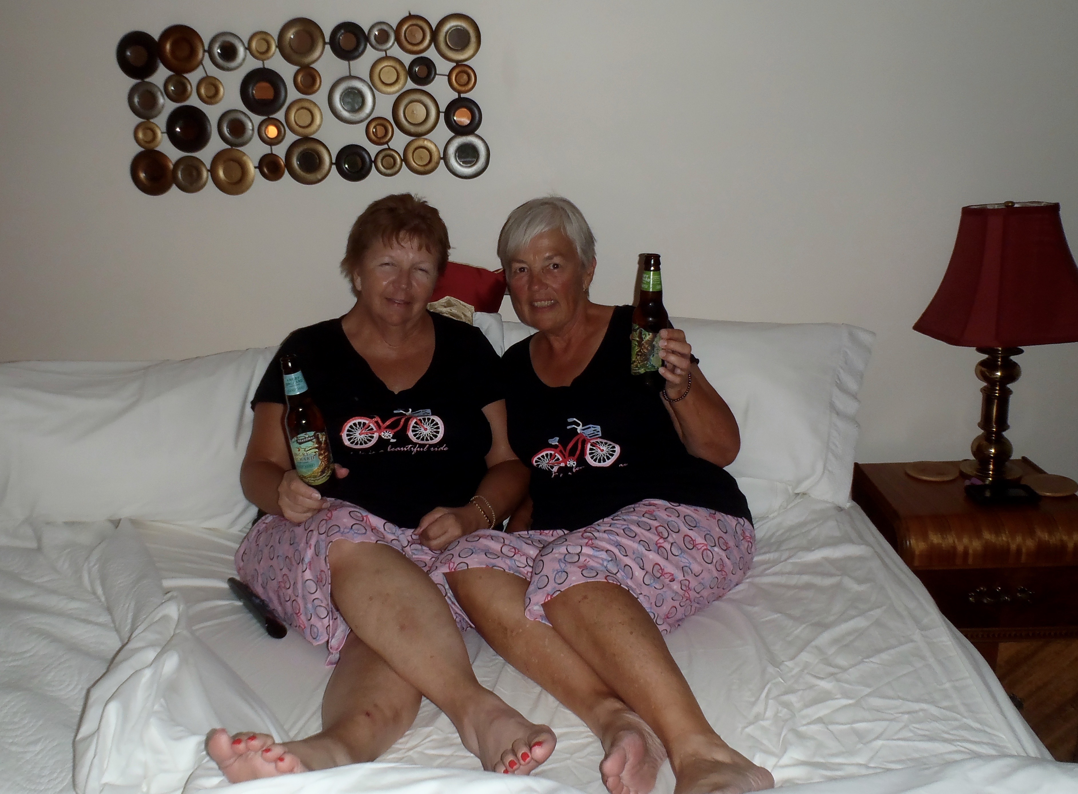 Matching bicycle pajamas, Angry Orchard hard cider, a bed big enough for all of us to sit on and watch a movie (Cake) – life is good.