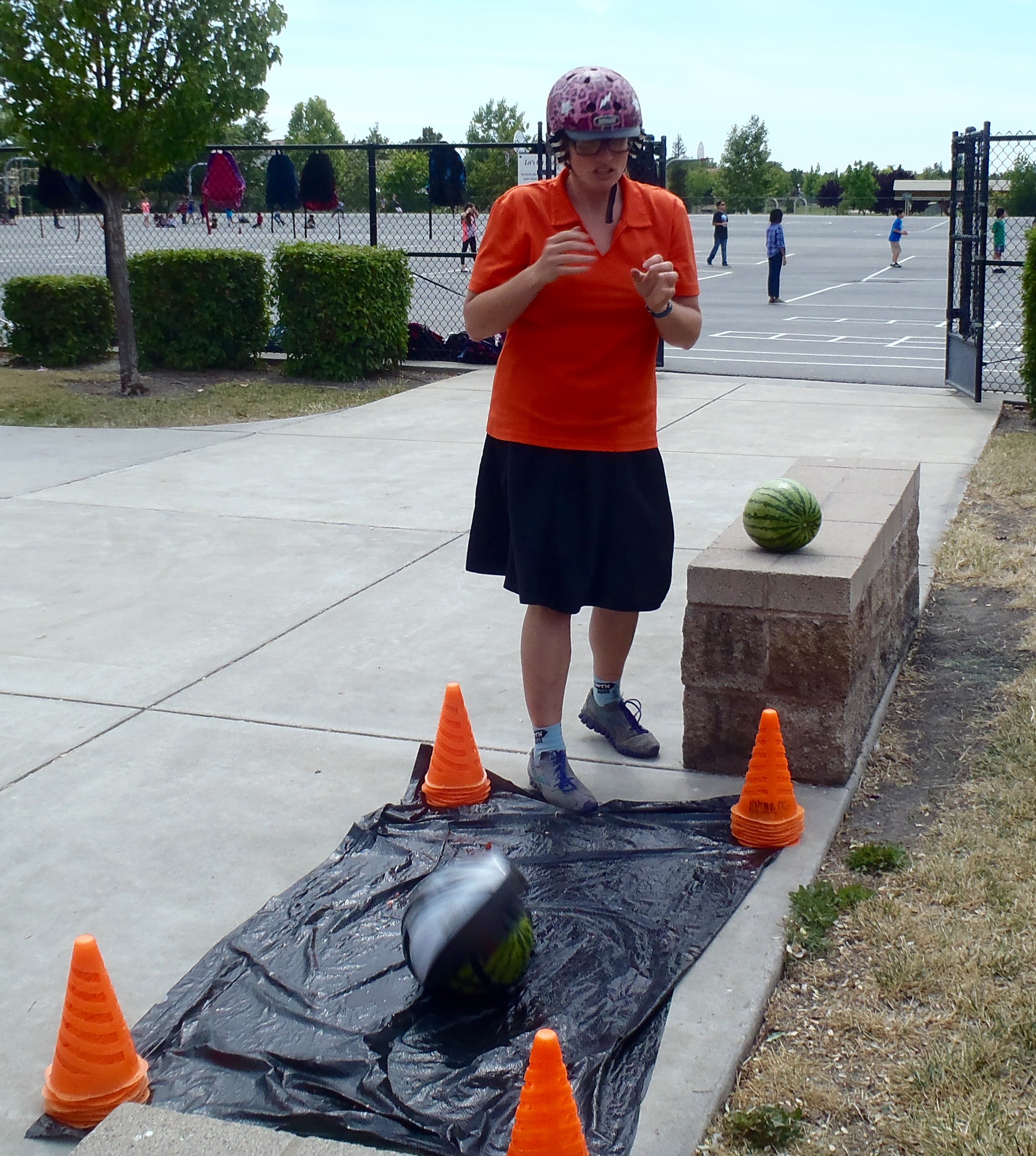 The popular Melon Drop demonstration of the importance of wearing a helmet.