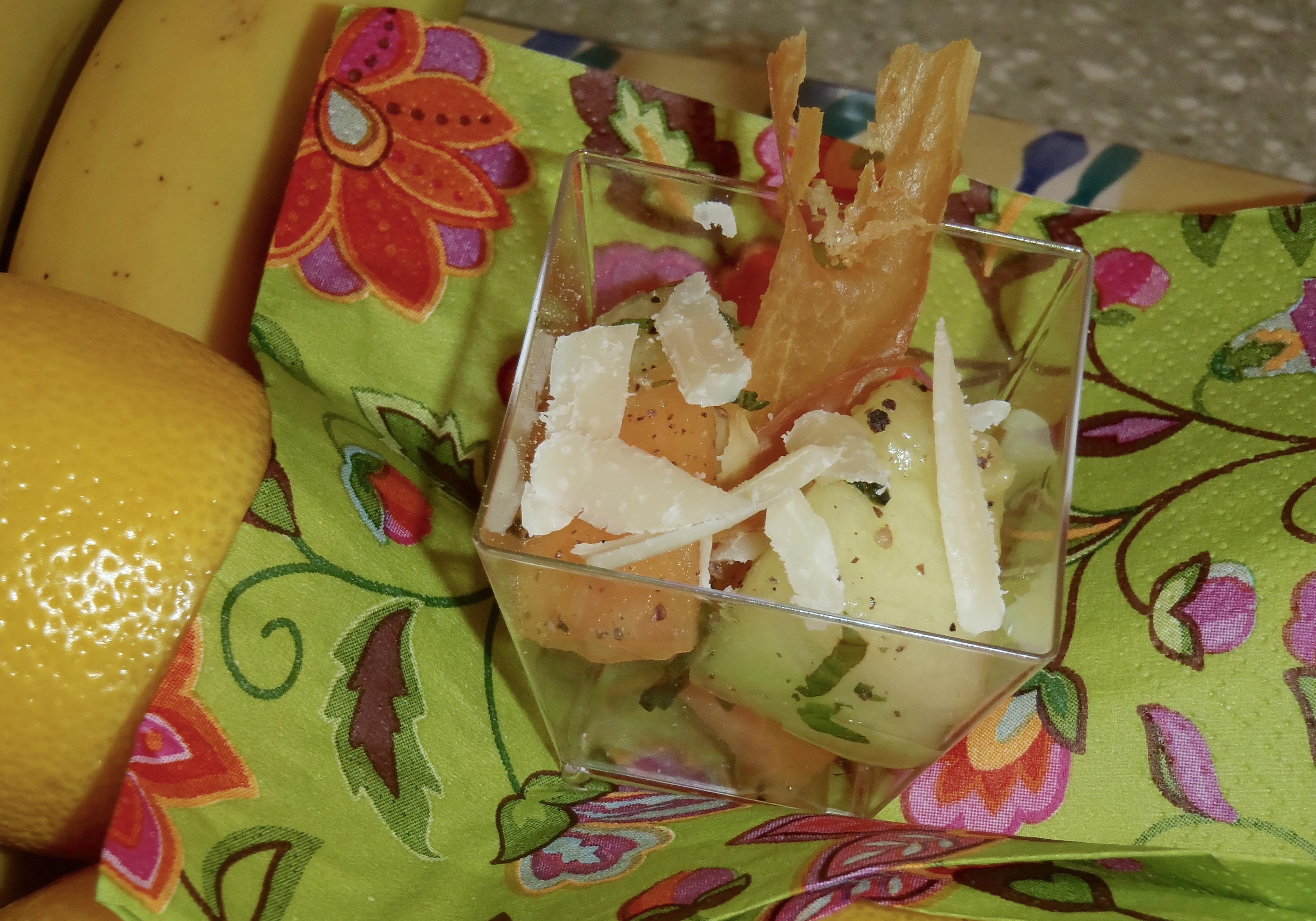 The fragrance of these melons in the kitchen for the past few days has been wonderful. They tasted even better. I paired them with cantaloupe and made 48 small servings of Melon Salad with Crisped Prosciutto for my entry into the Throwdown.