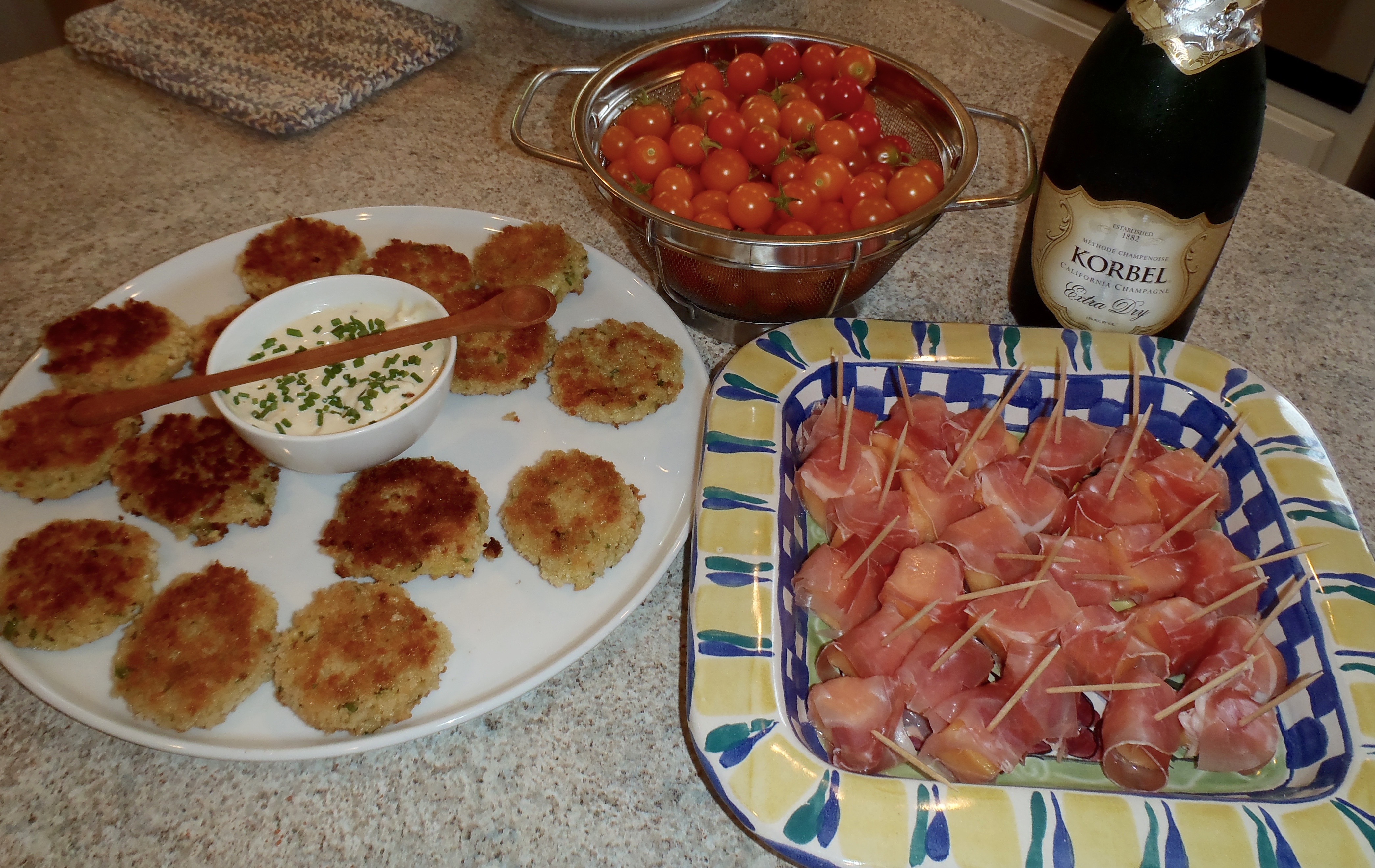 The last time we got together was the end of May, that’s WAY too long. Work and vacations were the culprits. Once again, great food and conversation. We each keep making different and delicious treats each time we get together that we thought we should make a cookbook. This time: Fontina Risotto Cakes with Fresh Chives and Lemon Aioli, Prosciutto-wrapped Cantaloupe,