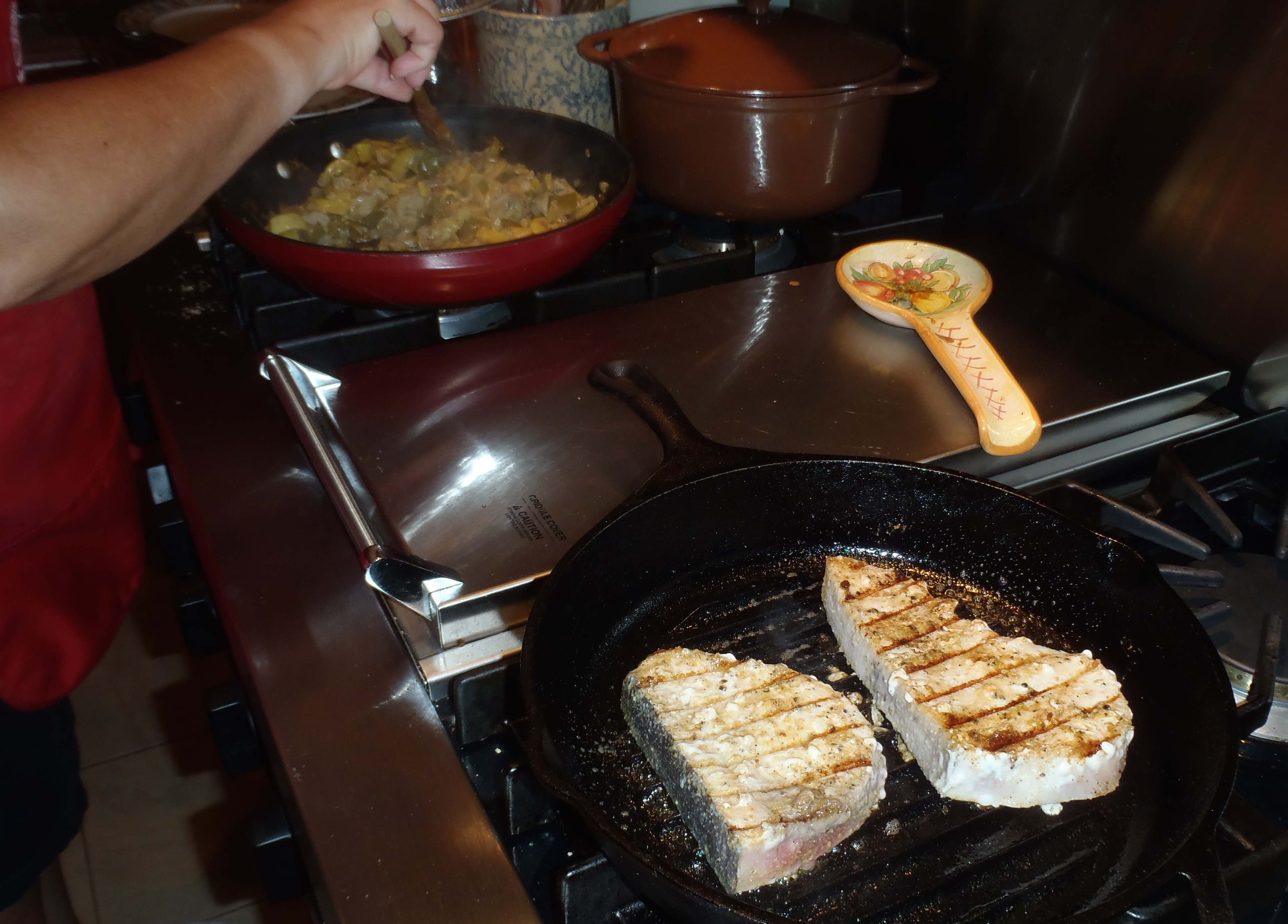 Billie is a gourmet cook! Tonight swordfish and southern succotash. Yum!