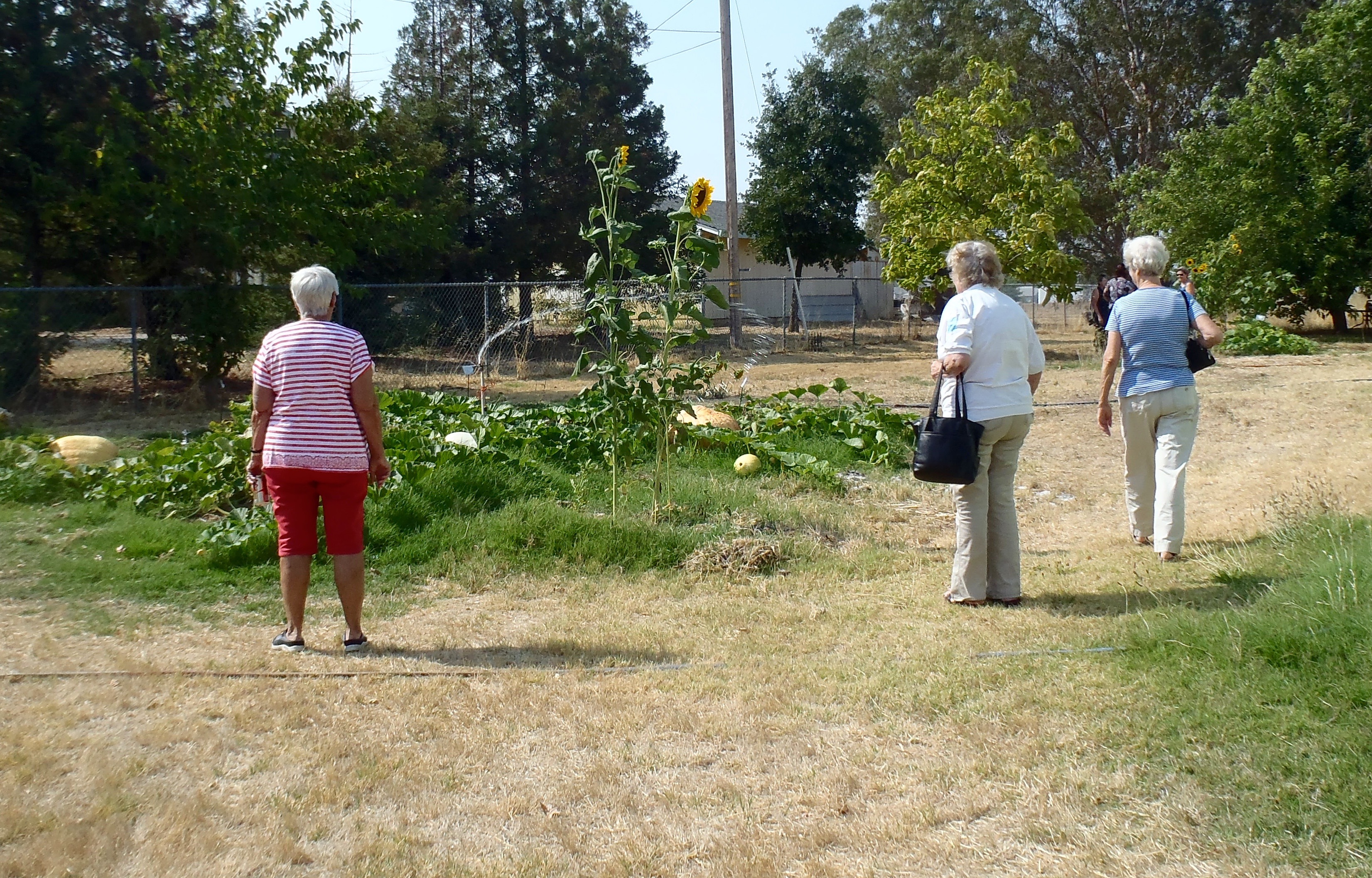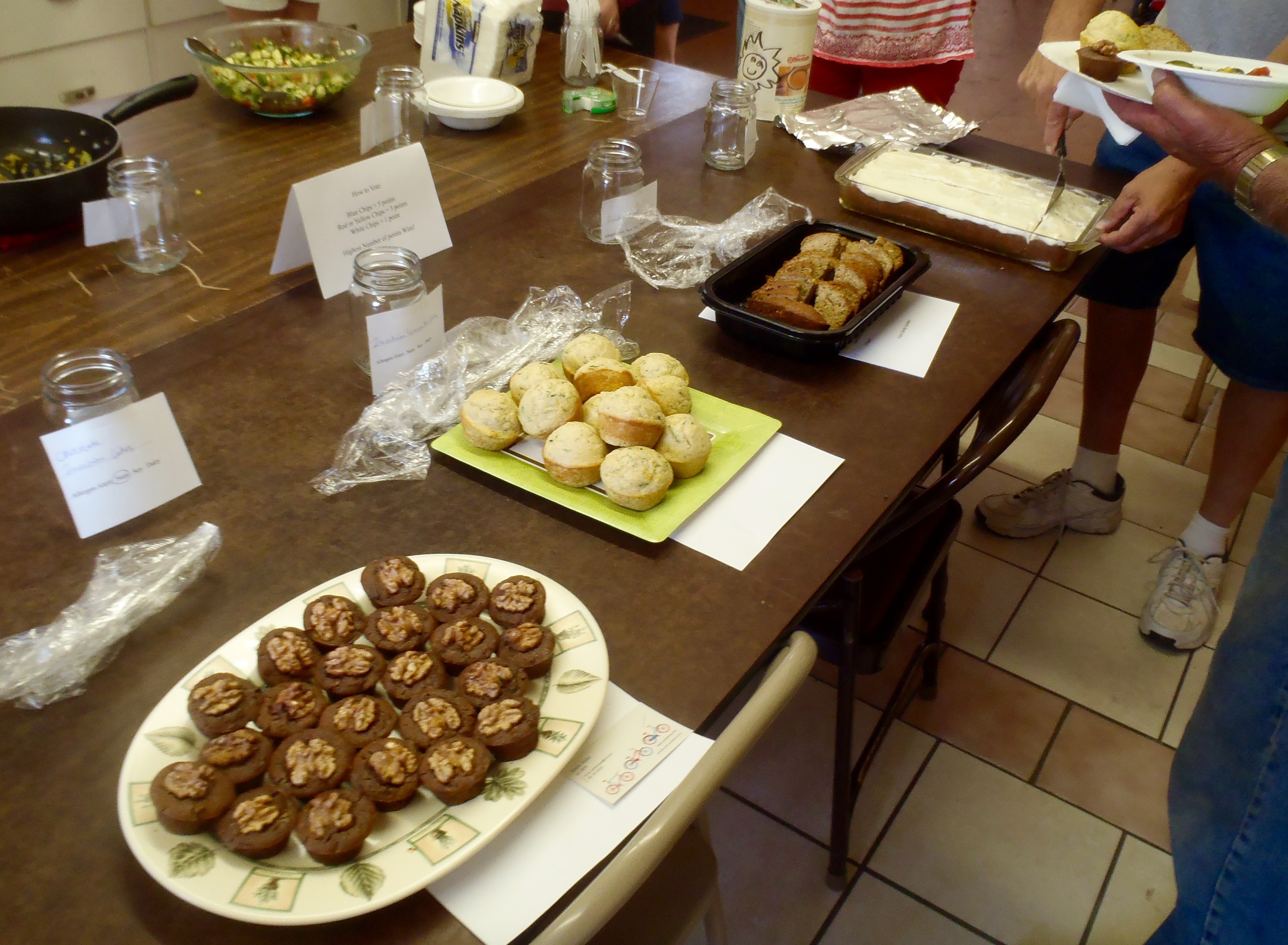 Zucchini Sweet Contest entries. In front, my Zucchini Cakes with Walnuts, then Phyl’s Lemon Zucchini Muffins, Sandy Sanders Zucchini Bread, and Catherine Green’s Zucchini Cake with Cream Cheese Frosting.