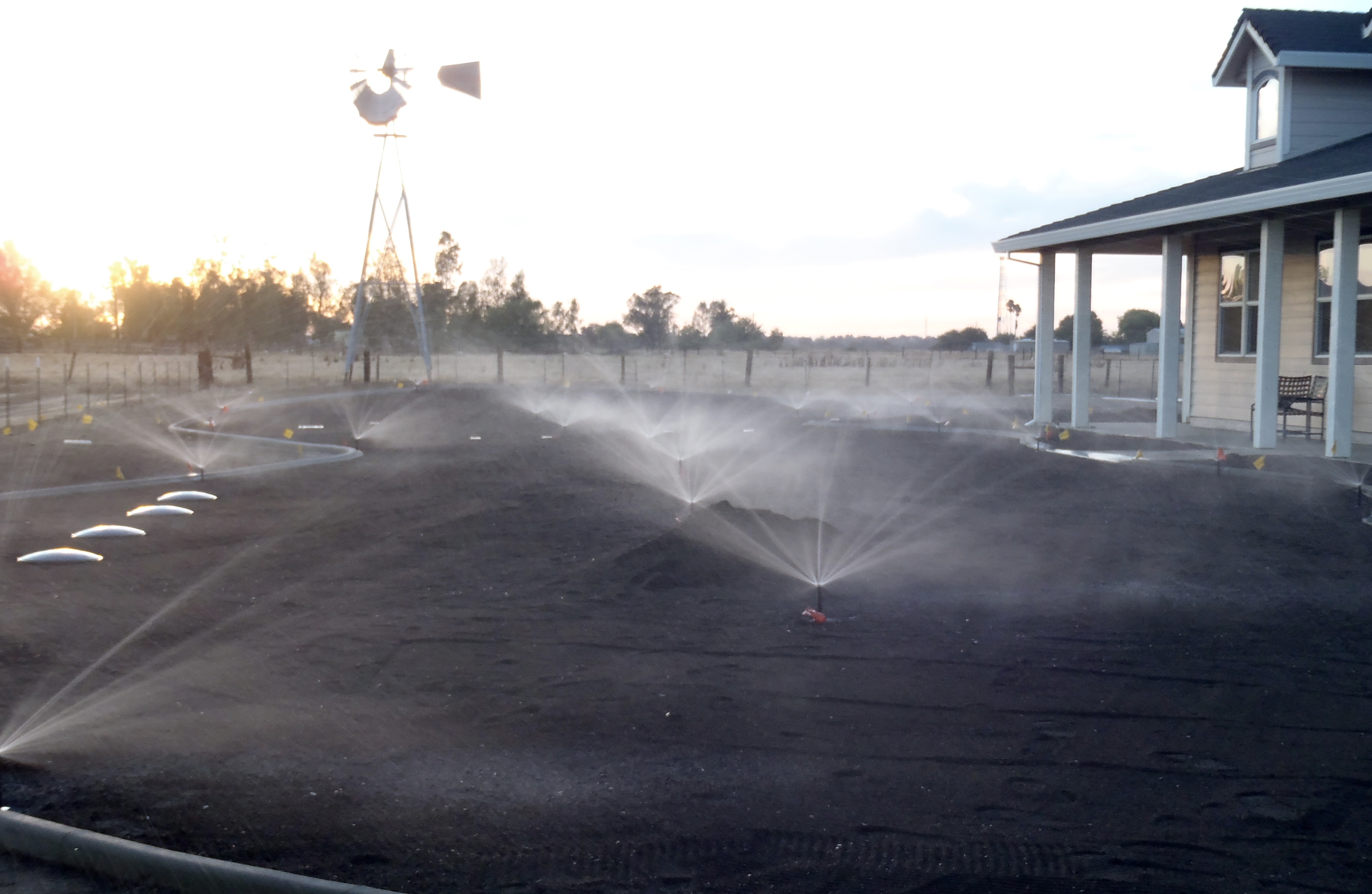 Test-fire of sprinkler system at sunset – everything worked just fine, minor adjustments only.