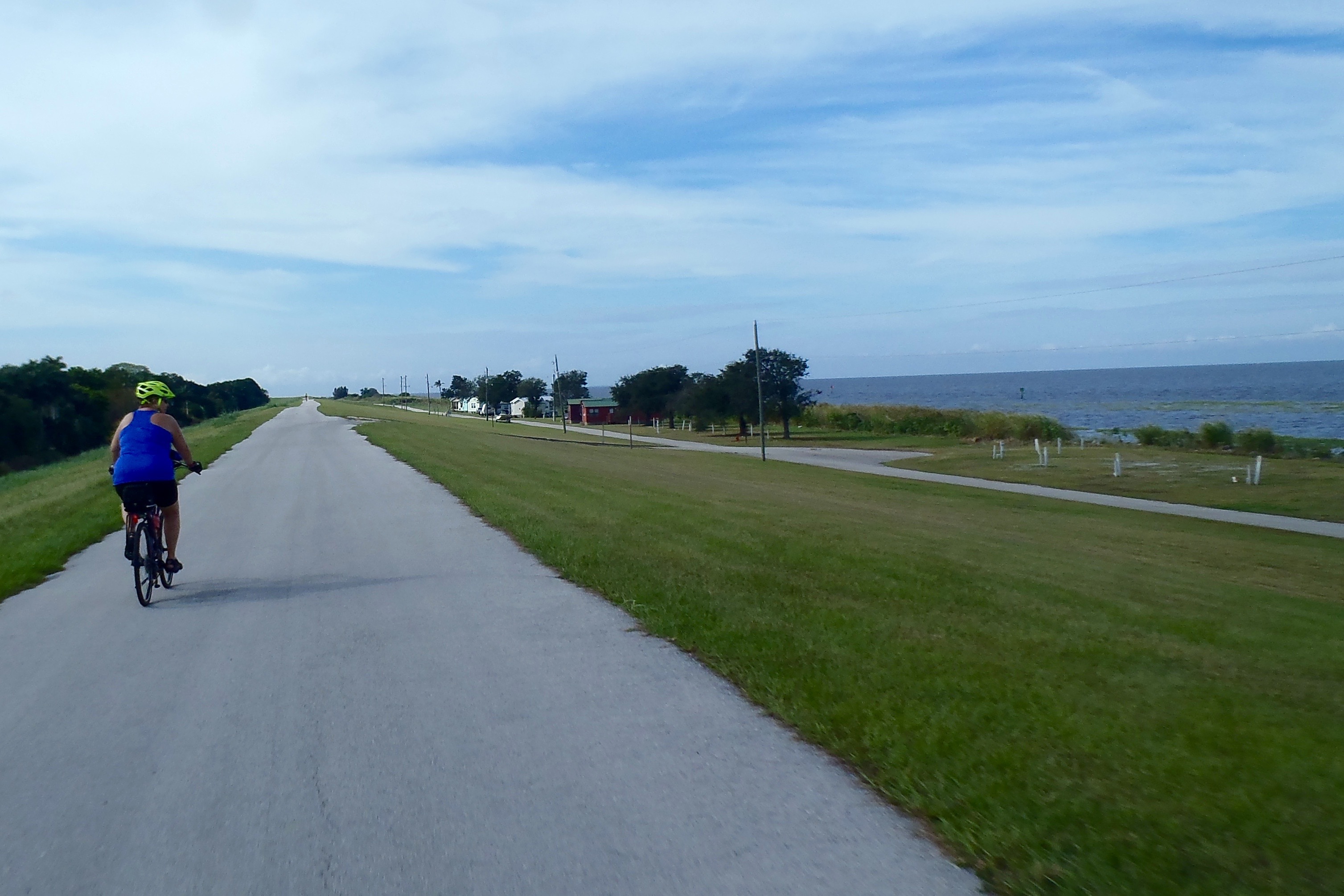 The lake is the second-largest freshwater lake in the USA, average depth is 9 feet. After a hurricane in 1928 when 2500 people were killed, a 30-foot dike was built around the entire lake. Parts of the trail are paved, parts are rough trail, and parts are impassable requiring cyclists to ride on roads. Ultimately, there is supposed to be a 110-mile paved trail. After just 6 miles, we came to an impassable section and turned around.