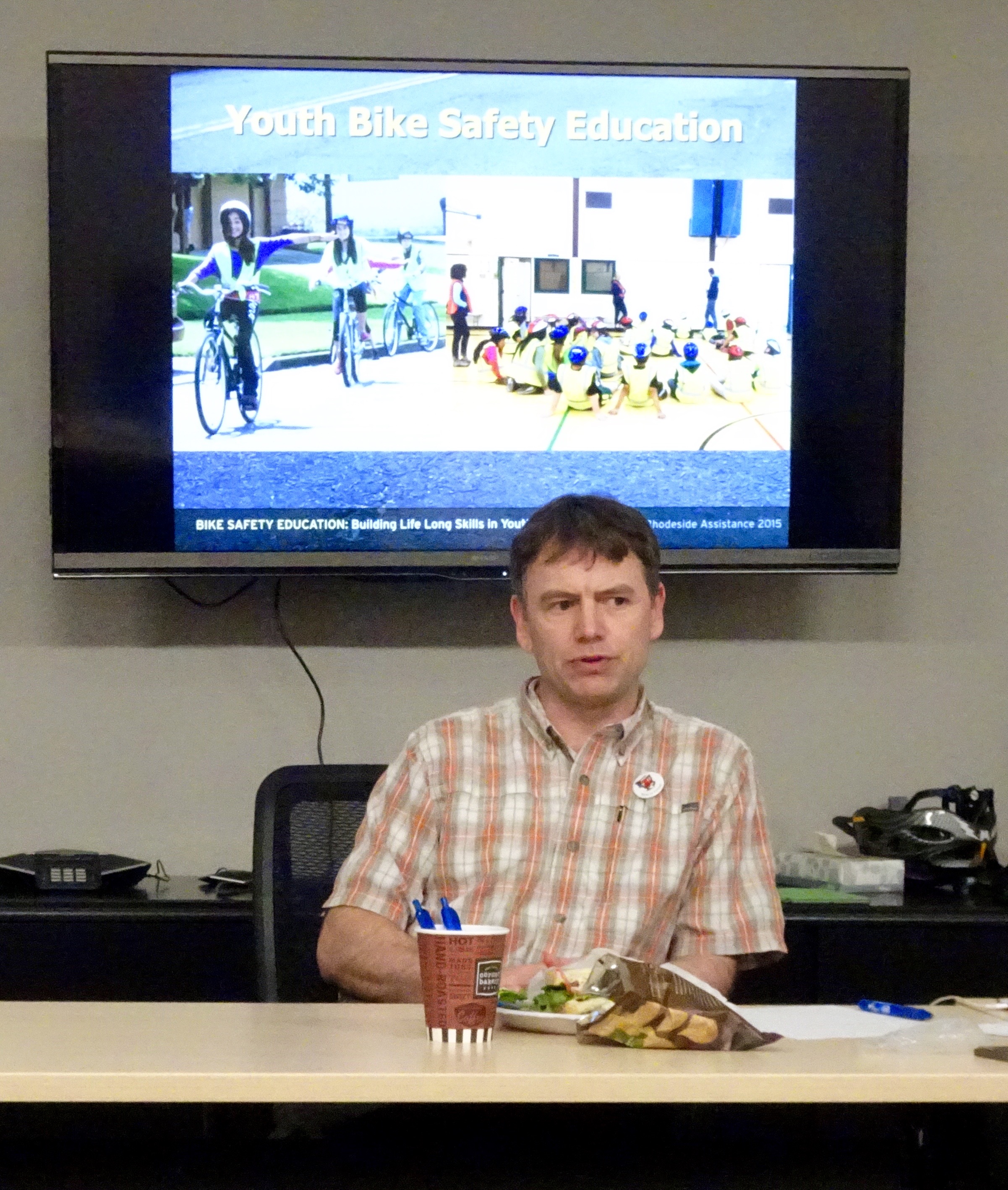 Shane MacRhodes was in town. Shane runs the Safe Routes to School program in Eugene and is a co-founder of Kidical Mass. Last night he met with local LCIs at the Bicycle Kitchen in Sacramento. Tonight he presented the latest best teaching techniques at North Natomas TMA to a group of experienced LCIs plus a few rookie-LCIs.