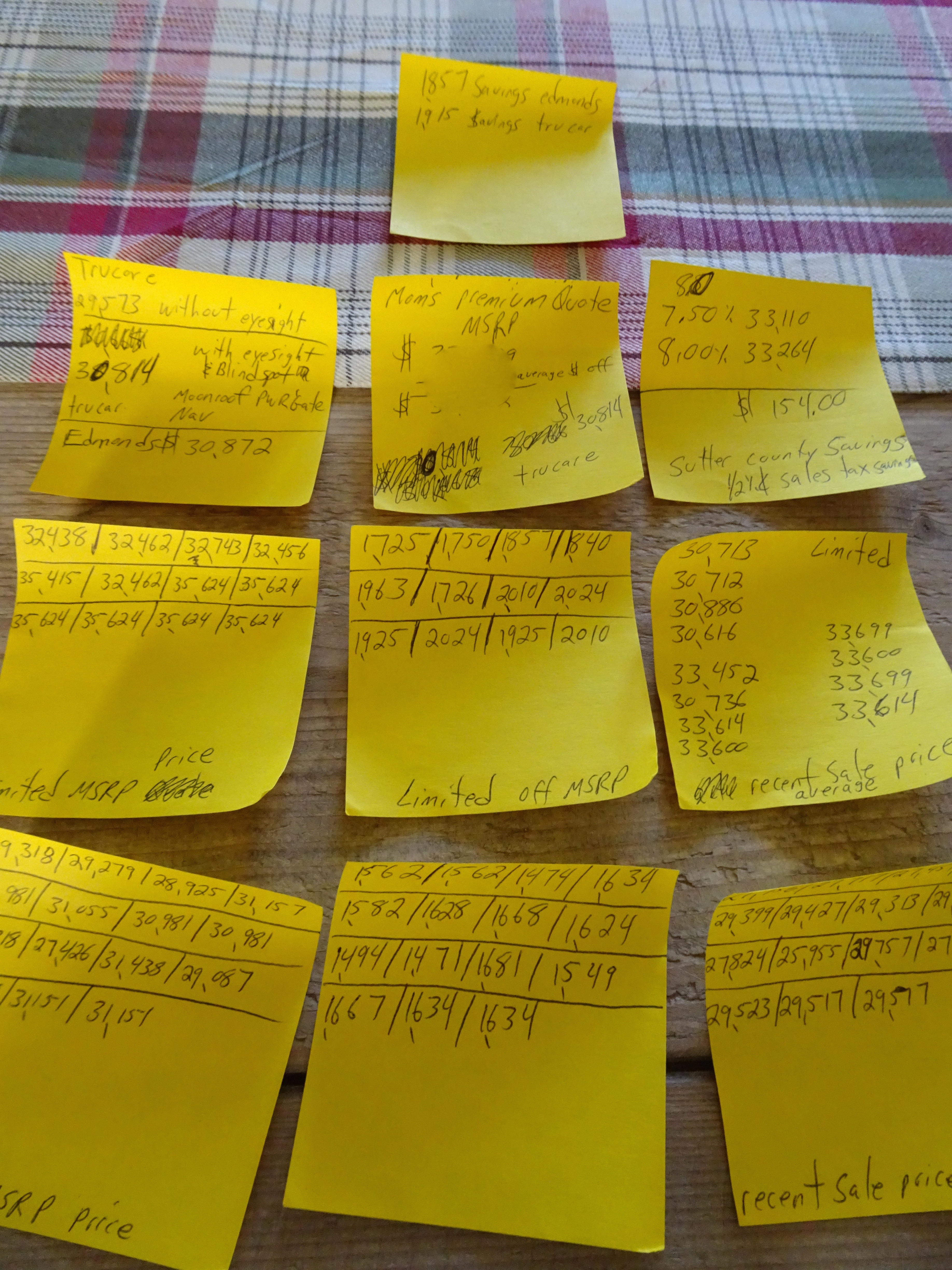I have to give Justin a big thank-you for helping me. He is definitely Ed’s grandson. After our first visit, as soon as he got home, he downloaded a car-buying app, consulted a few other online resources, and started filling out post-it notes with information. He compared invoices with actual selling prices from surrounding dealerships to figure out what the average discount was.