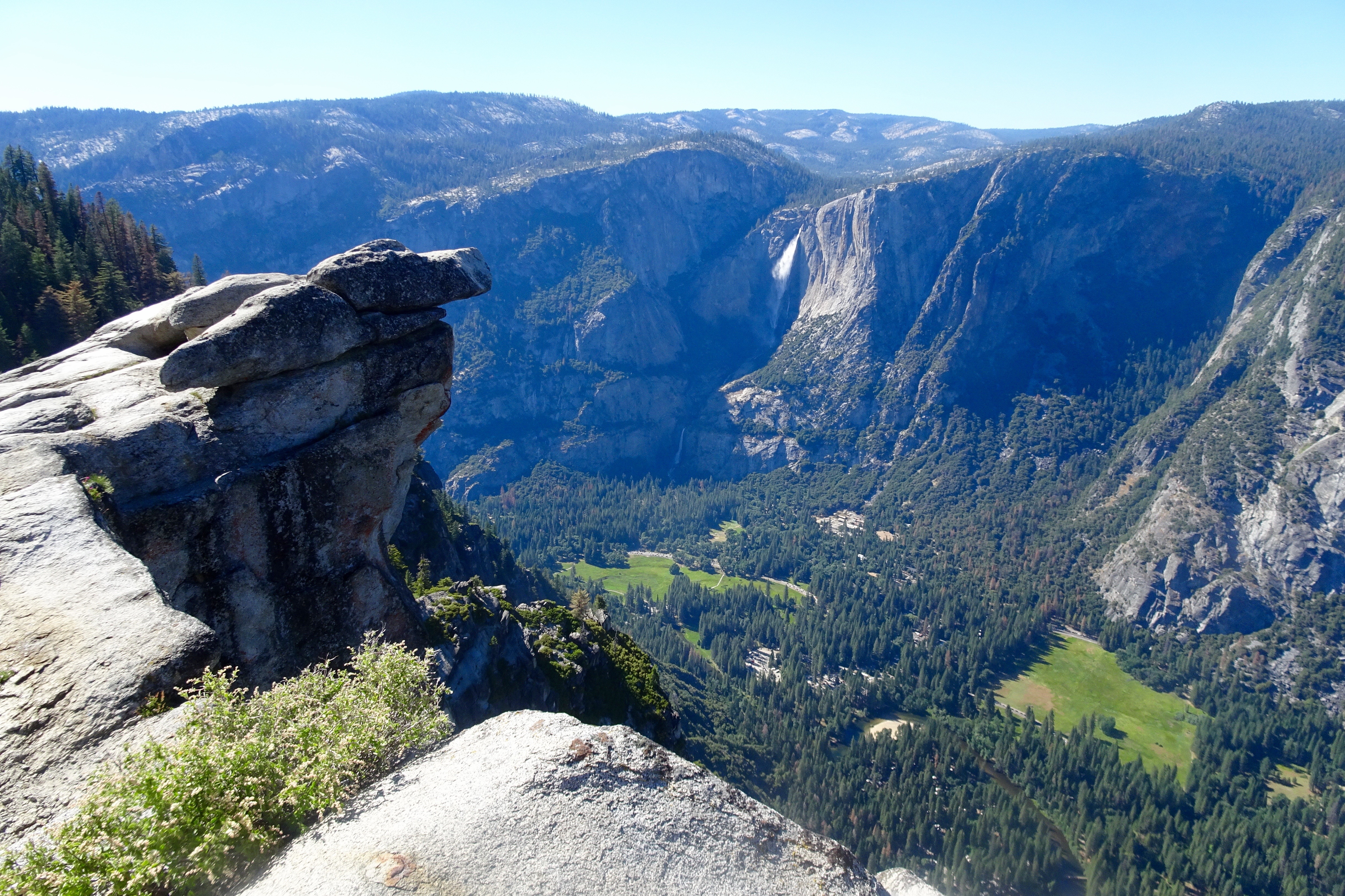 In the past, people have gone out onto this point of rock to have their picture taken, but now there is an impassable fence. In the background, Upper and Lower Yosemite Falls.