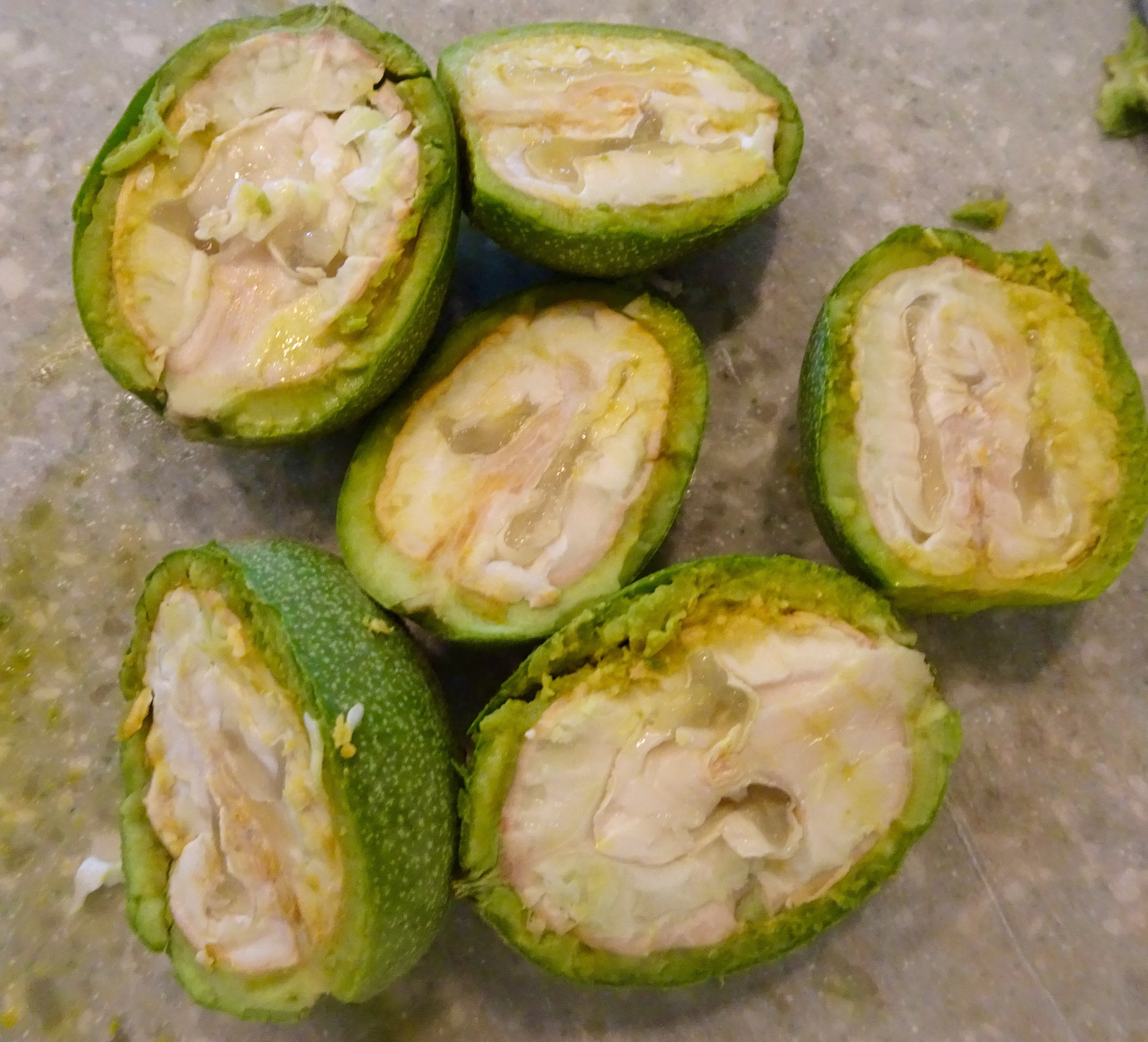 Cut in half. Not easy, I needed a big chef’s knife. The walnuts are picked now, just before the hard shell begins to form.