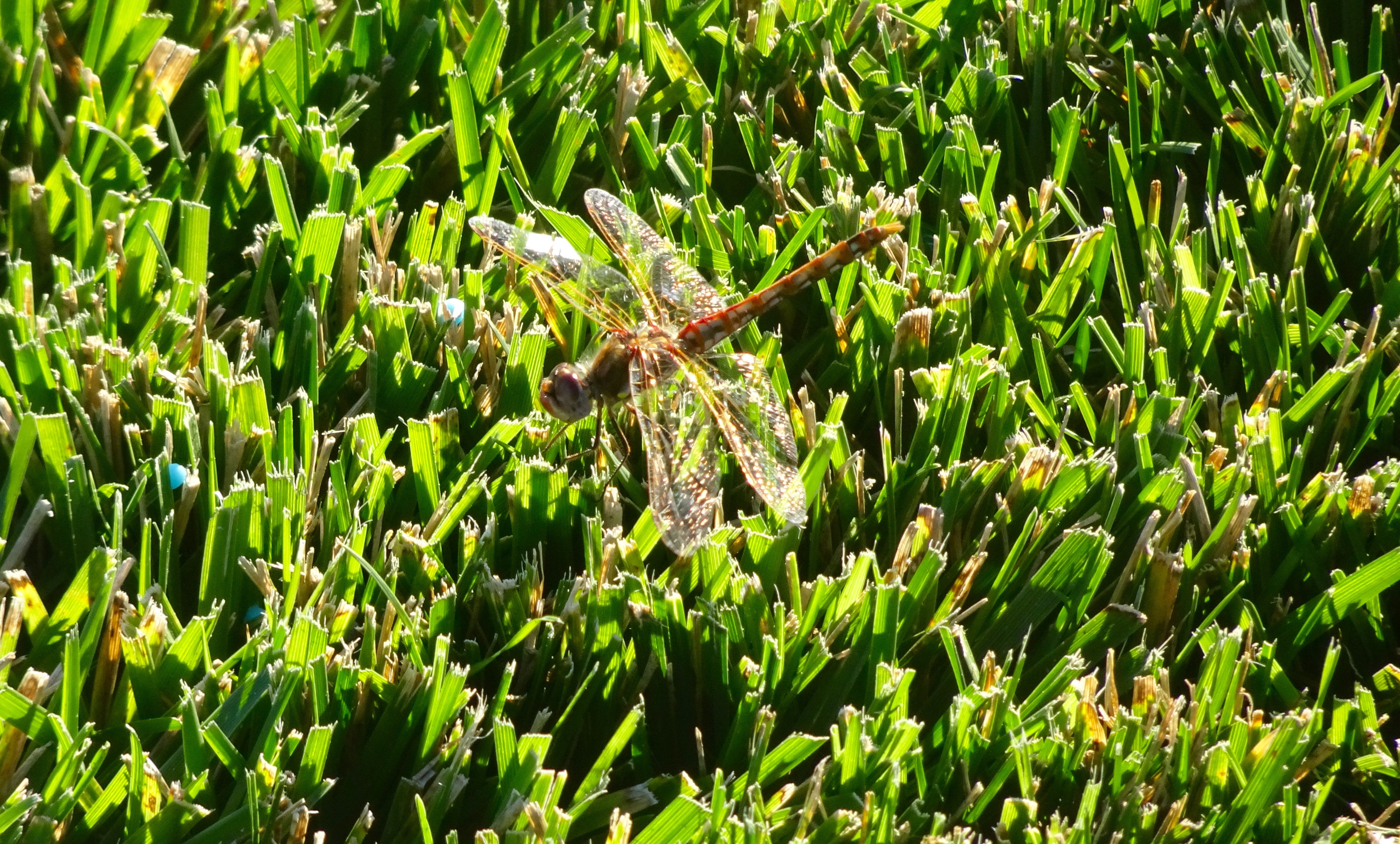 Our string of seven days over 100 degrees ended today, a south wind was blowing! That’s when dragonflies hunker down close to the ground, like in Justin’s lawn. There were about lots of little fluttery coppery wings sparkling in the sun, not too visible here.