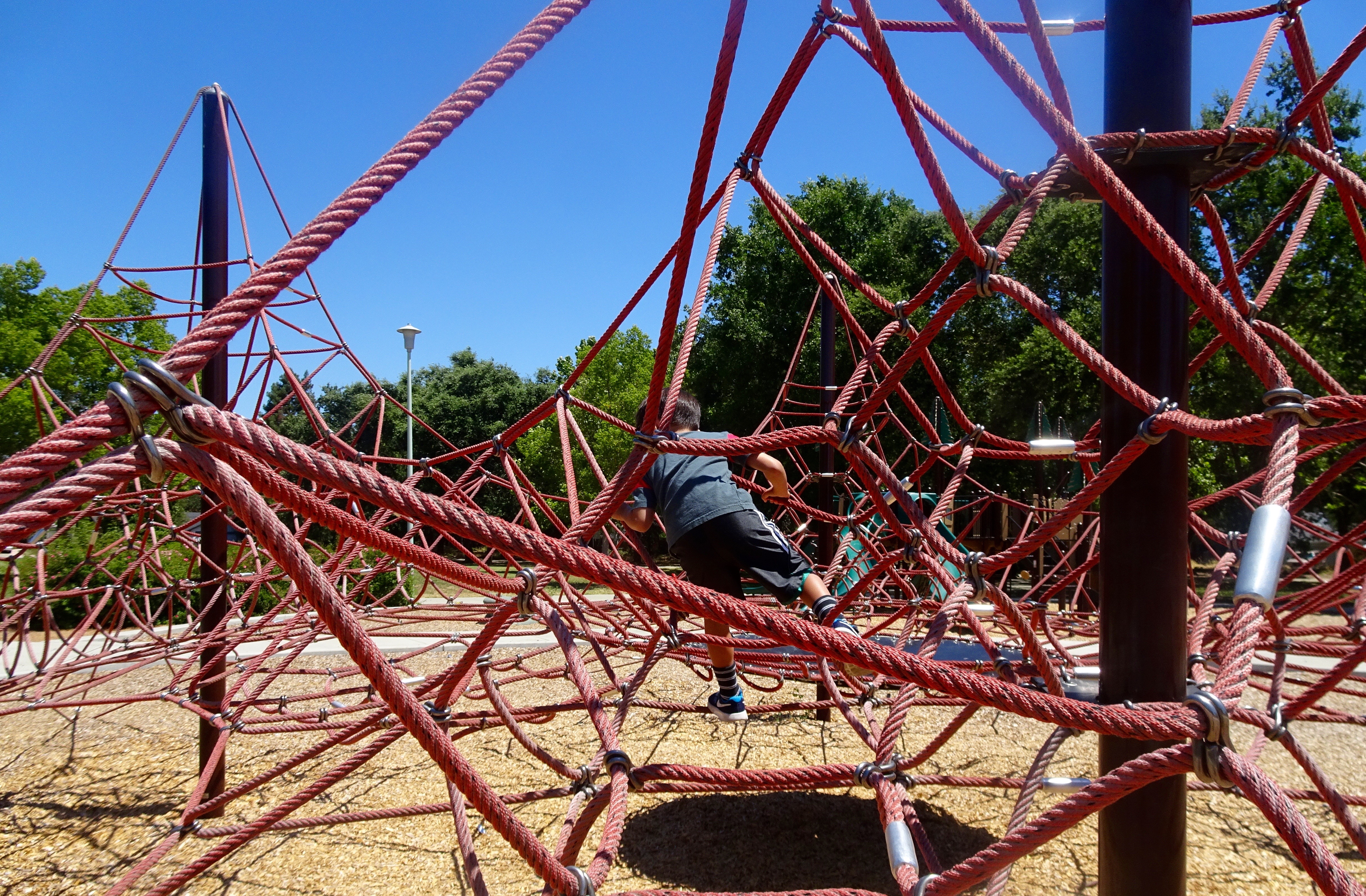 On the ride back, we stopped at a park on Bannon Creek Parkway. Very big climbing rope structure with a trampoline in the middle.