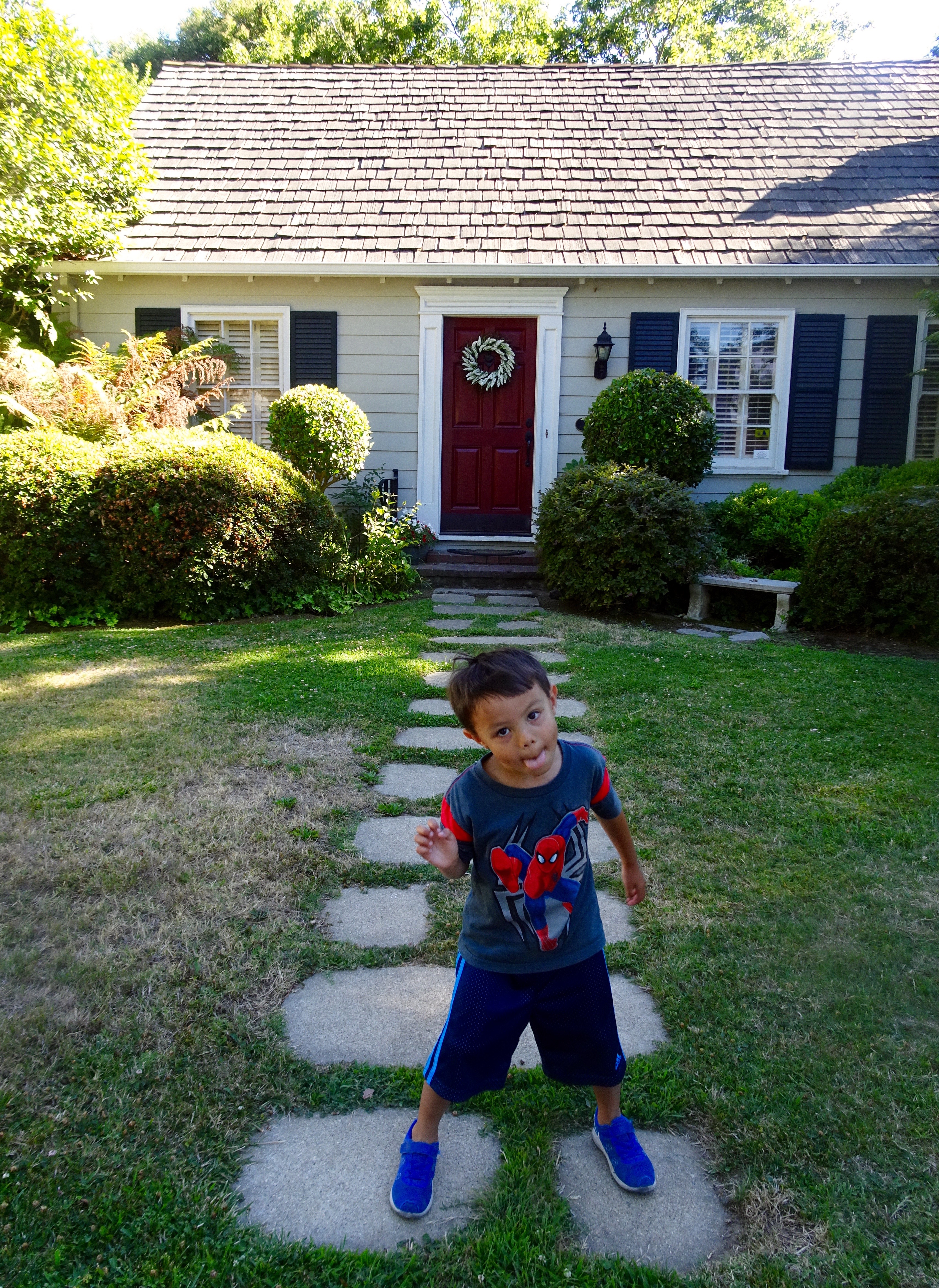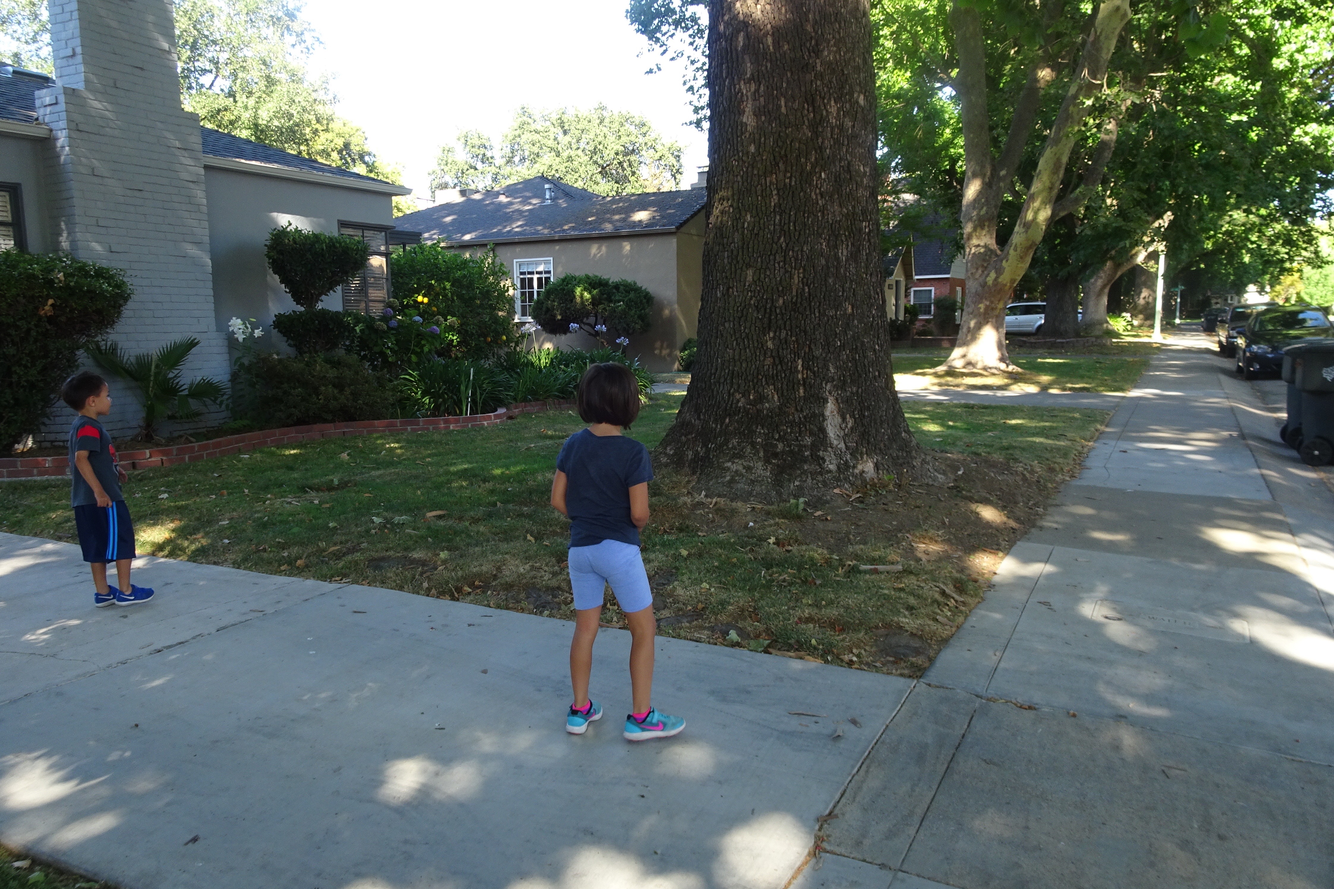 the friendly cat. No cat today, but they did find a great hopscotch walkway.