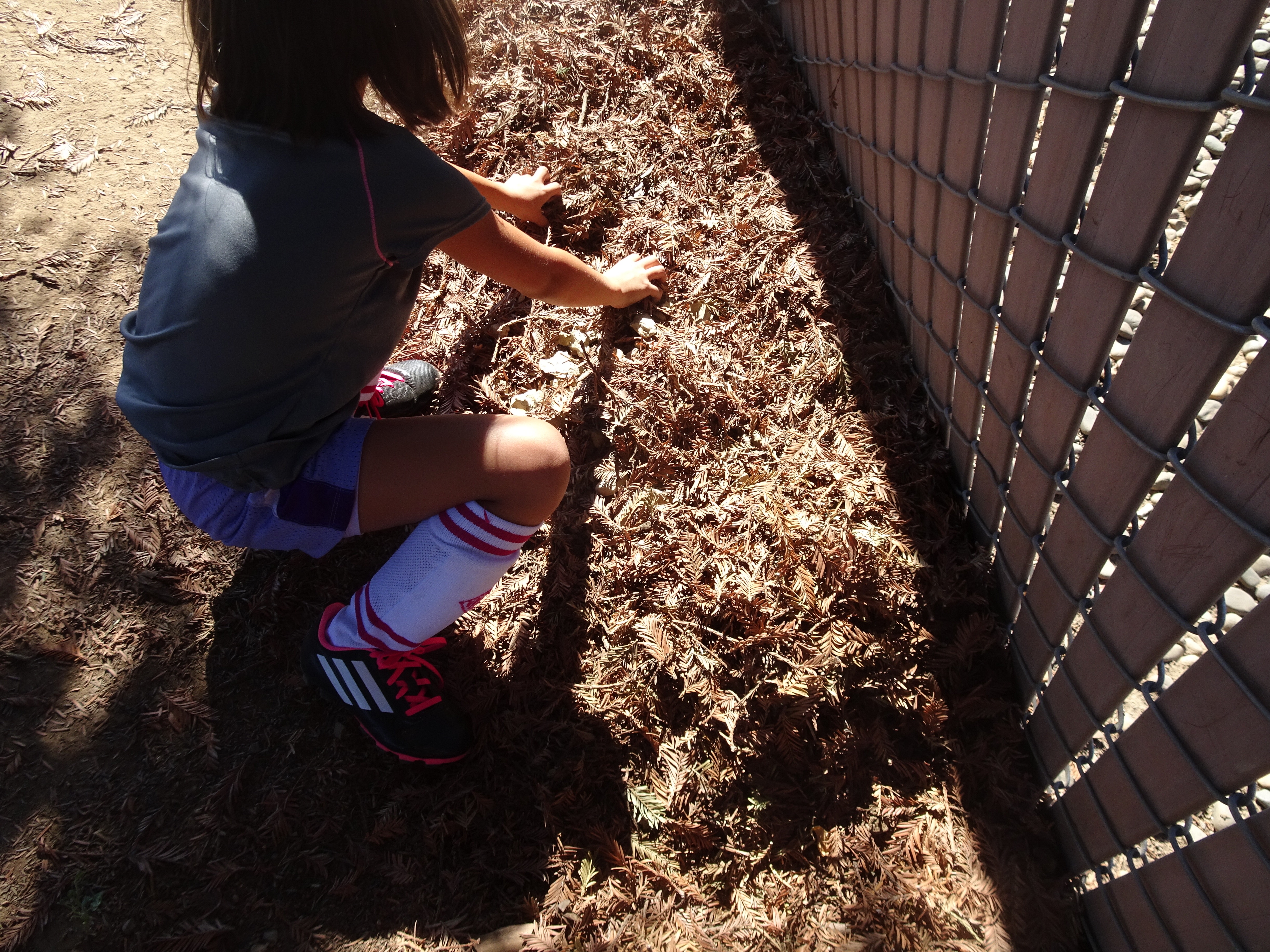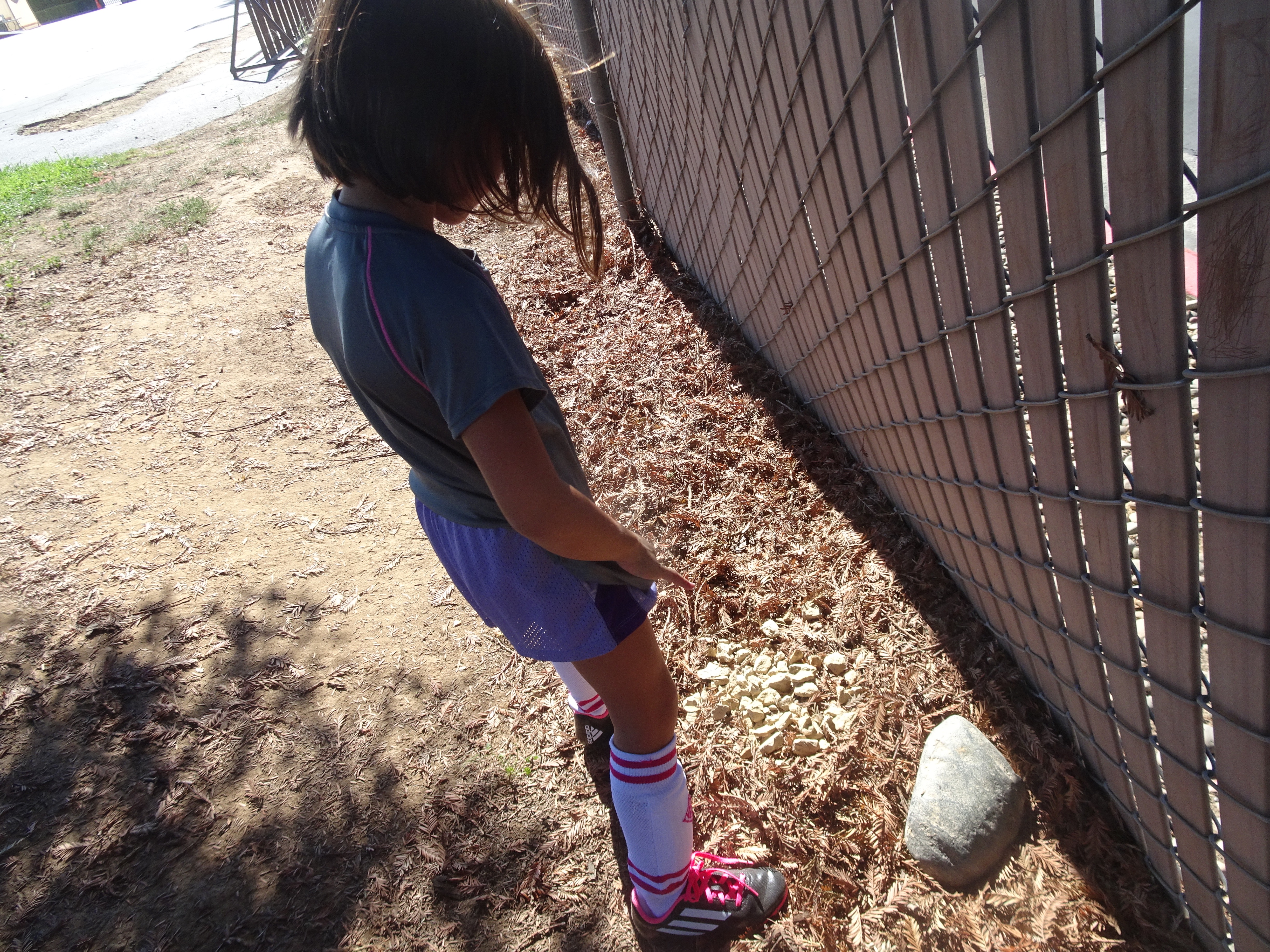 Meanwhile, Sophia went over to a row of trees and picked up a t-shirt-full of “chalk rocks”. She said it was a “second grade thing.” She took all the rocks to a farther-away location, dropped them on the ground,