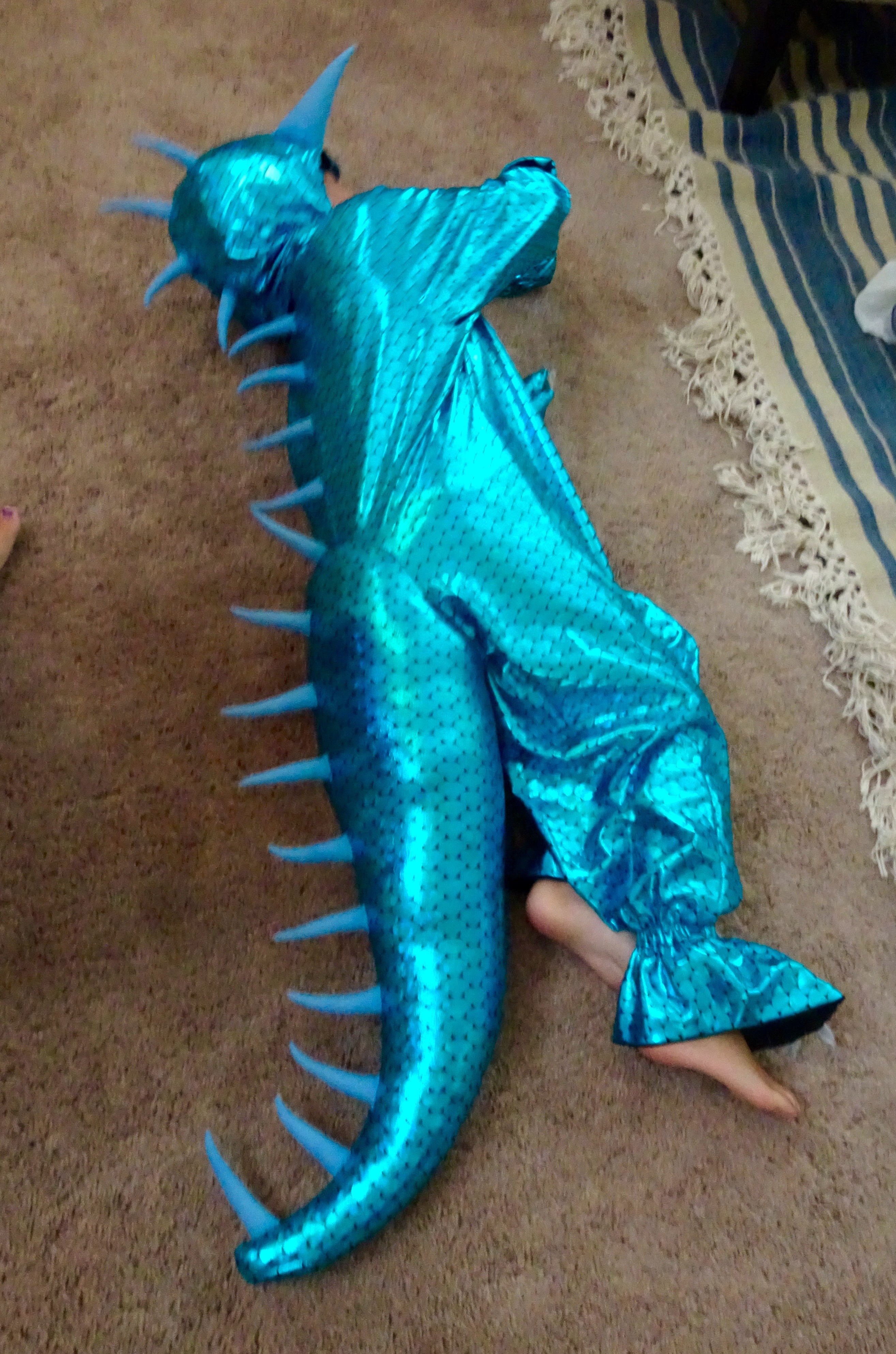 Dino down. A word about all those spikes: they are about 3 inches long, stuffed with fiberfill, and hand-sown on.