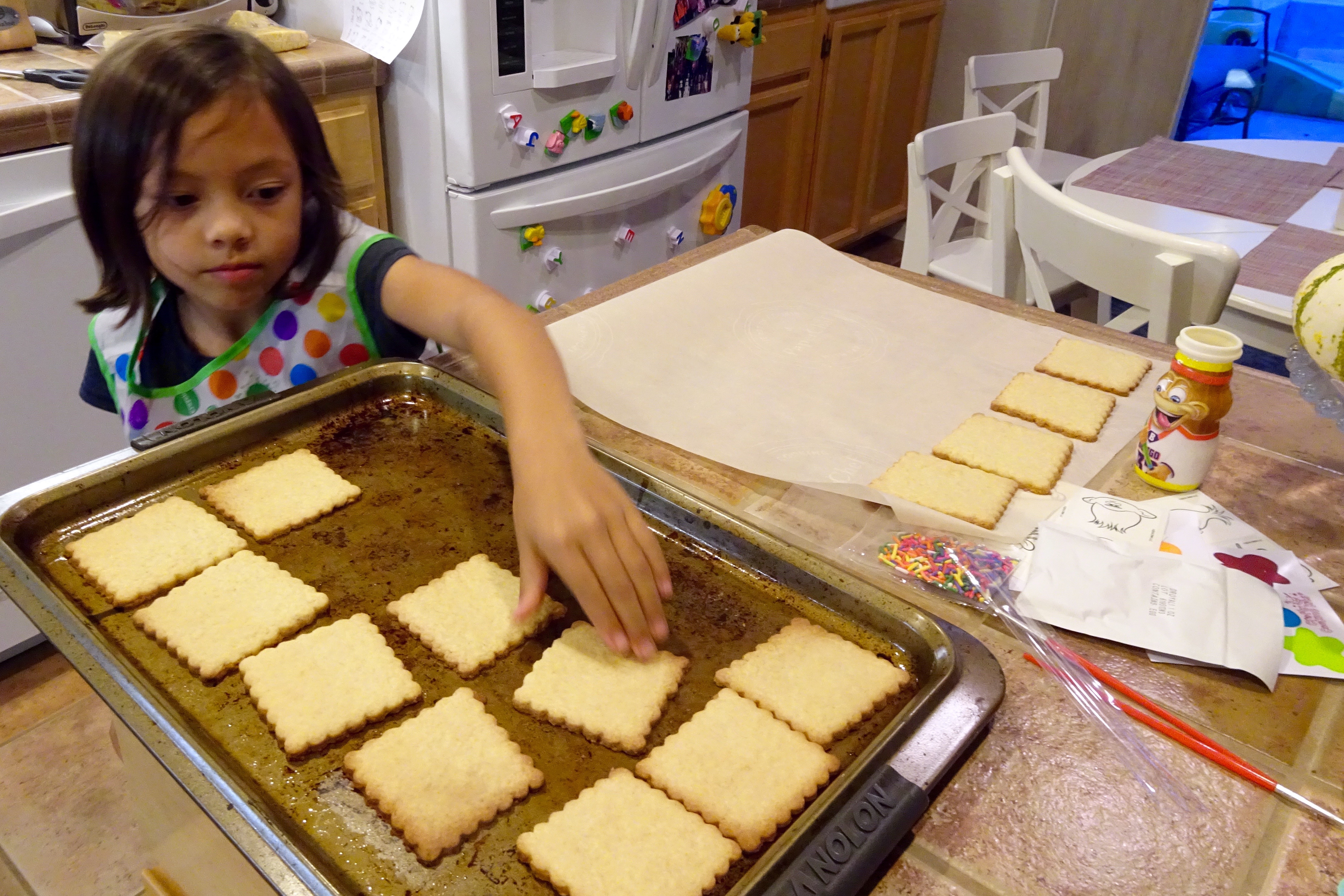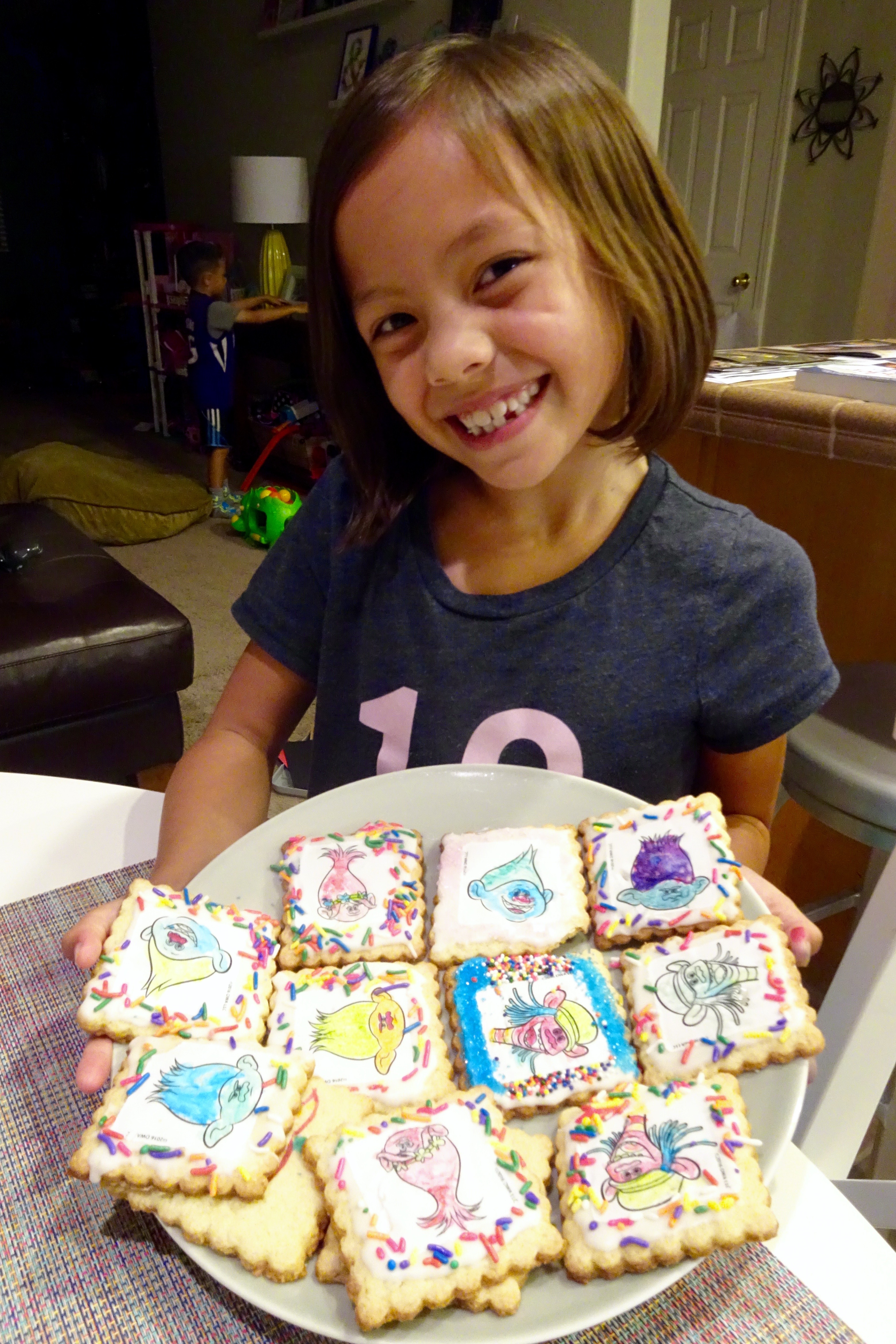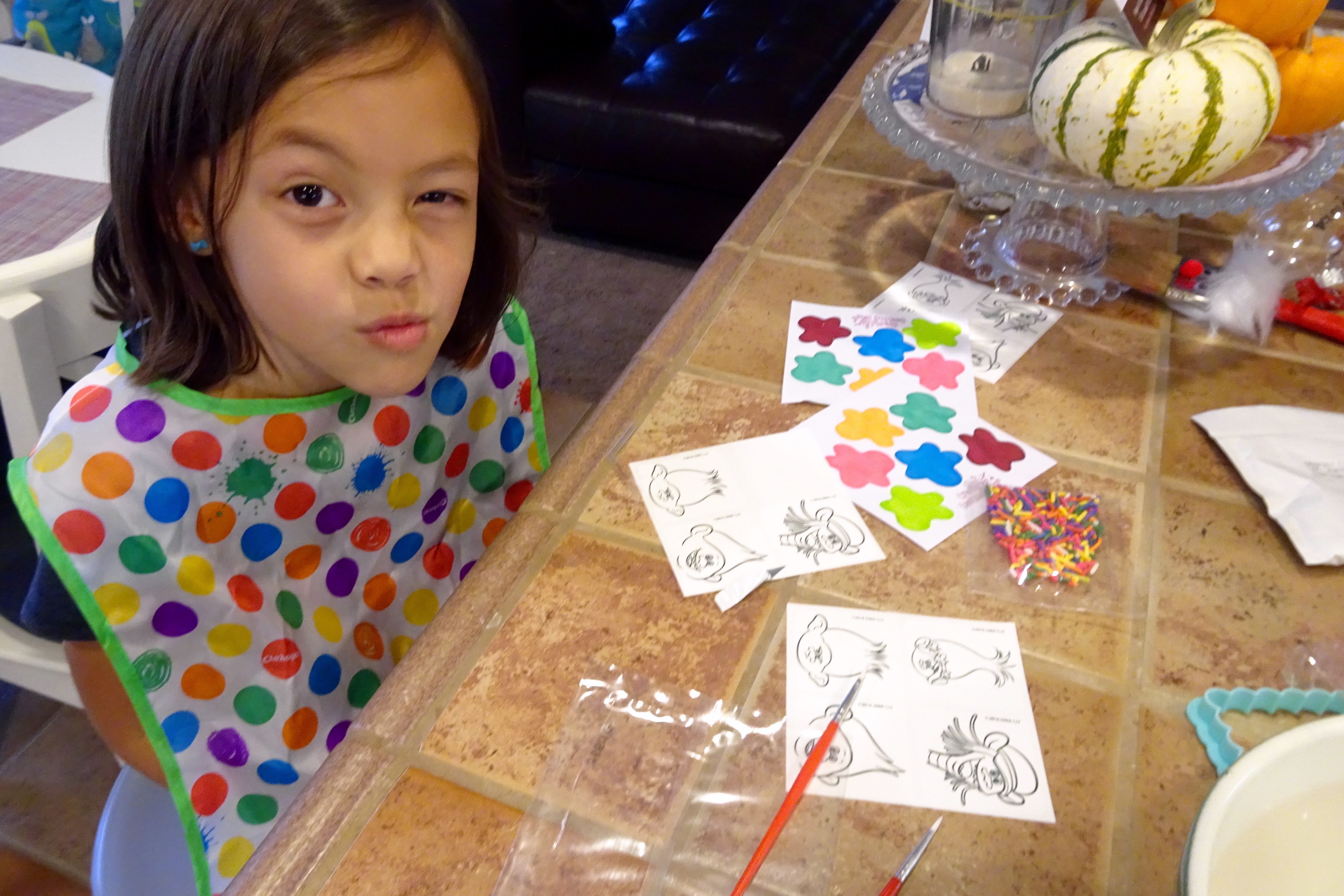 Sophia took everything out of the box – which made 10 cookies, but there were 12 edible decals. “Grandma, can I eat one? There are two extra.” Maybe break off a piece of the decal and see how it tastes. It tasted liked frosting and one decal disappeared.