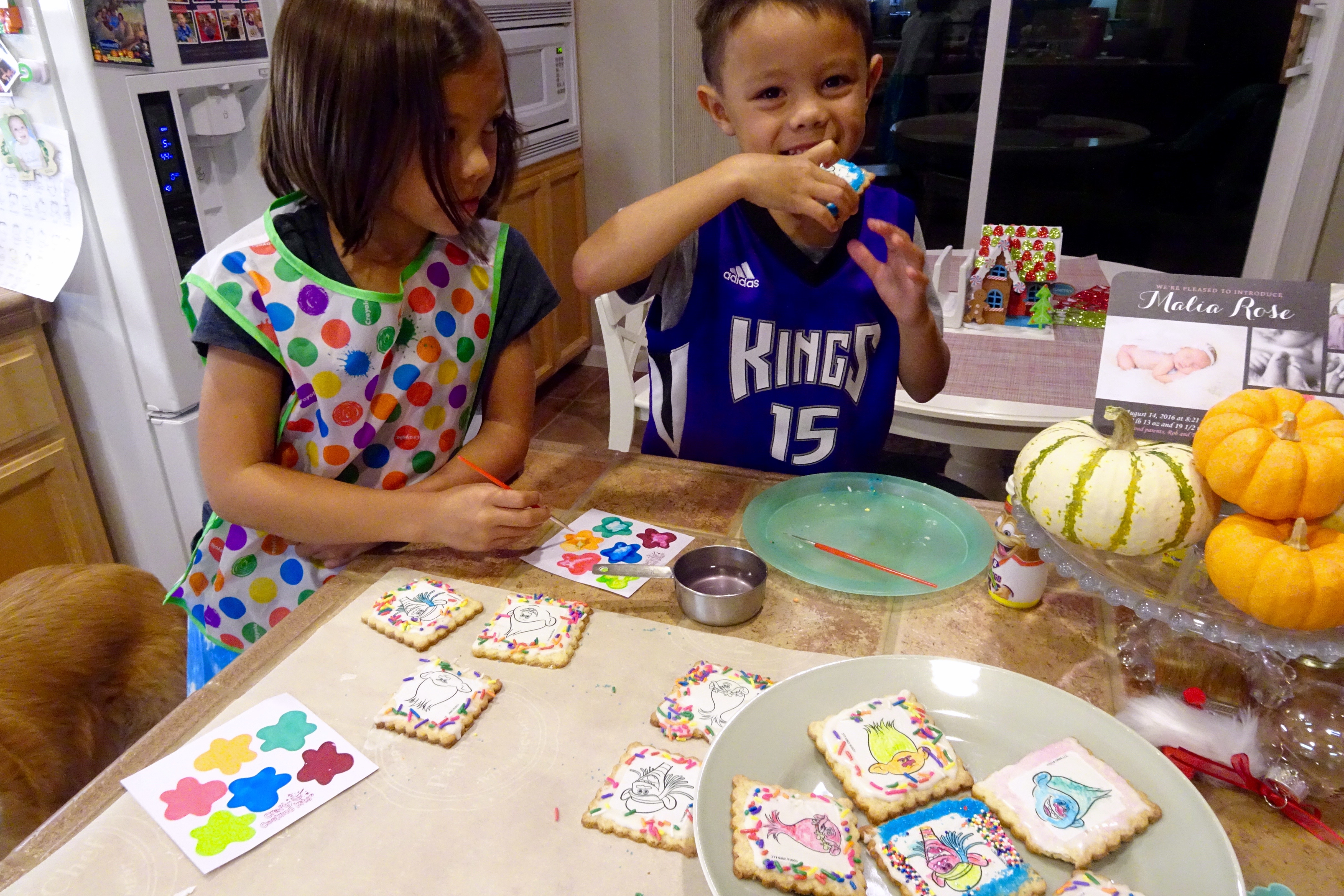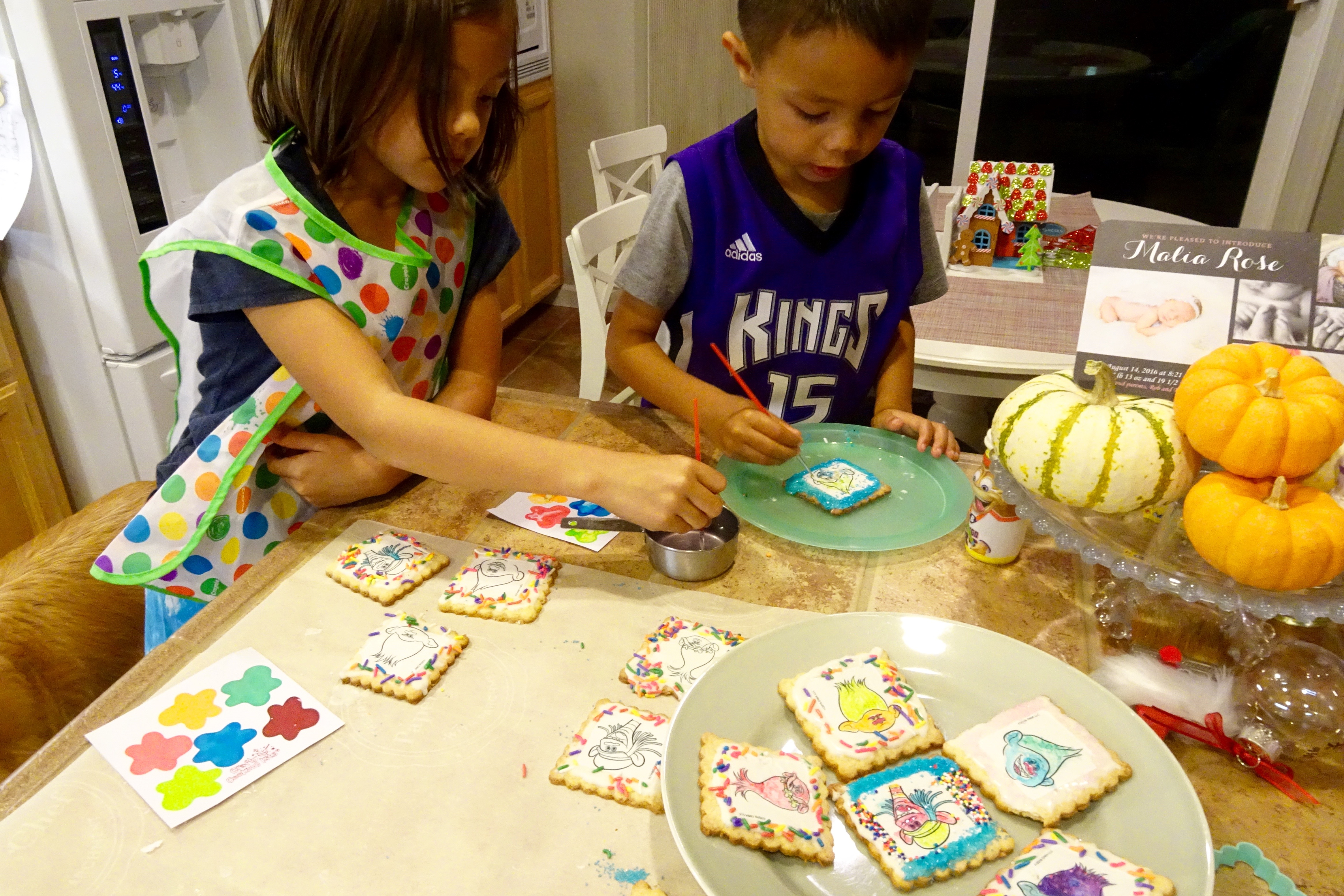 Last week, I had to go to Joann’s after Sophia’s soccer practice. I am a total weakling when it comes to buying crafts for them to make. Sophia chose a gingerbread house made from foam pieces. Avery chose sugar cookies decorated with trolls. Today after school we made the cookies.