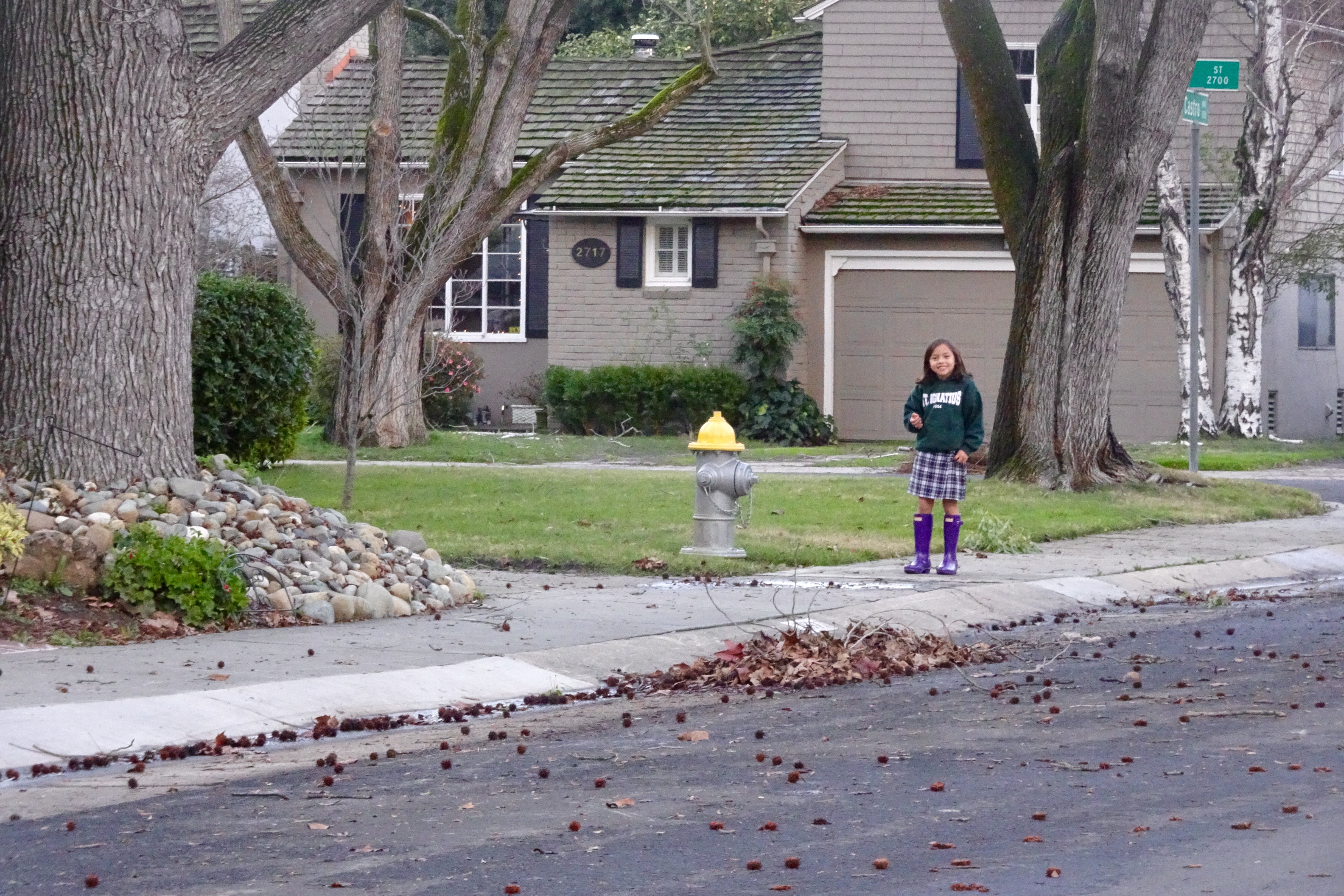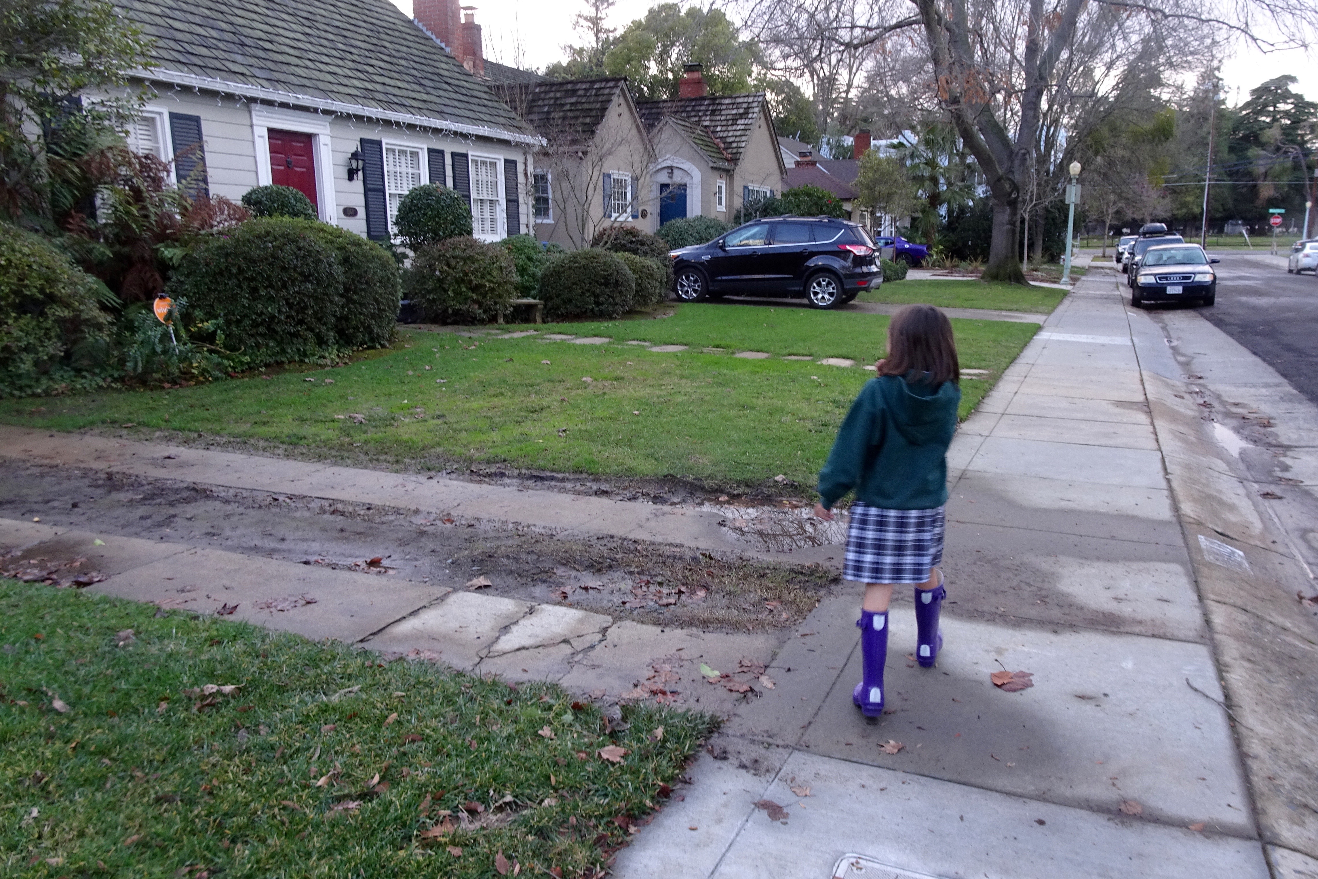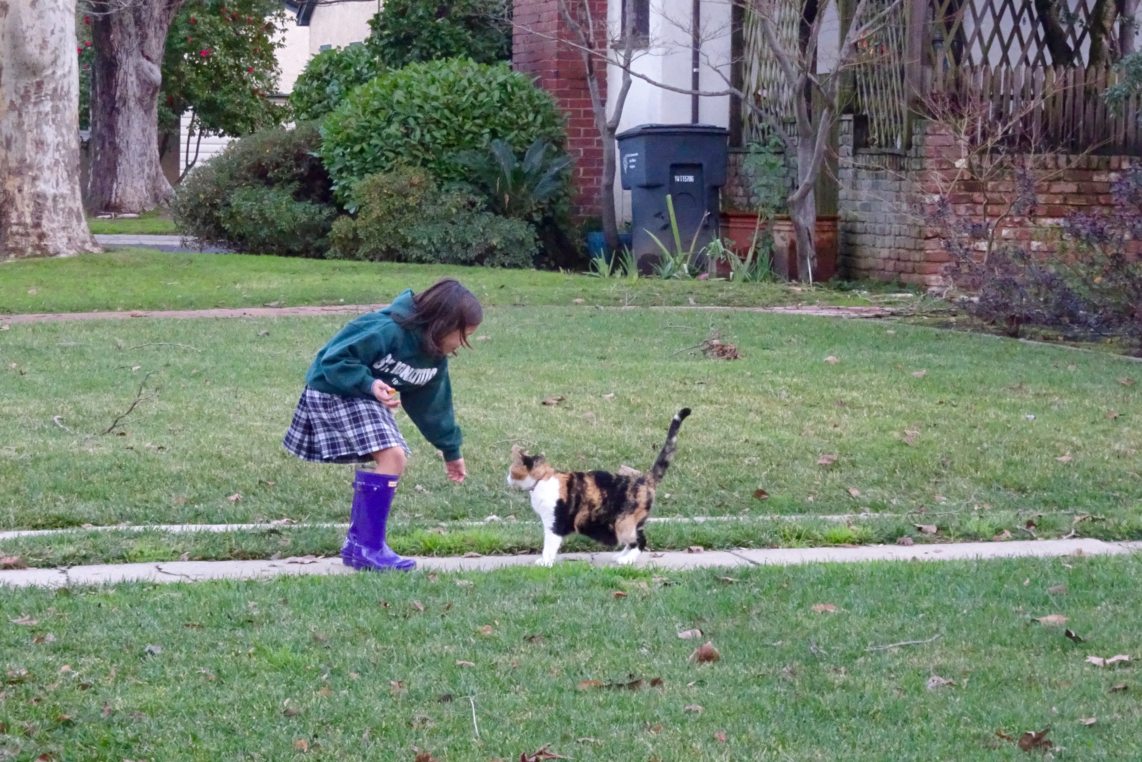 I took Sophia for her ukulele lesson this afternoon. We were early so she wanted to go look for the friendly cat who followed us one afternoon several months ago. I thought this was a long shot, we don’t even know which house the cat belongs to. Up one side of the street