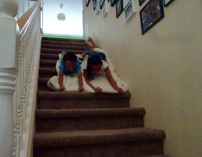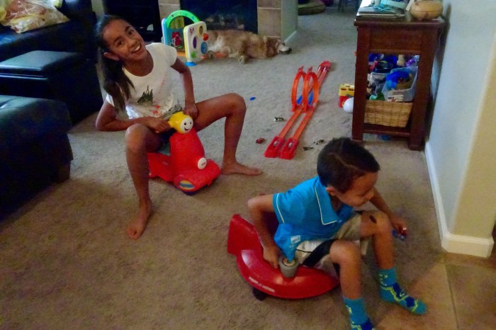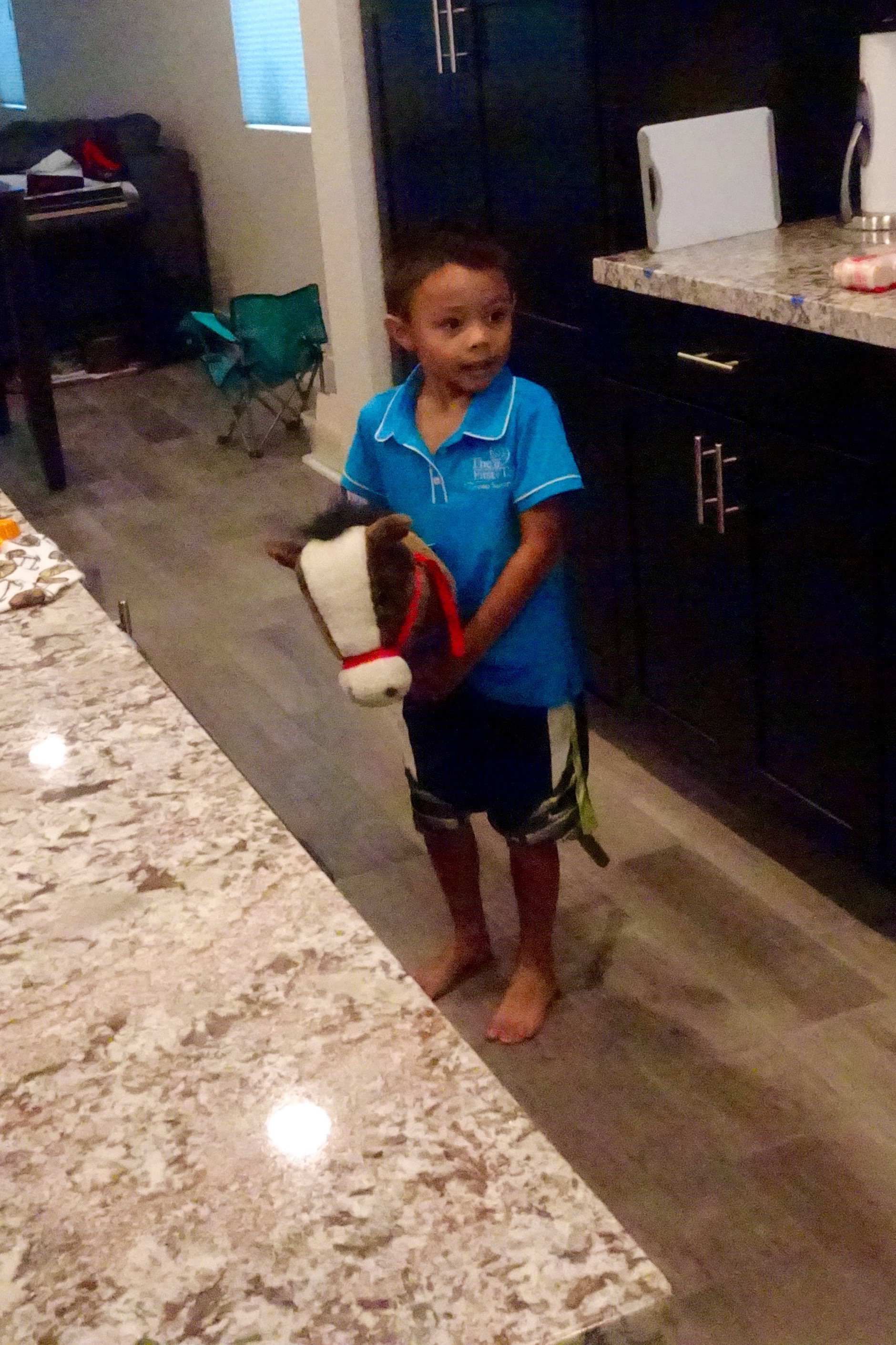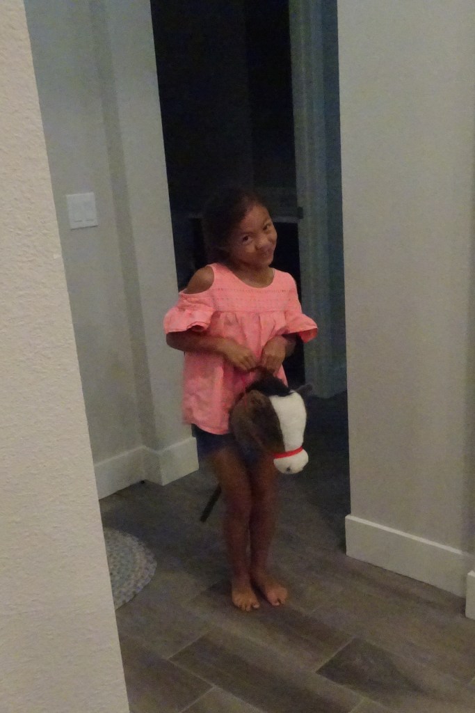 Time for several games of Hide and Seek. The “it” person rode the stick horse and pressed one ear or the other to make clippity-cloppity sounds or a lot of neighing.