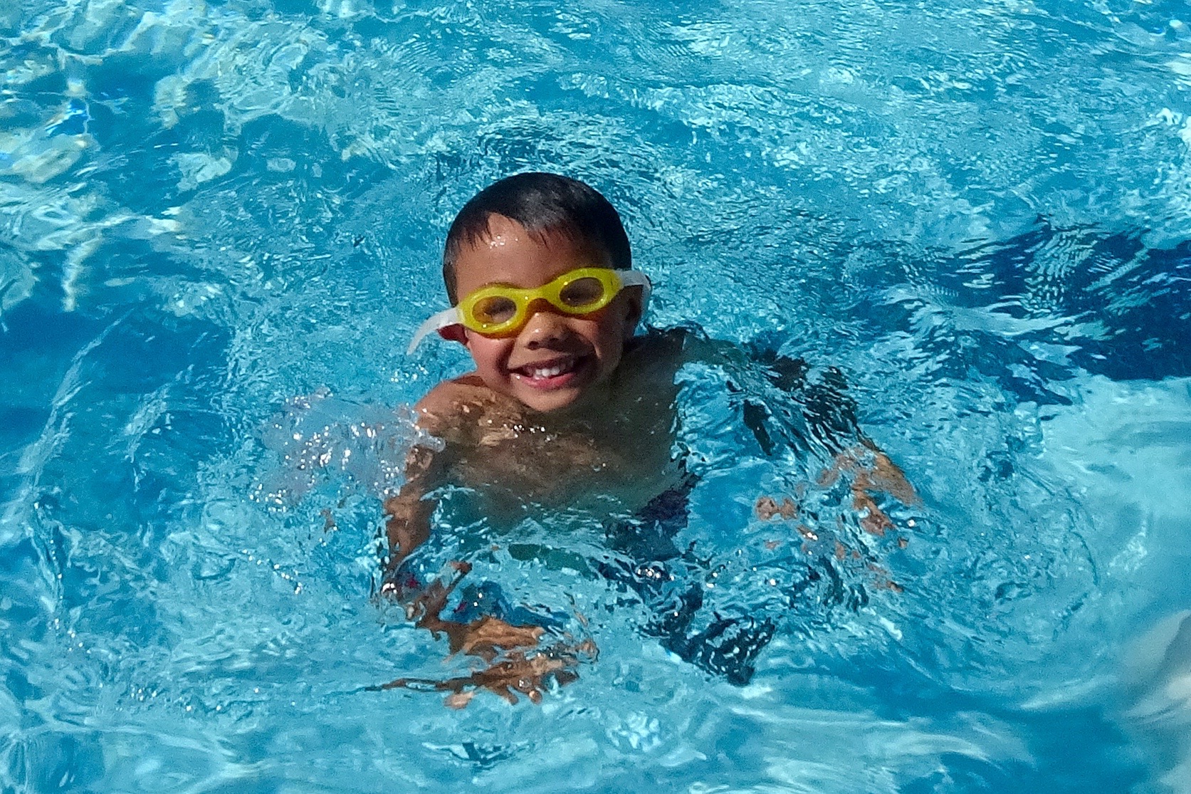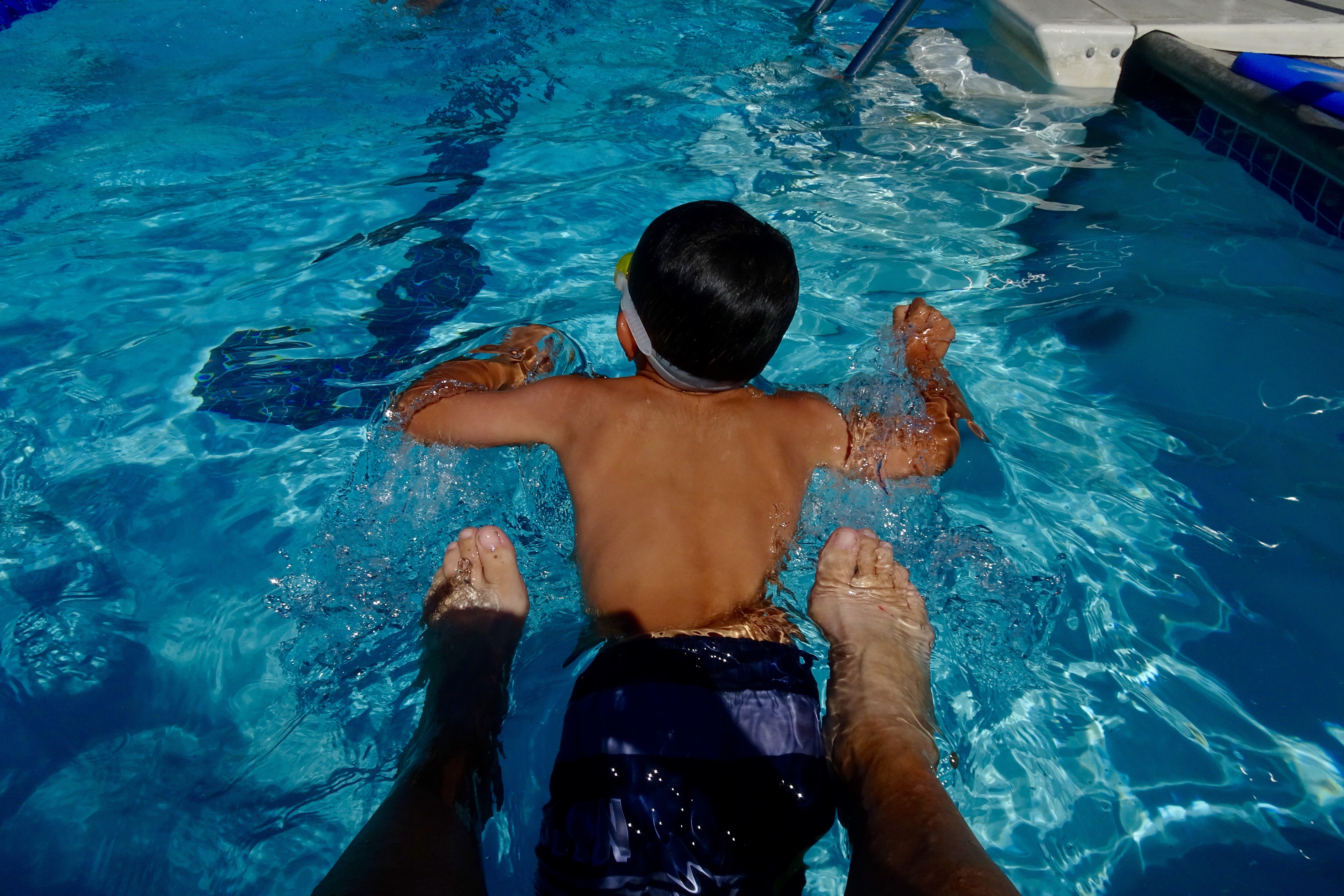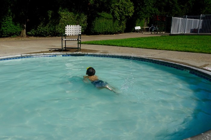 We make a couple of rotations from big pool to hot tub (no bubbles please) to baby pool (where he swims more like a hippo, feet and hands touching the bottom when needed.