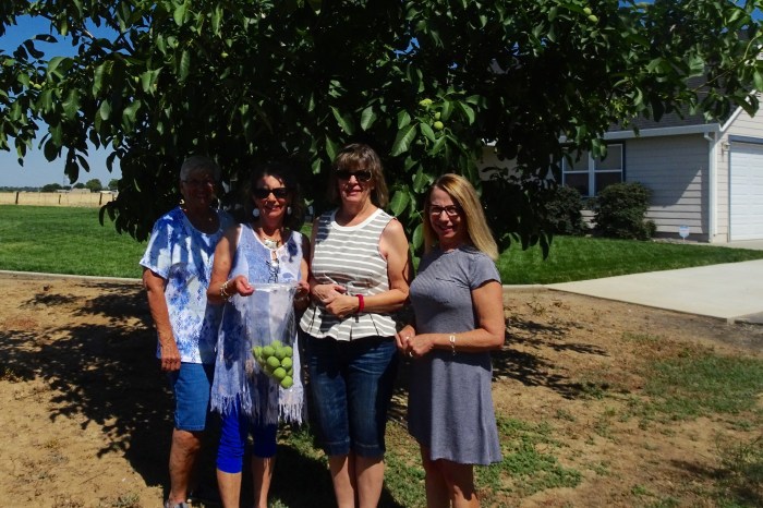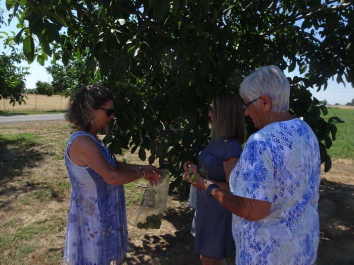 In (limited) keeping with ancient nocino tradition, this year five (not) barefoot (not) virgins gathered the green walnuts: Phyl, Maria, Val L, and Val S.