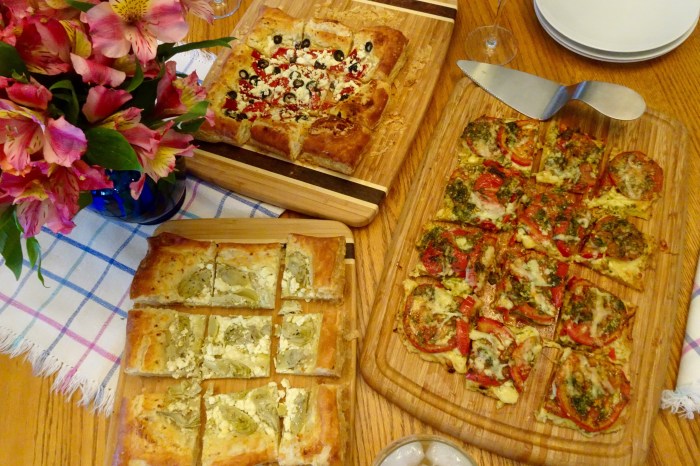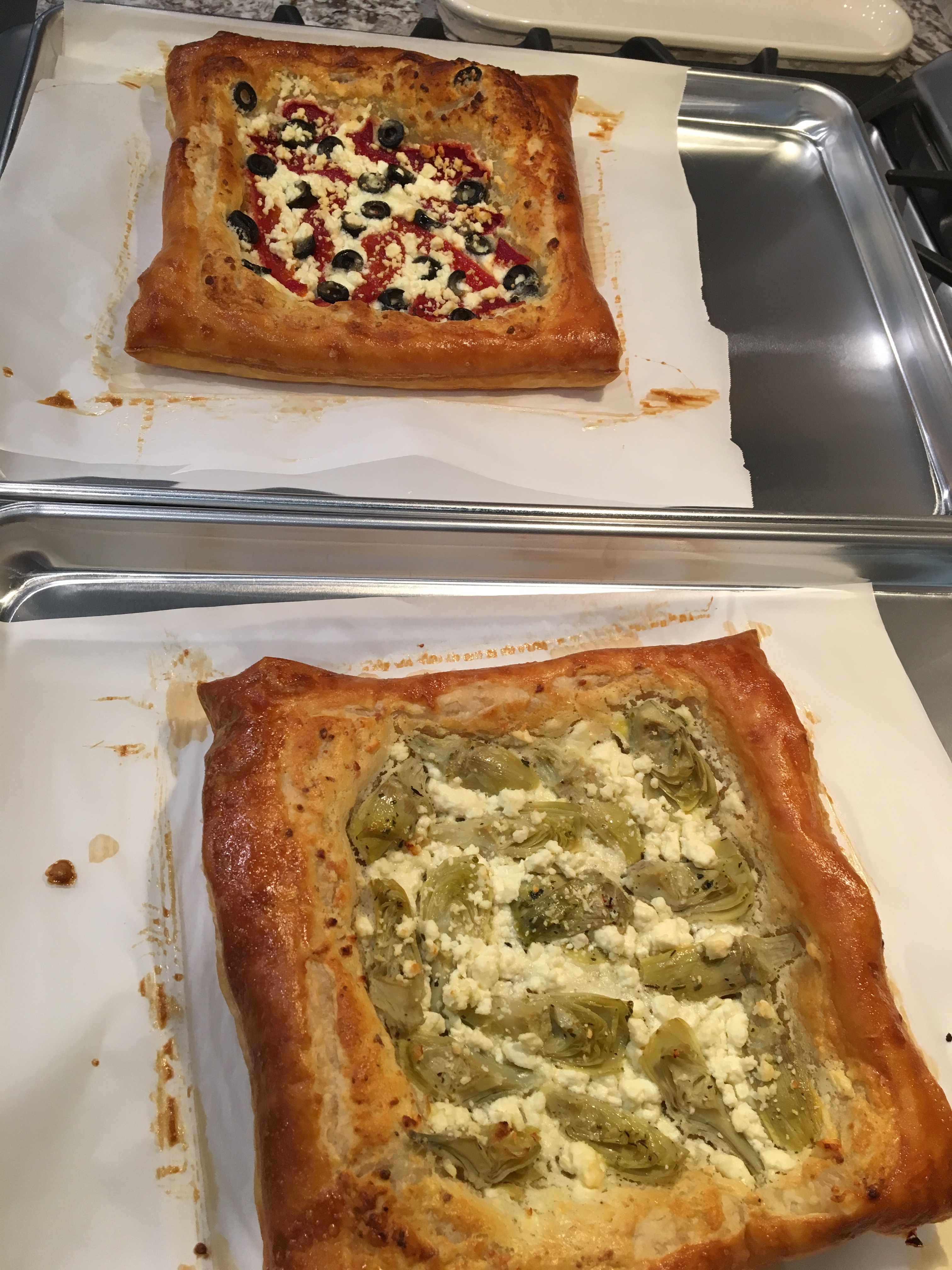 I think Merrilyn called today a Tartapalooza. She made Tomato Gruyere Tart on a pie-crust base. I made Artichoke Feta Tart and a variation with roasted red peppers and black olives on puff pastry.