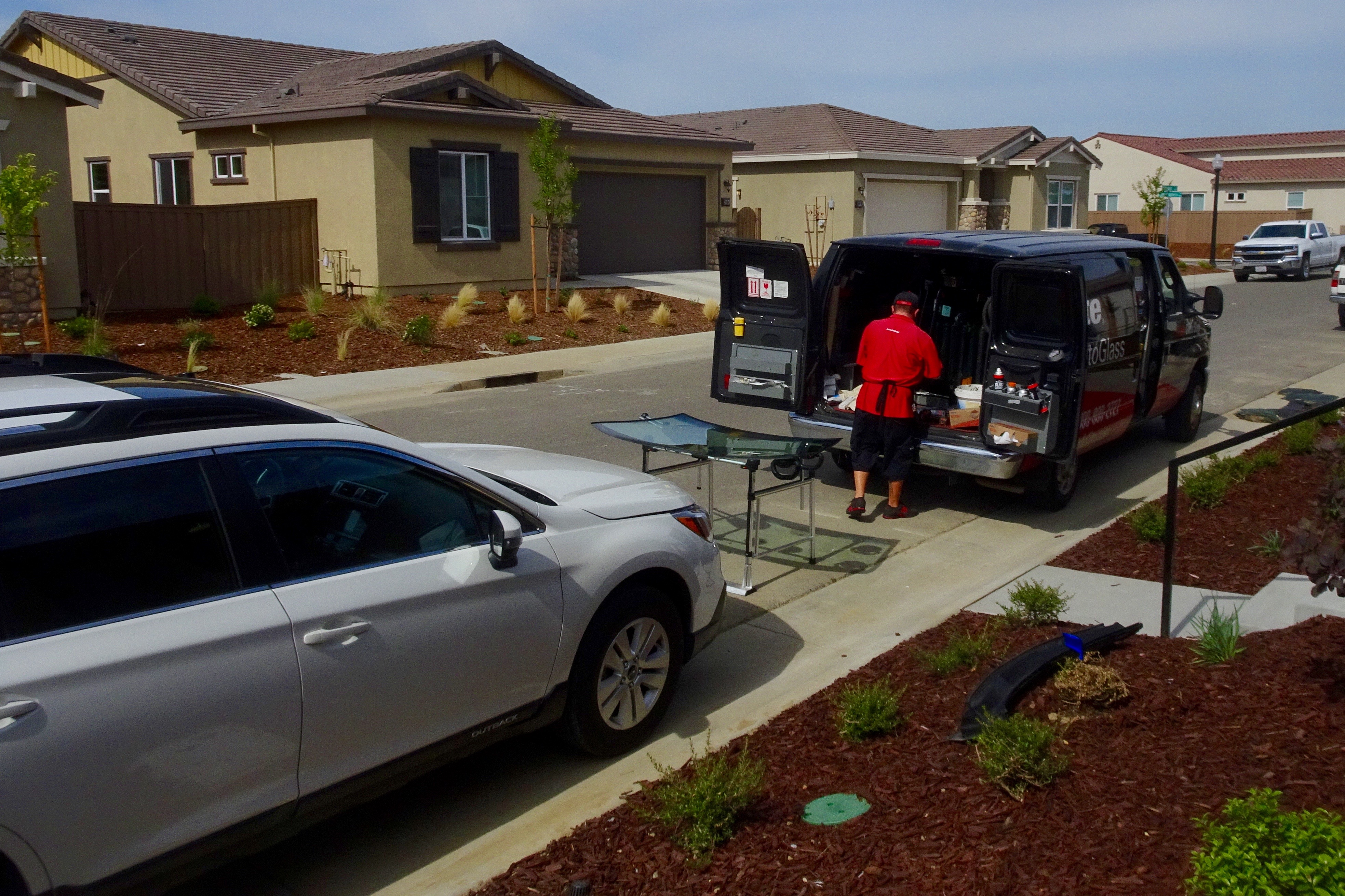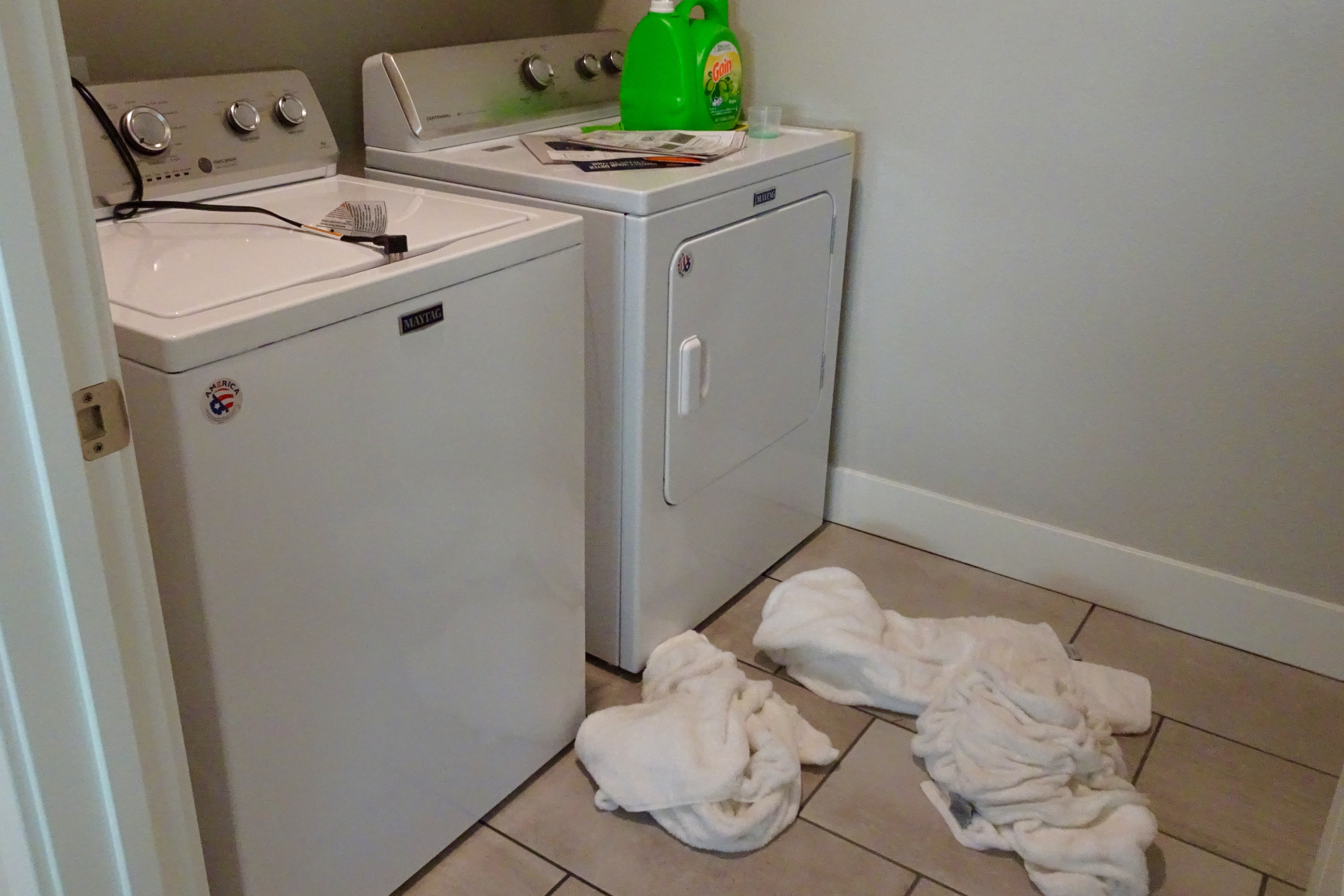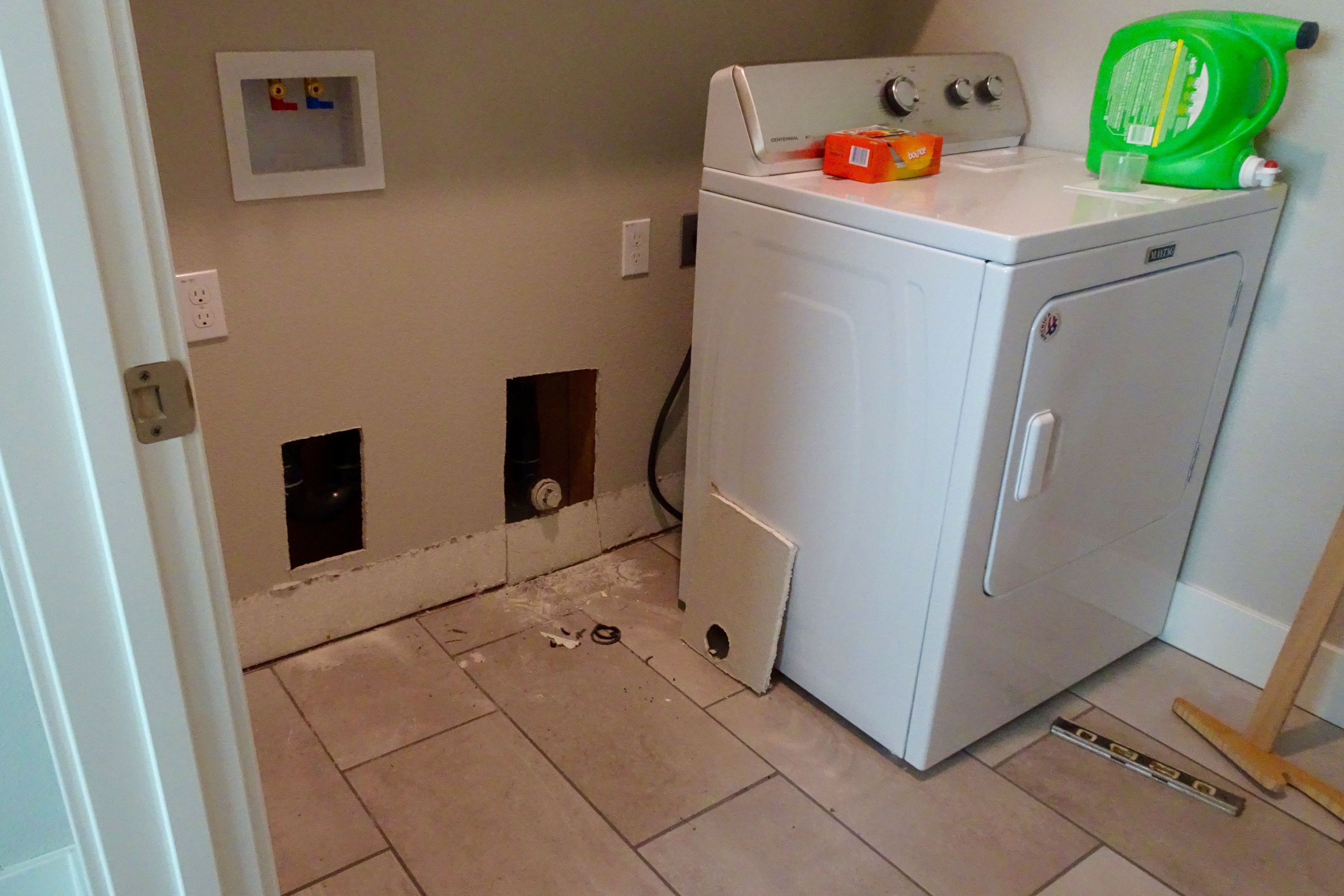 Thank goodness I was home (but out in the garage) when the new washing machine overflowed on the first rinse cycle of the first load. The installers returned immediately to check their work. It wasn’t their fault, but rather something in the wall. Uh-oh.
