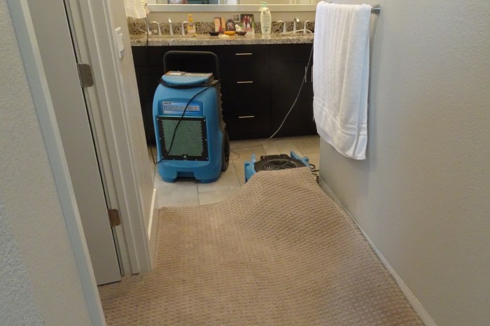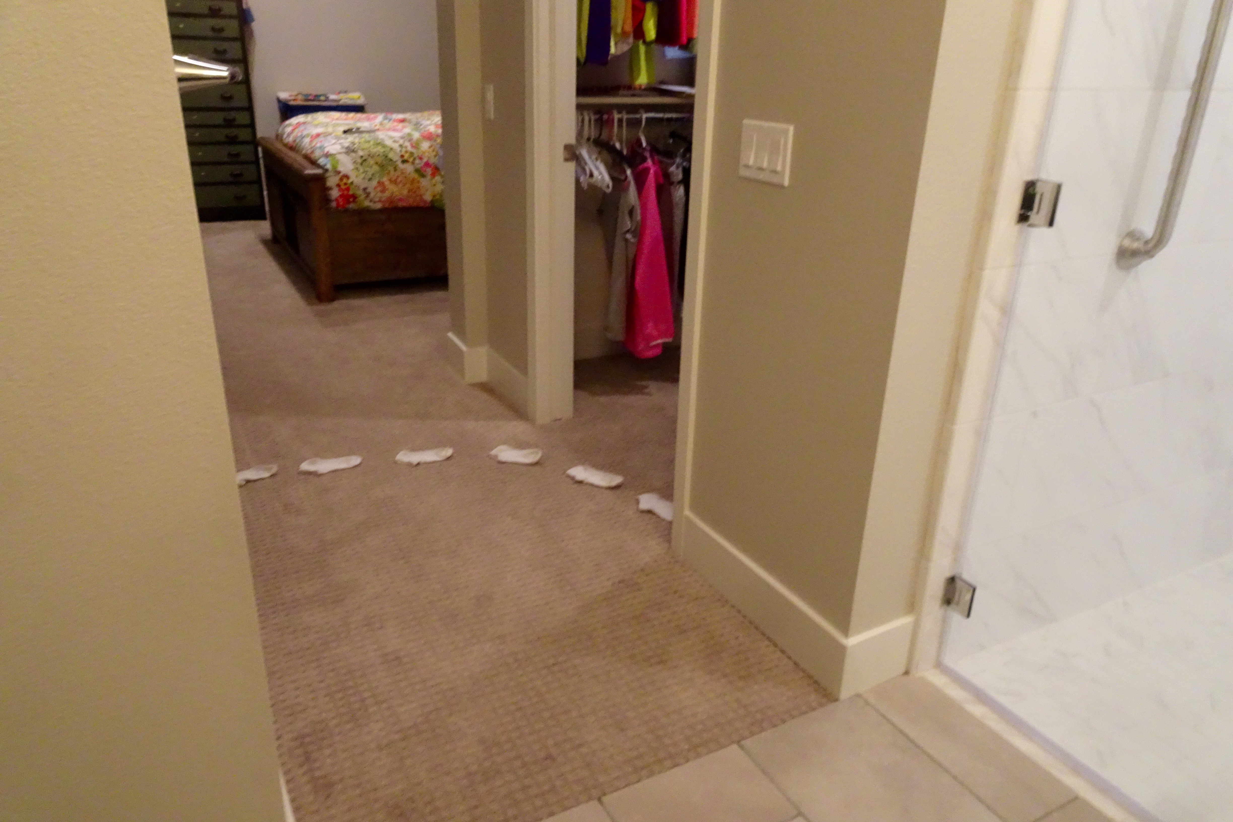 Water onto the tile floor was easily mopped up but water also seeped out the back wall into the bedroom hallway. And it stayed wet all weekend.