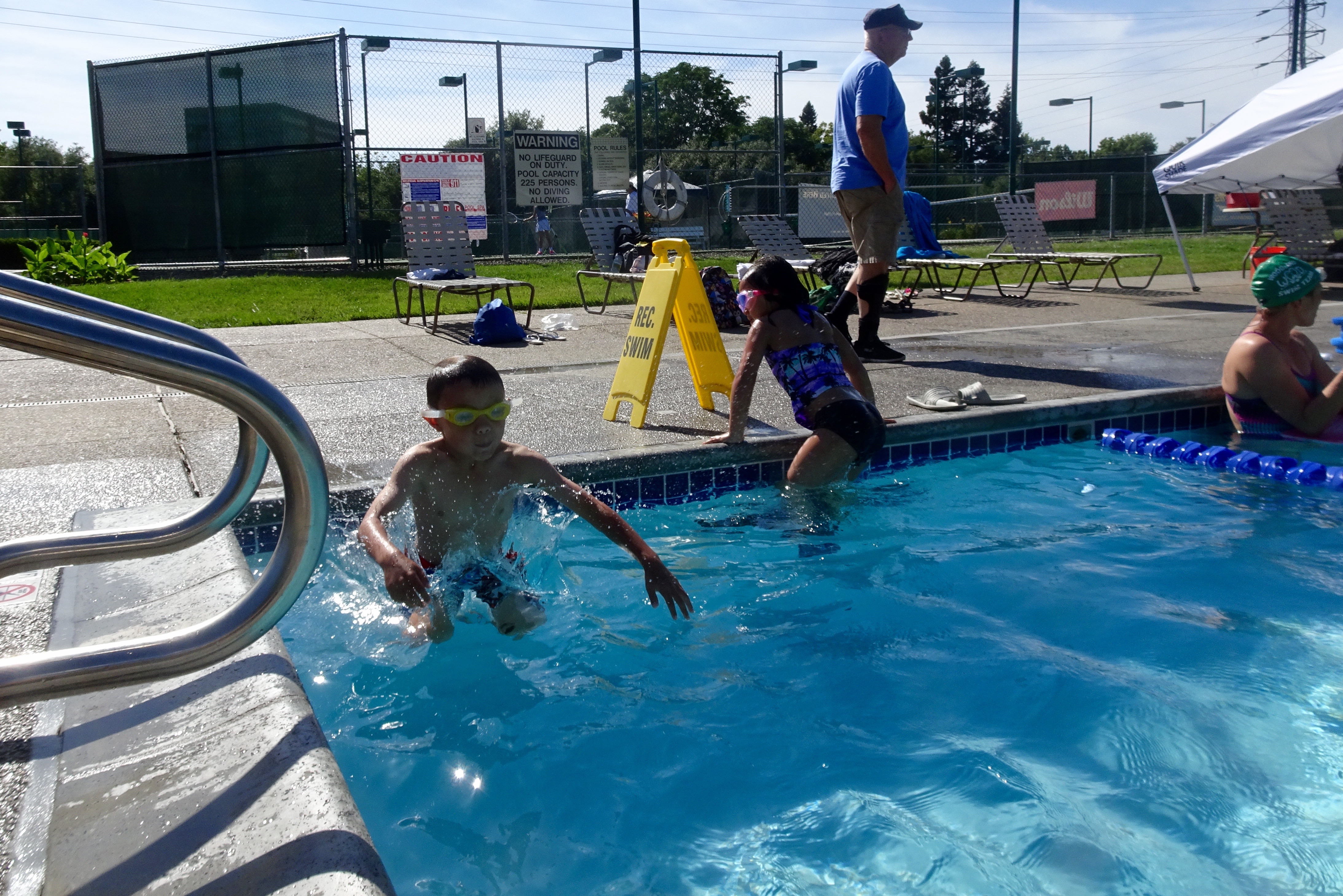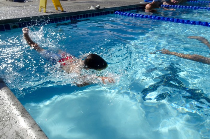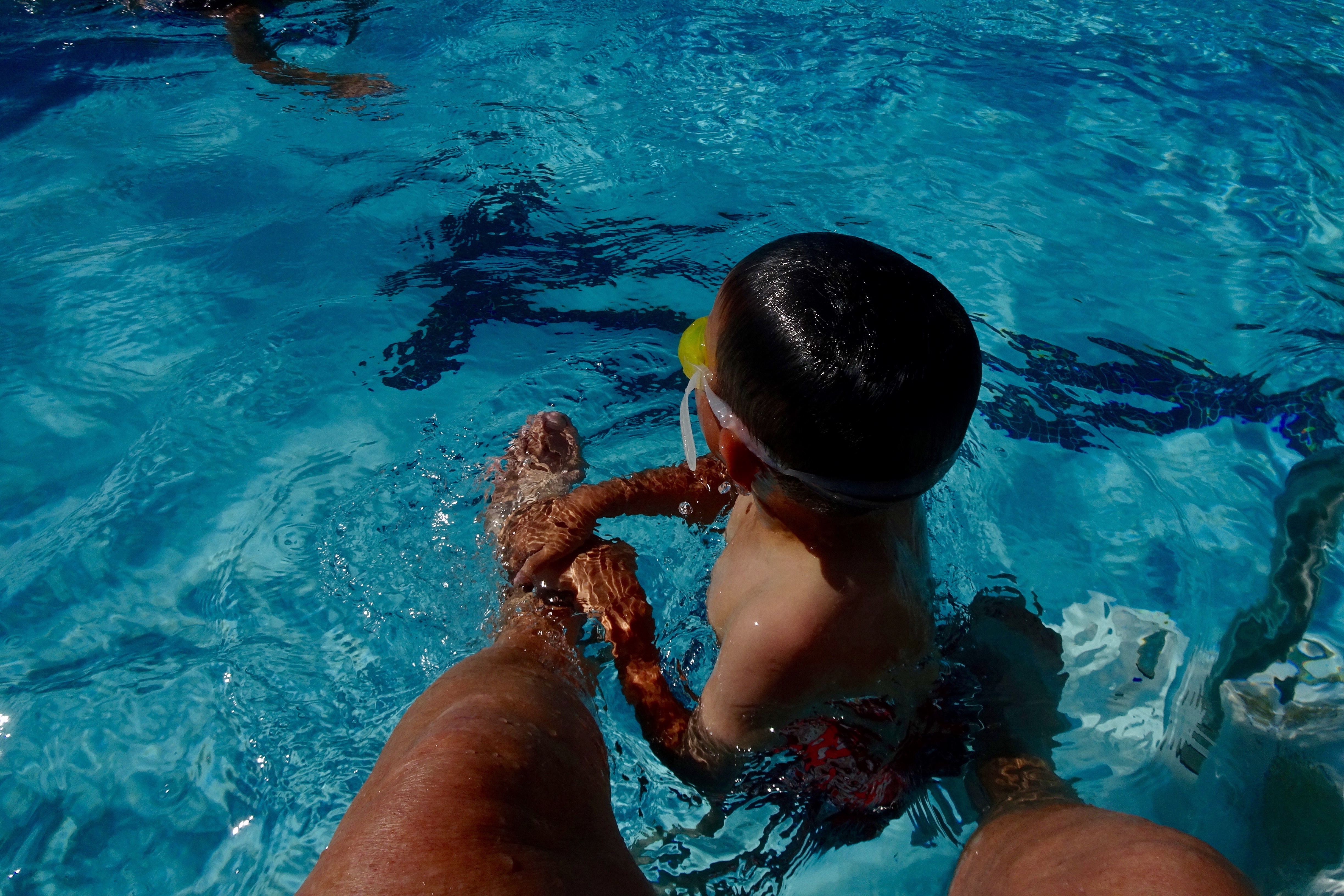 While Sophia is at the swim team practice, Avery gets a lot of swim practice in his corner of the pool.