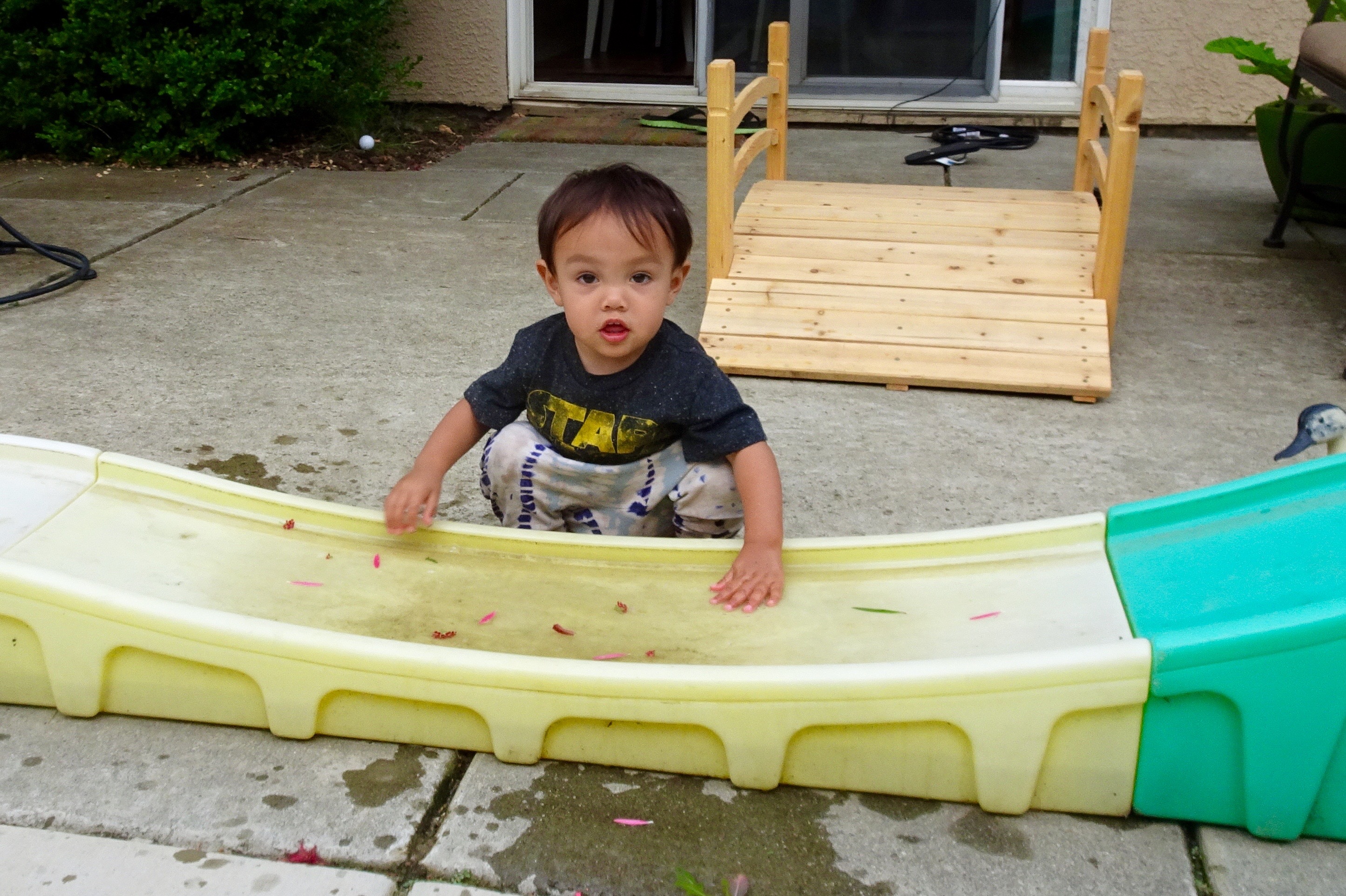 I like to sit at the edge with my feet in the water (it’s SO hot out there) and provide a leg to grab onto. Avery also likes to sit on both feet and be “launched.”
