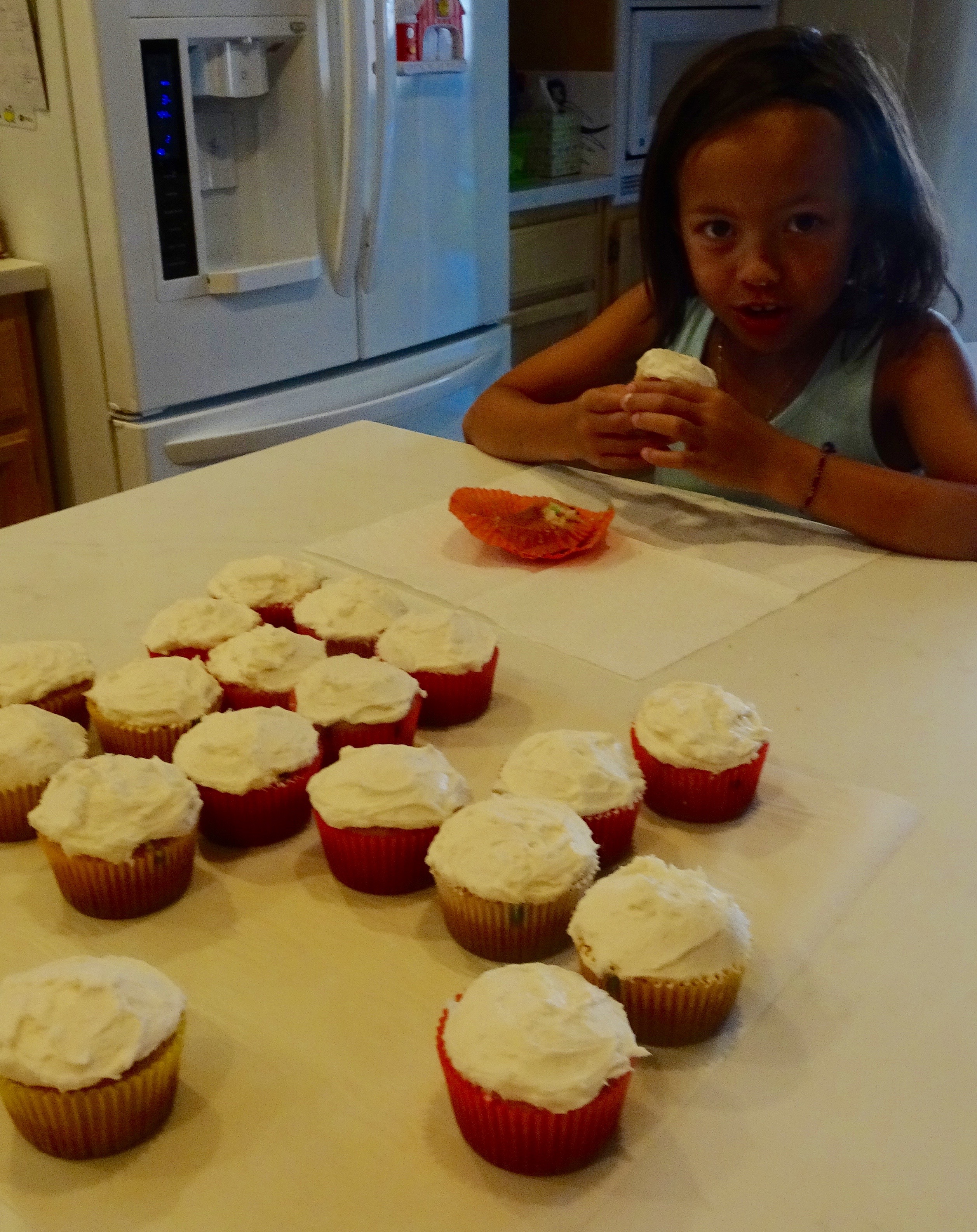 Except that I pretty much did the whole recipe, from a cake mix. Sophia taste-tested the first frosted cupcakes.