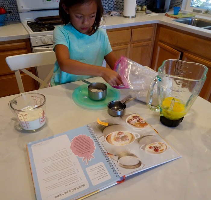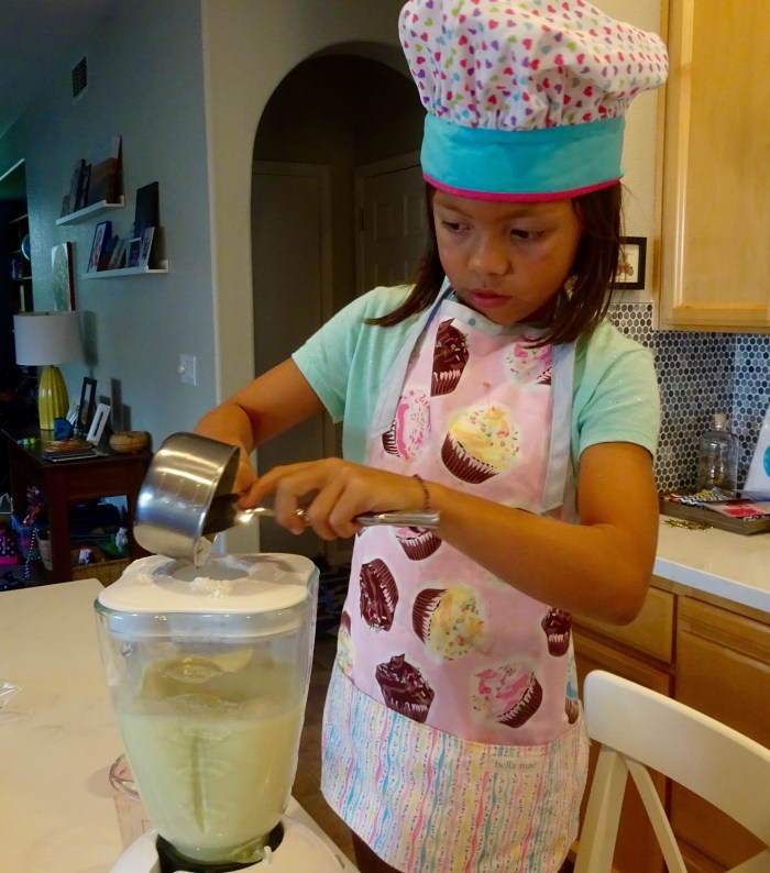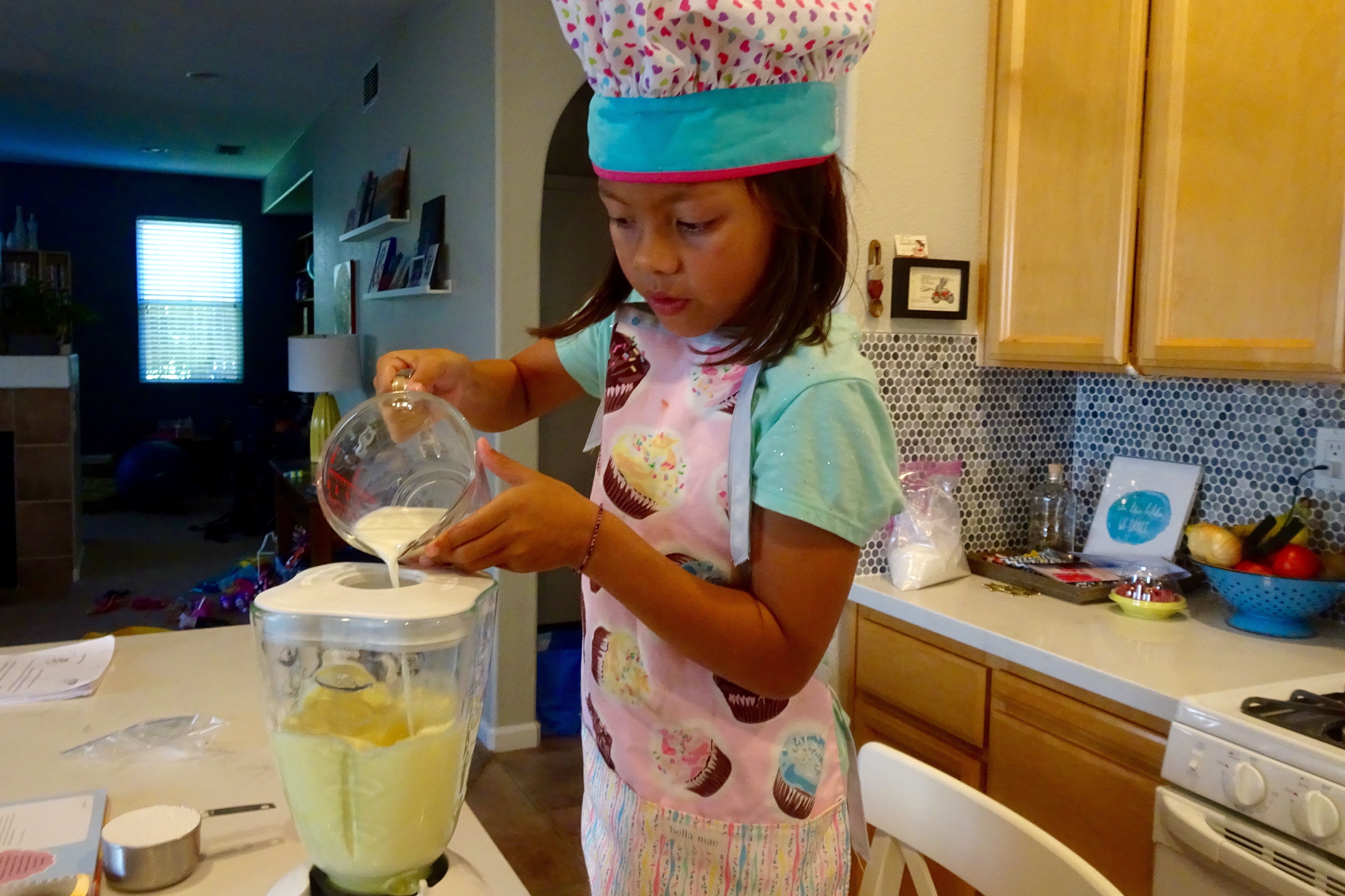 Before the next step, Sophia had to change into more appropriate clothing. Slowly add the milk to the eggs in the blender.