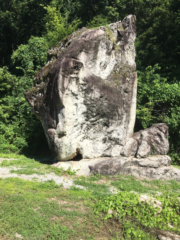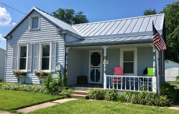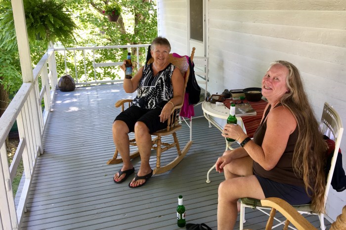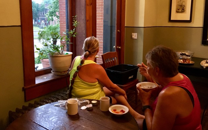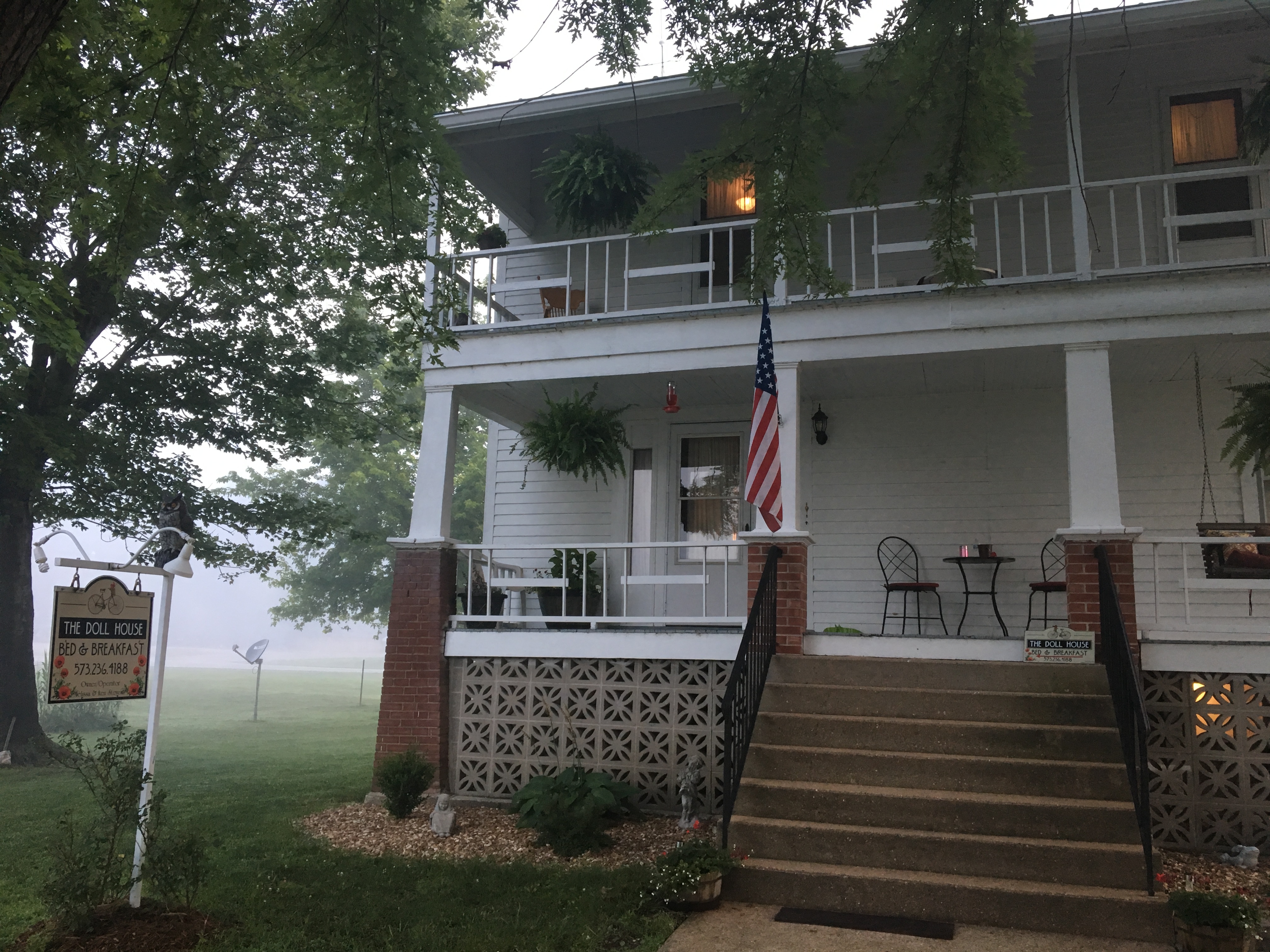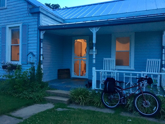 We arrived in Marthasville shortly after noon in blasting heat – ugh – 93 degrees but feels like 97, 49% humidity. Tonight we’re staying at Little House B&B and have the whole place to ourselves. Those bright colors on the porch: our laundry drying in the natural heat.