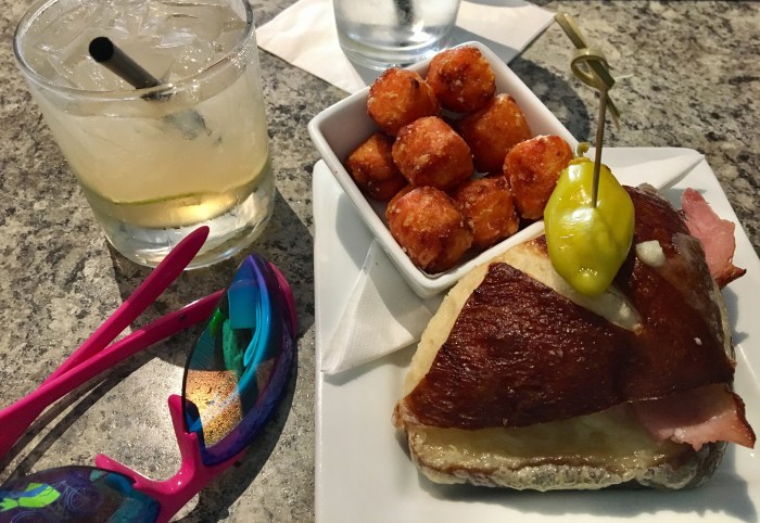 Ham & Swiss sandwich, sweet potato tots, Dr Feelgood cocktail.
