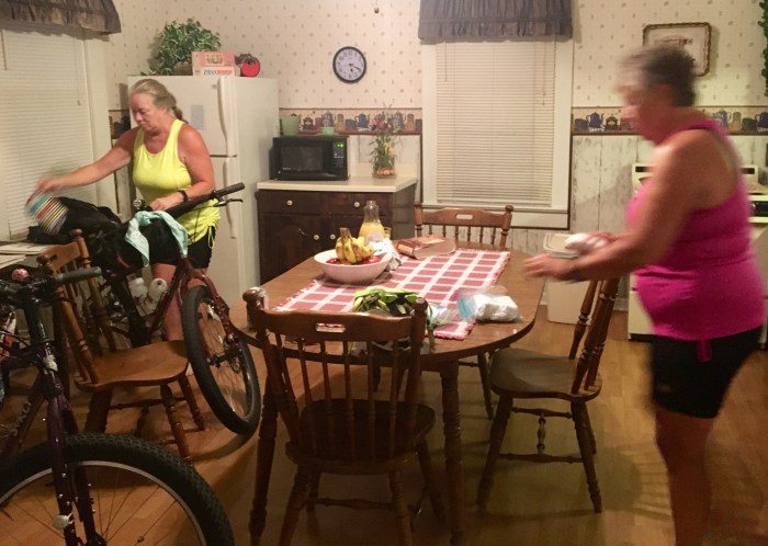 Donna got a flat tire. Neither Billie nor Donna could get the tire off the rim. A male cyclist stopped to help and got the tire off the rim. Getting the repaired tire back onto the bike proved to be difficult, but finally it was on … however now the brake was rubbing and her cyclometer cable was broken. She slogged 27 miles into Jeff City and went straight to Red Wheel Bicycles for a good repair job. Miles = 39.