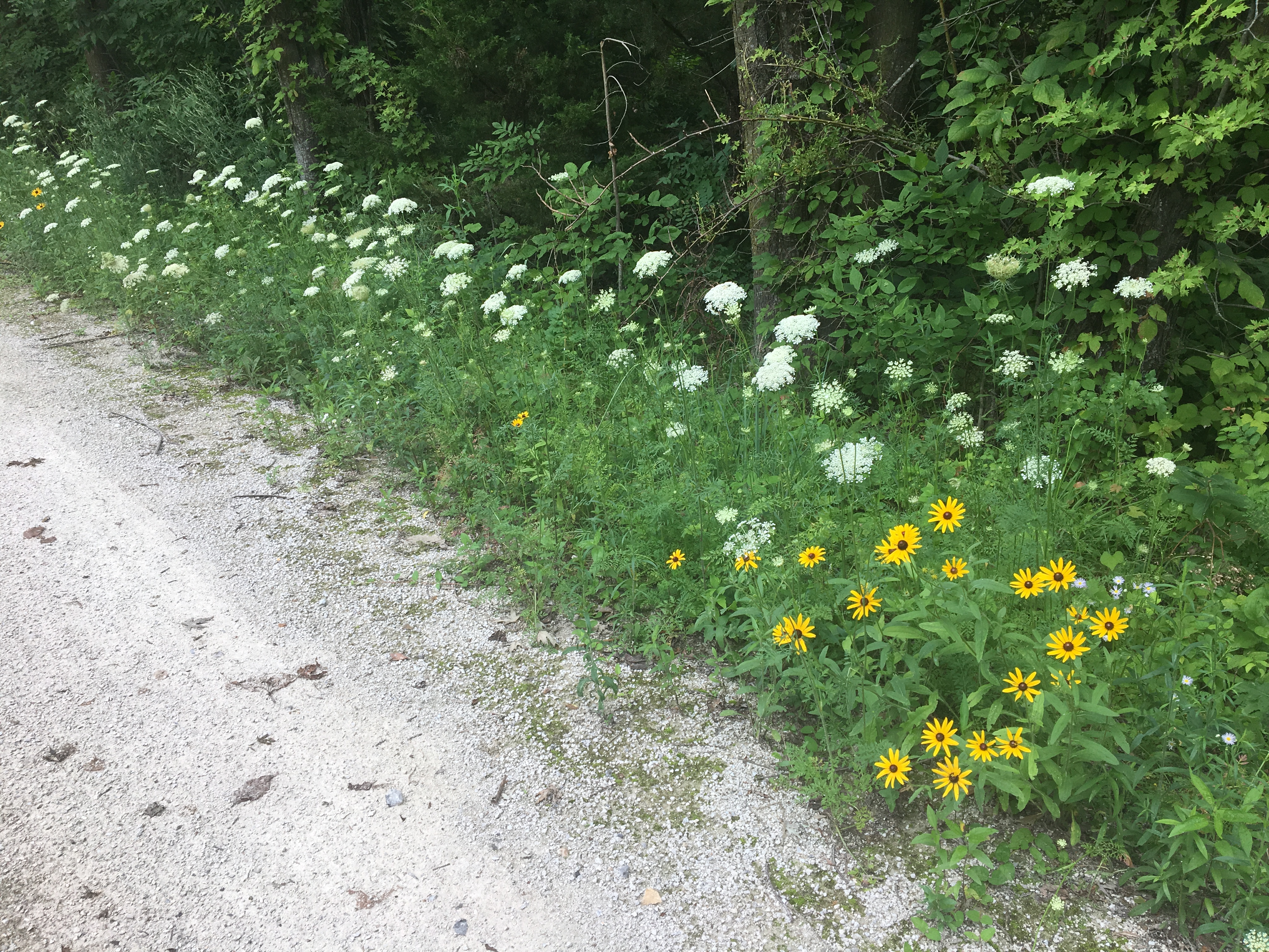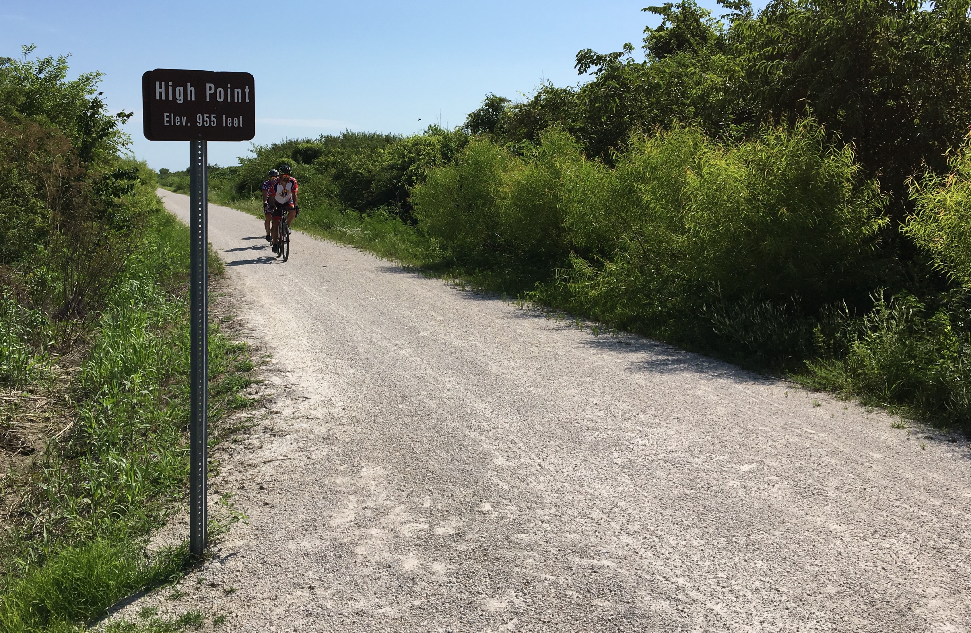 Today’s ride was uphill for portions (7mph) then downhill (13mph). I thought this “High Point 955 feet” would be good news since the temperatures were climbing and tree cover was more sparse, but no. The ups and downs continued.