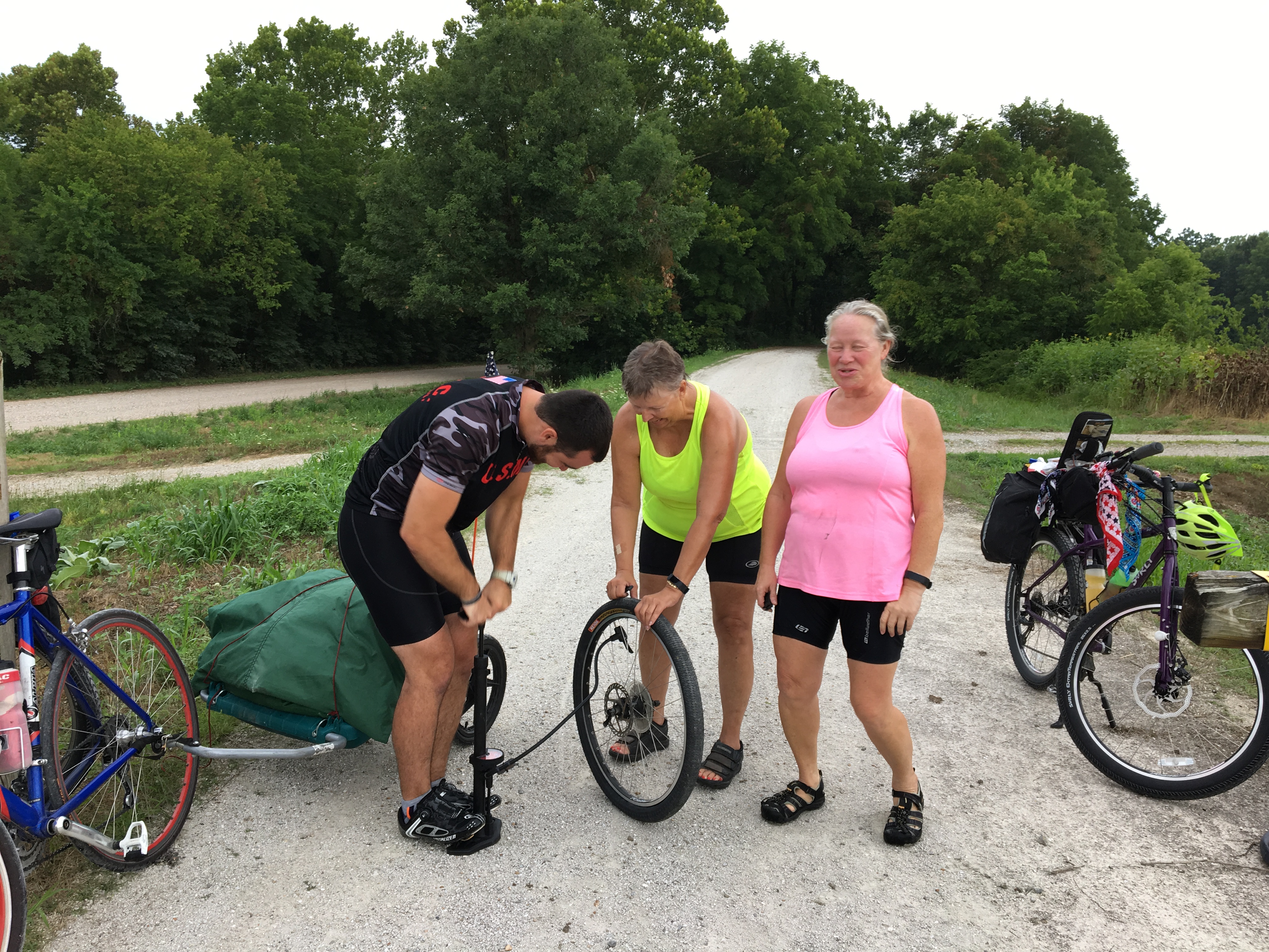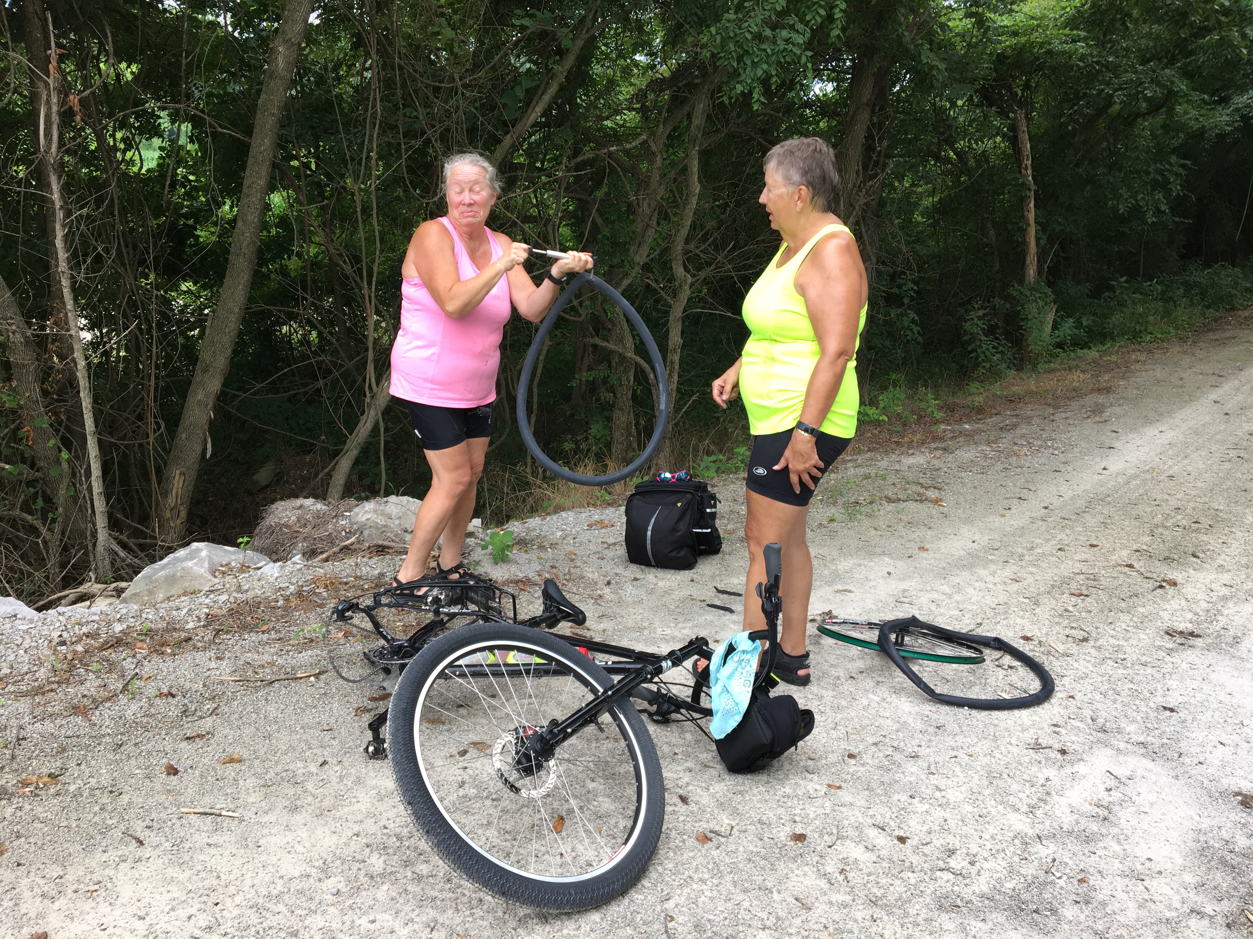 Flat tire #1. Thank goodness Billie and Donna were nearby with their tools, tubes, and expertise. Then along came Brian with a floor size pump and muscles.